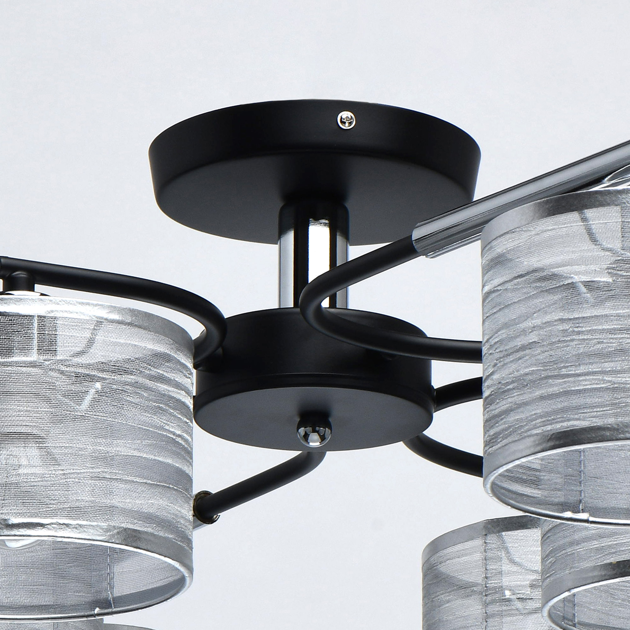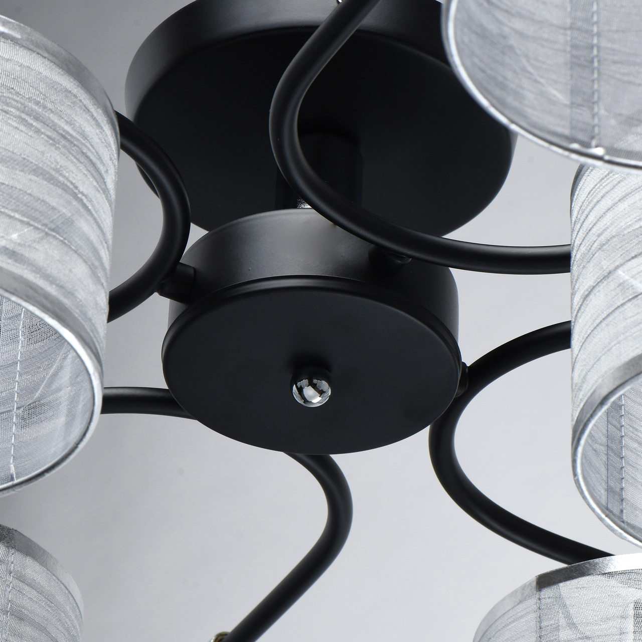 Металлическое основание светильника окрашено в черный цвет. Отдельные элементы основания гальванизированы в цвет хрома. Светильник декорирован двойными текстильными абажурами с термостойким акрилом внутри. Внешний слой из органзы дымчатого цвета. Абажуры прошиты и отделаны кантом.Тип помещения