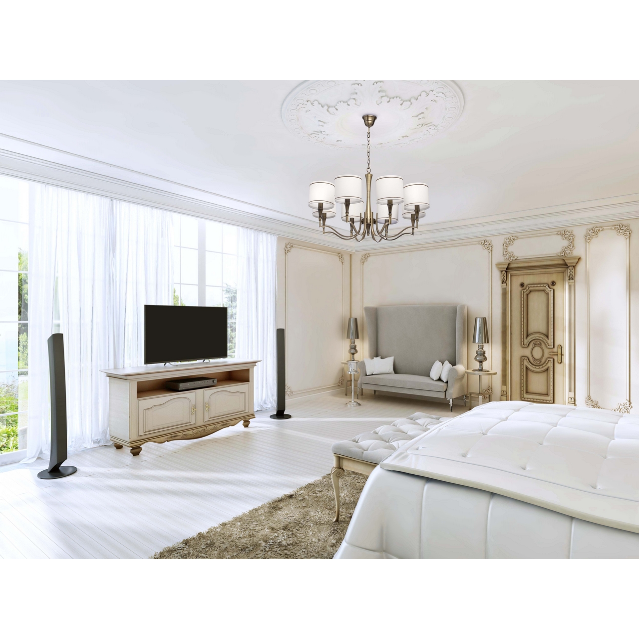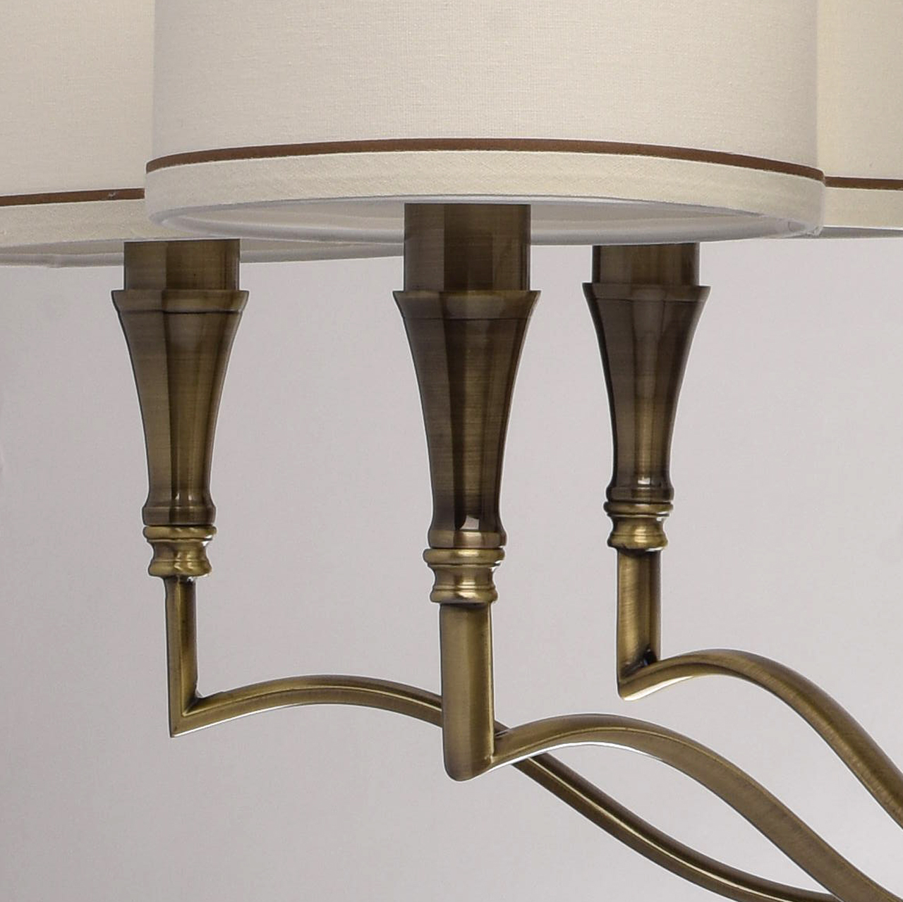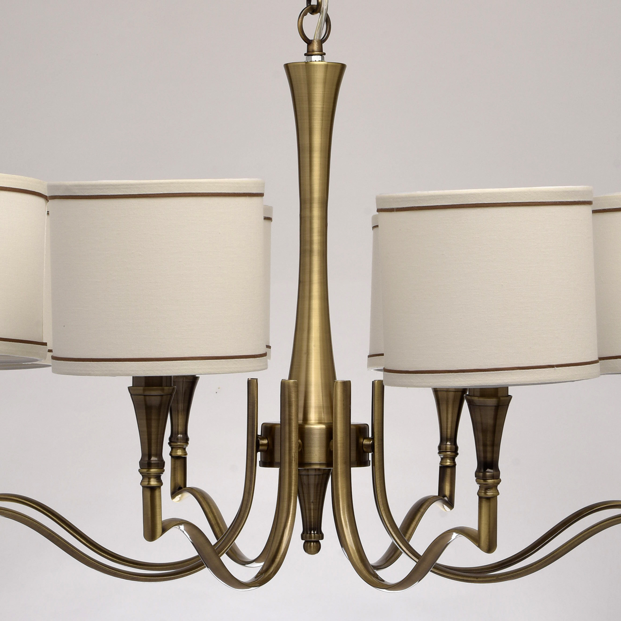 Люстра выполнена в современном классическом стиле. Основание бронзового цвета и тканевые абажуры универсального сливочного оттенка позволяют разместить люстру в интерьер, выполненный в любой цветовой гамме. 2 варианта использования люстры : без абажуров и с ними, дает возможность создавать как яркое освещение так и мягкое рассеяное. Большая семья дает возможность освещать смежные помещения в односм стиле.Стилевые решения интерьера