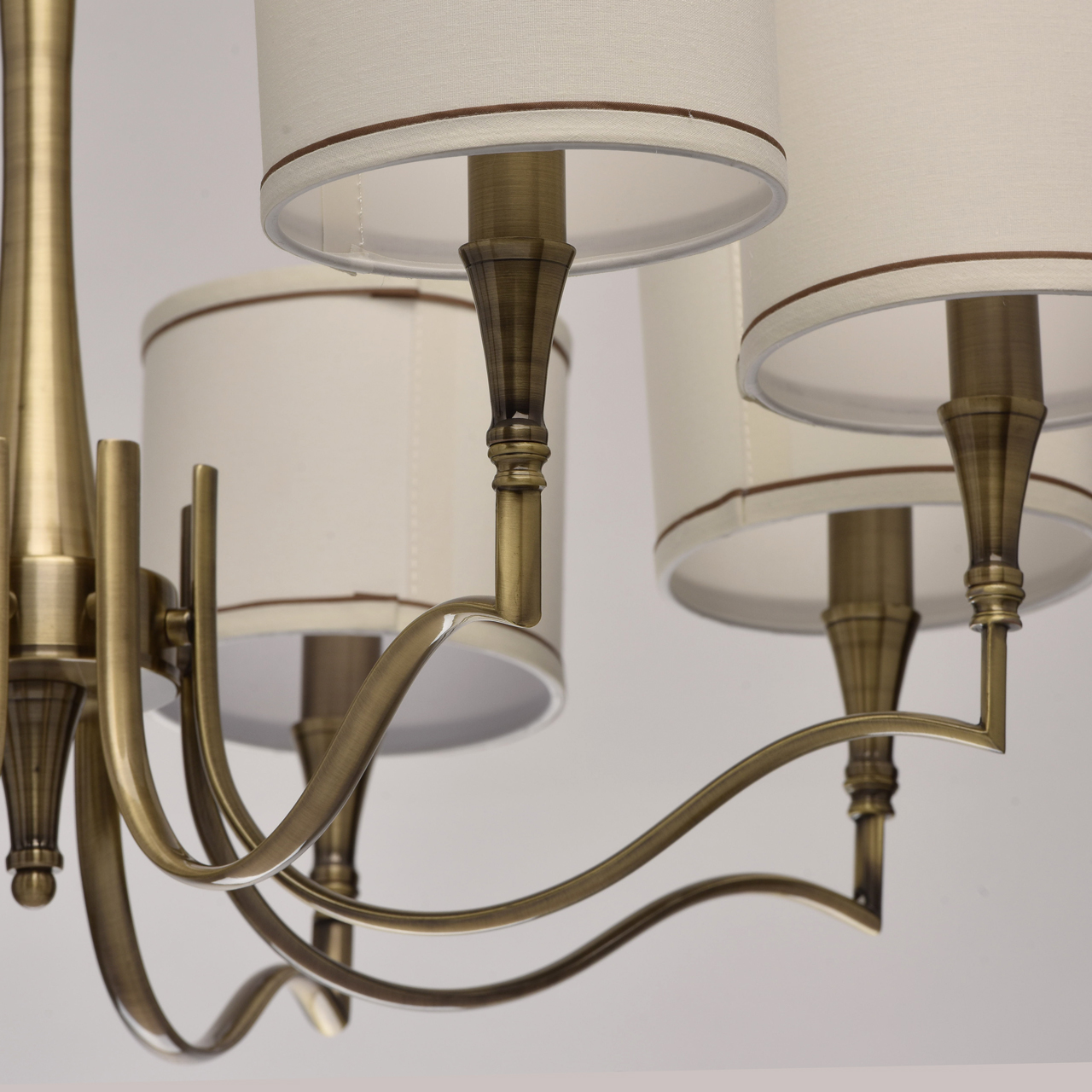 Сложно найти более элегантное решение для интерьера, чем люстра из коллекции «Конрад». Основание из металла благородного цвета античной бронзы плавно переходит в изящно изогнутые рожки. Фактурные тканевые абажуры натурального бежевого оттенка удачно дополняют тон основания, а коричневый кант эффектно завершает композицию. Интересно, что светильник можно использовать и без абажуров: тогда будут видны источники света в виде свечей. Стильная люстра в духе нео-классики будет гармонично смотреться в современном интерьере.Преимущества модели