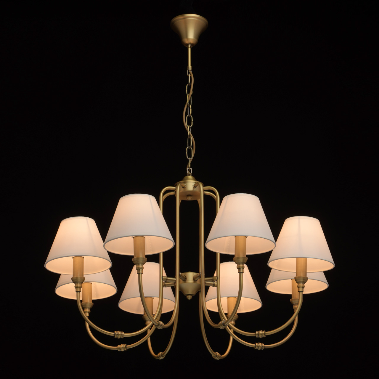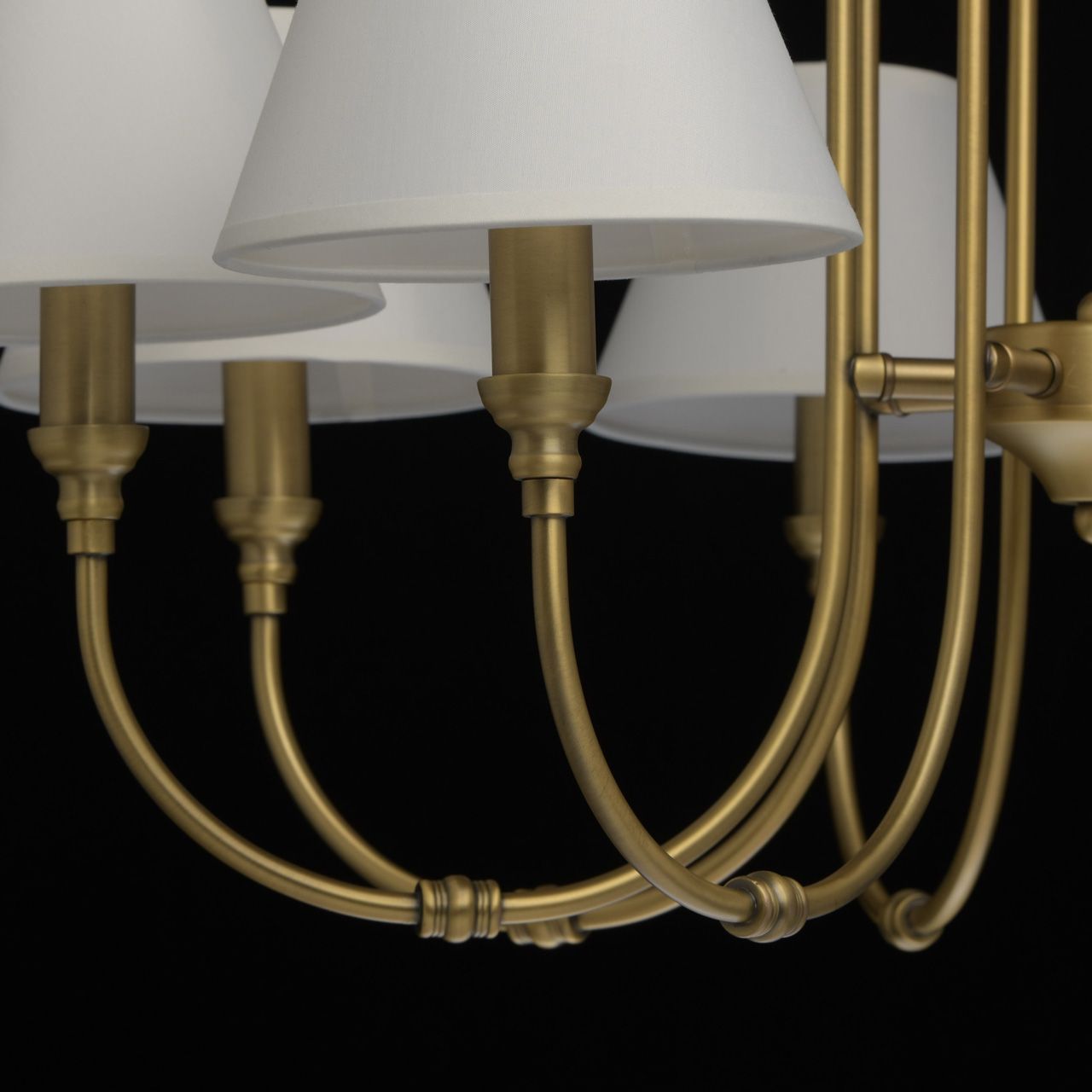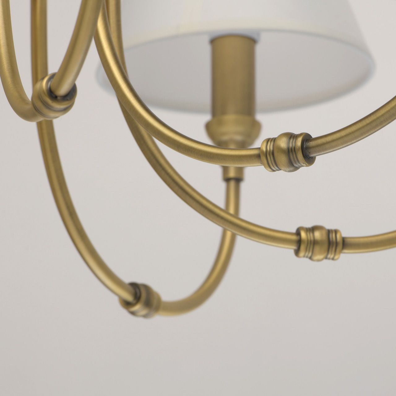 Основание выполнено из сплава металла и гальванизировано в цвет латуни. Потолочная чаша, корпус, декоративные розетки - обработка на токарном станке. Рожки - прокат на роликовом станке. Текстильные абажуры белого цвета с кантом сверху и снизу в цвет абажуров, внутри - термостойкий акрил. Абажуры прошиты.Тип помещения