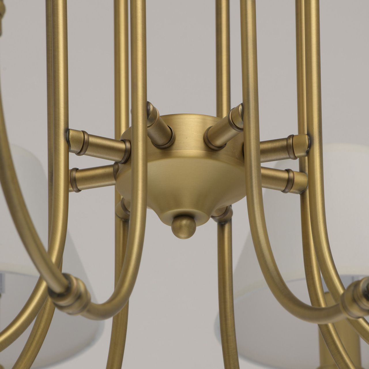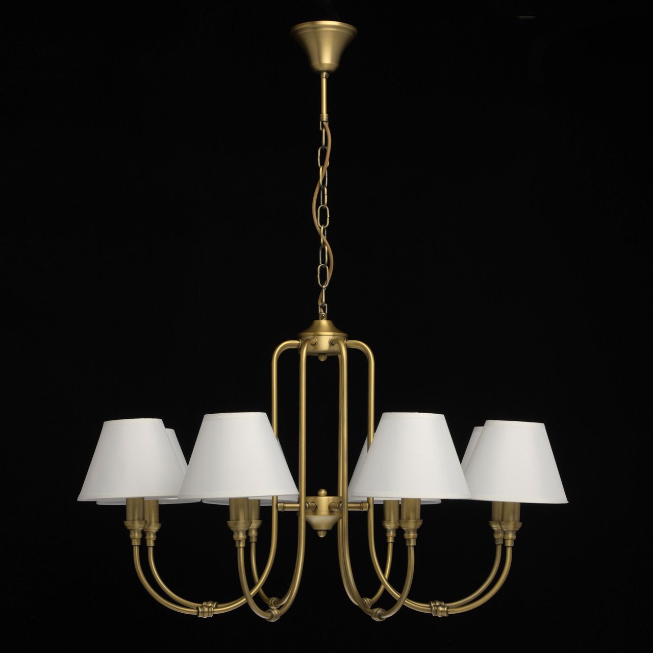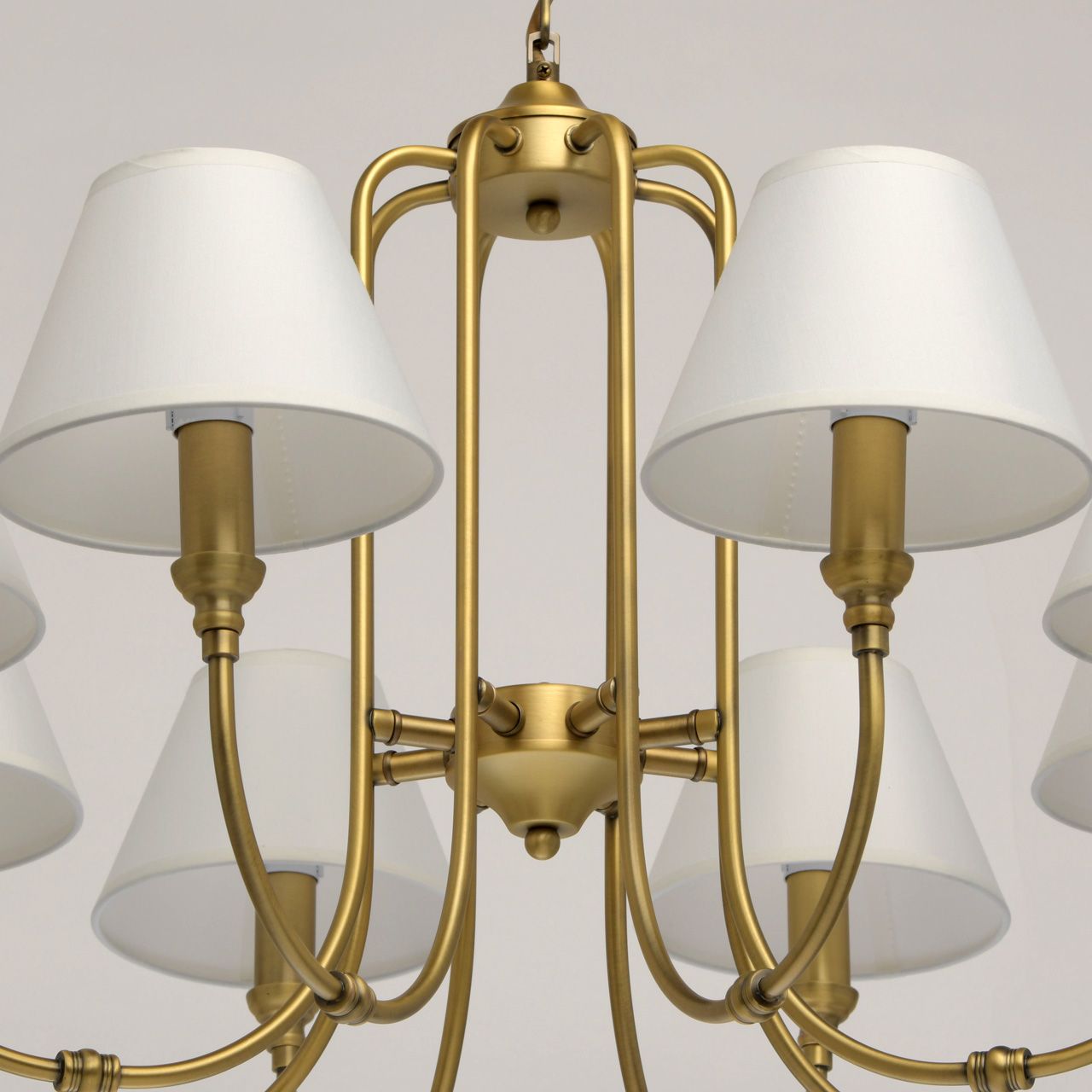 Основание выполнено из сплава металла и гальванизировано в цвет латуни. Потолочная чаша, корпус, декоративные розетки - обработка на токарном станке. Рожки - прокат на роликовом станке. Текстильные абажуры белого цвета с кантом сверху и снизу в цвет абажуров, внутри - термостойкий акрил. Абажуры прошиты.Тип помещения