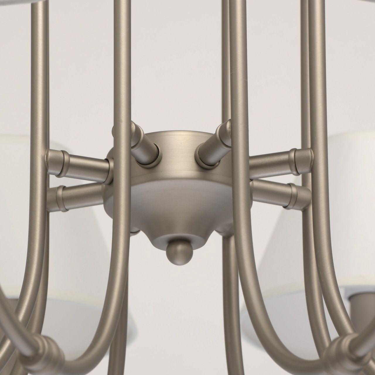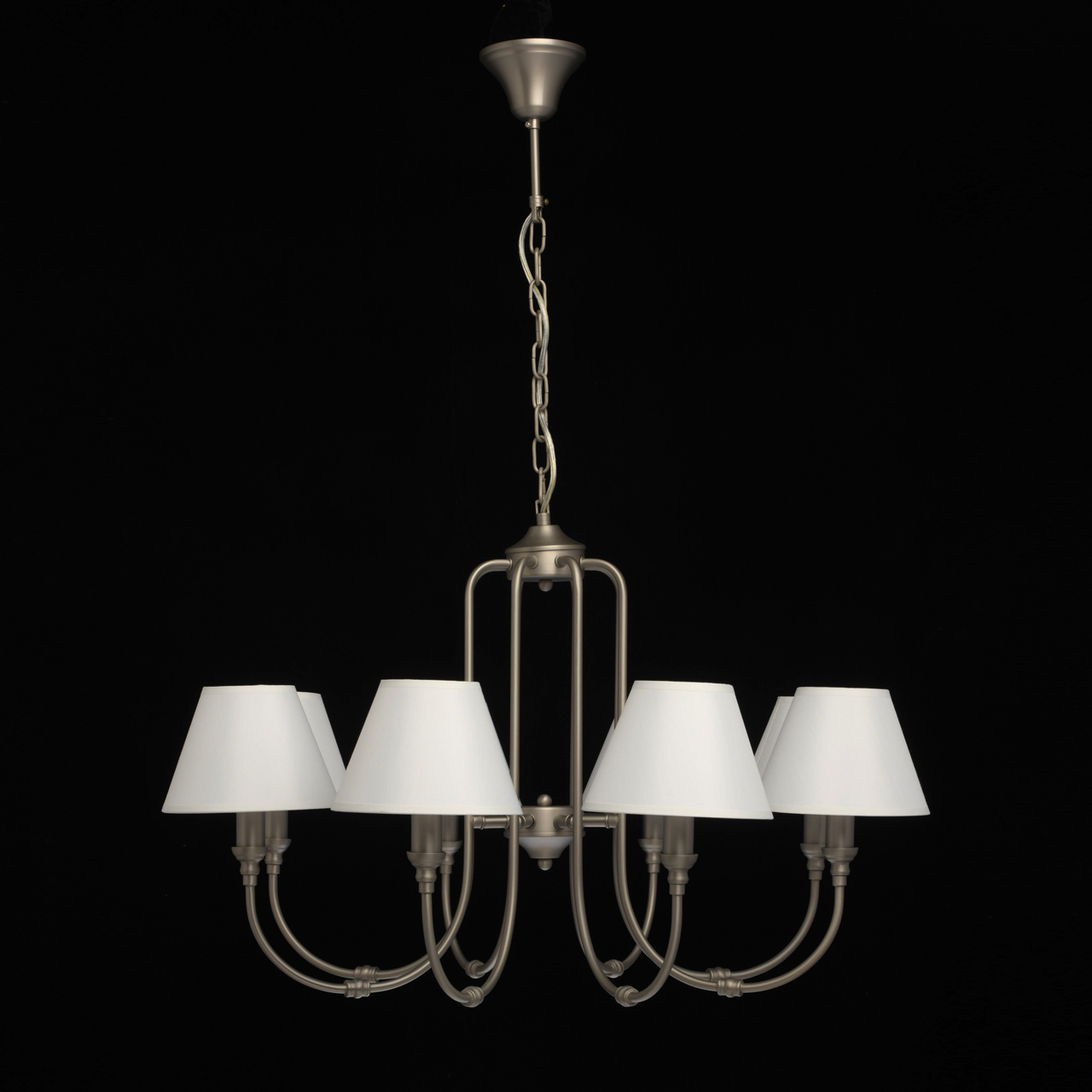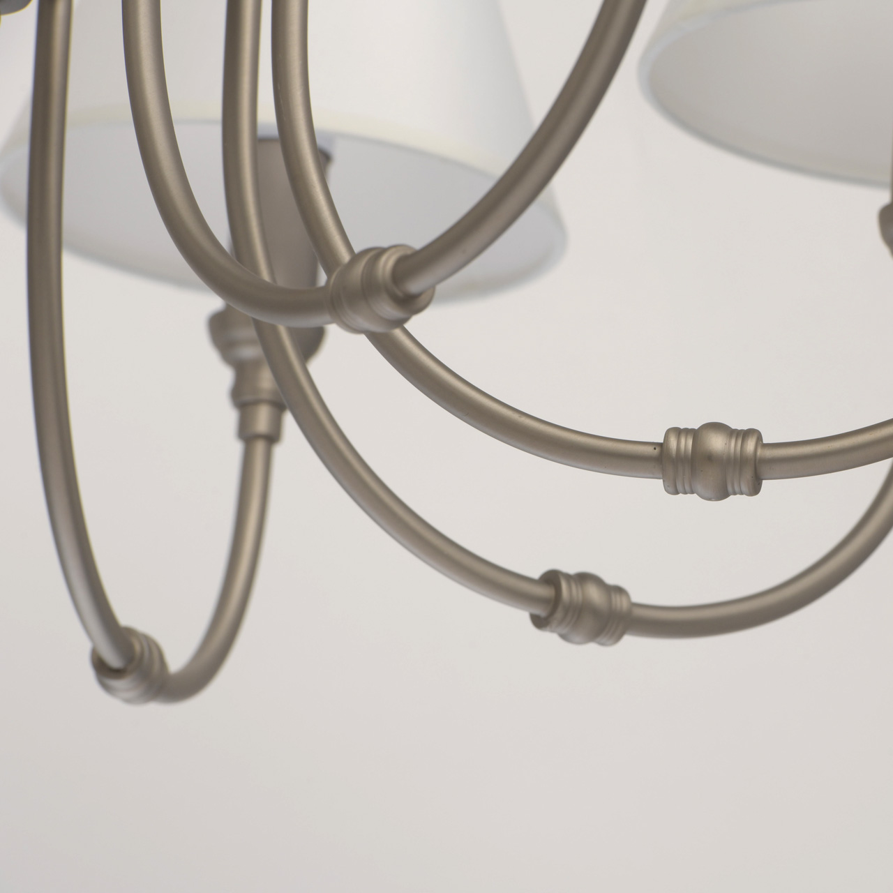 Основание выполнено из сплава металла и гальванизировано в цвет никеля. Потолочная чаша, корпус, декоративные розетки - обработка на токарном станке. Рожки - прокат на роликовом станке. Текстильные абажуры белого цвета с кантом сверху и снизу в цвет абажуров, внутри - термостойкий акрил. Абажуры прошиты.Тип помещения