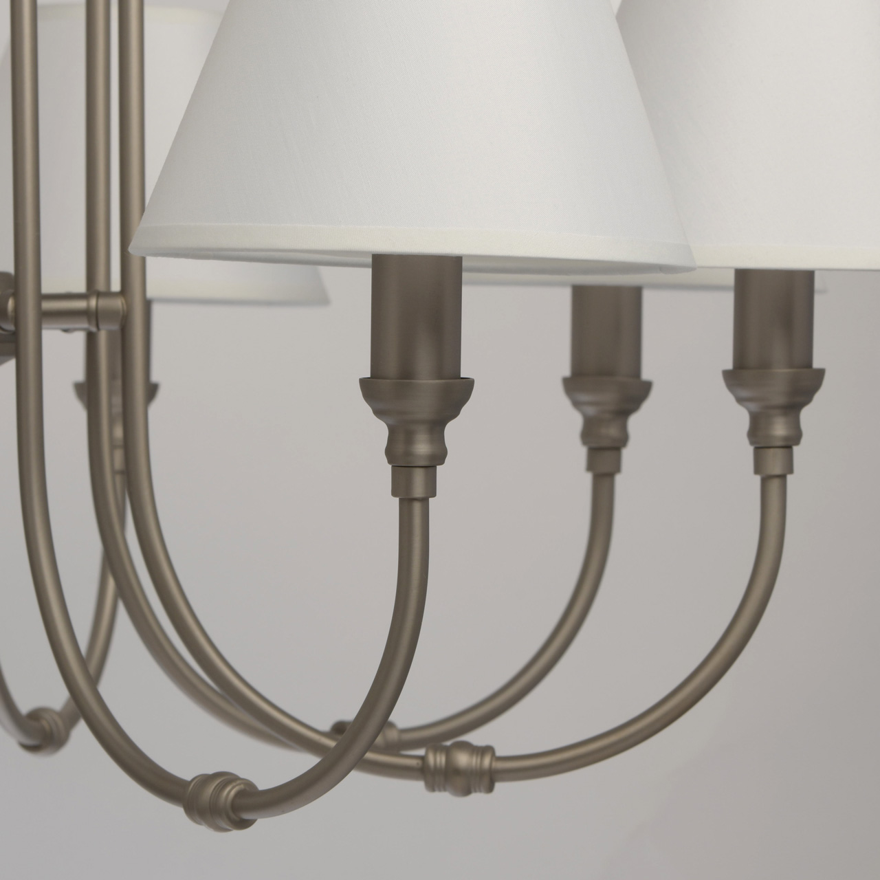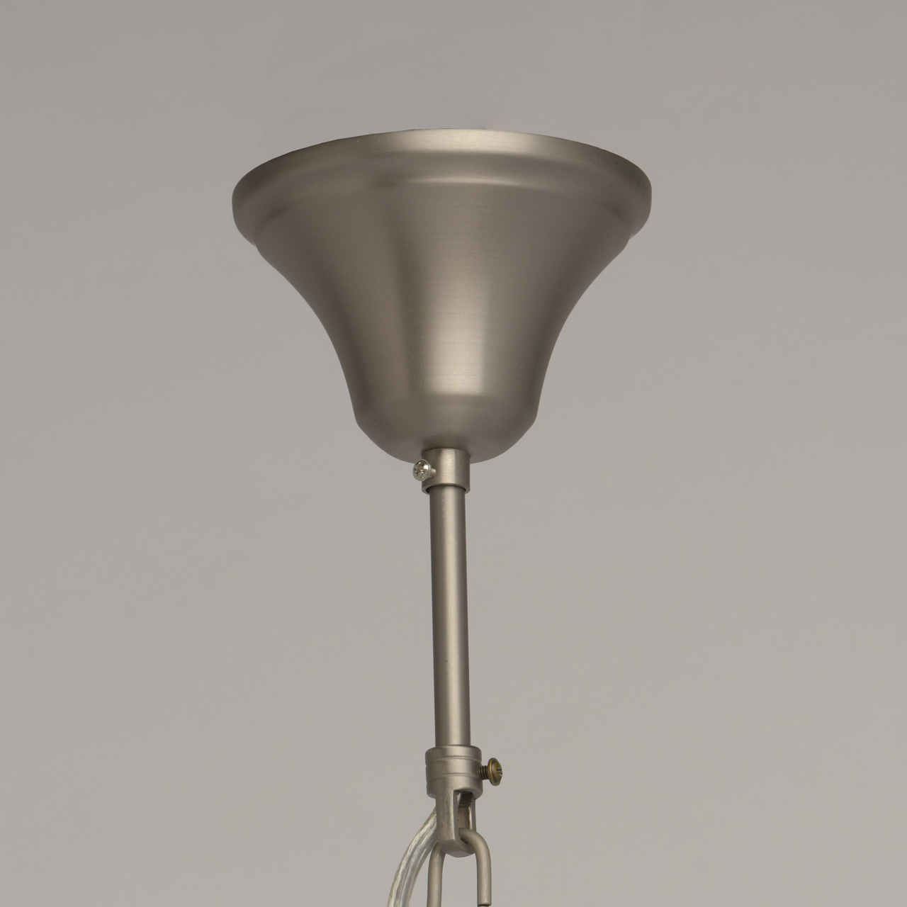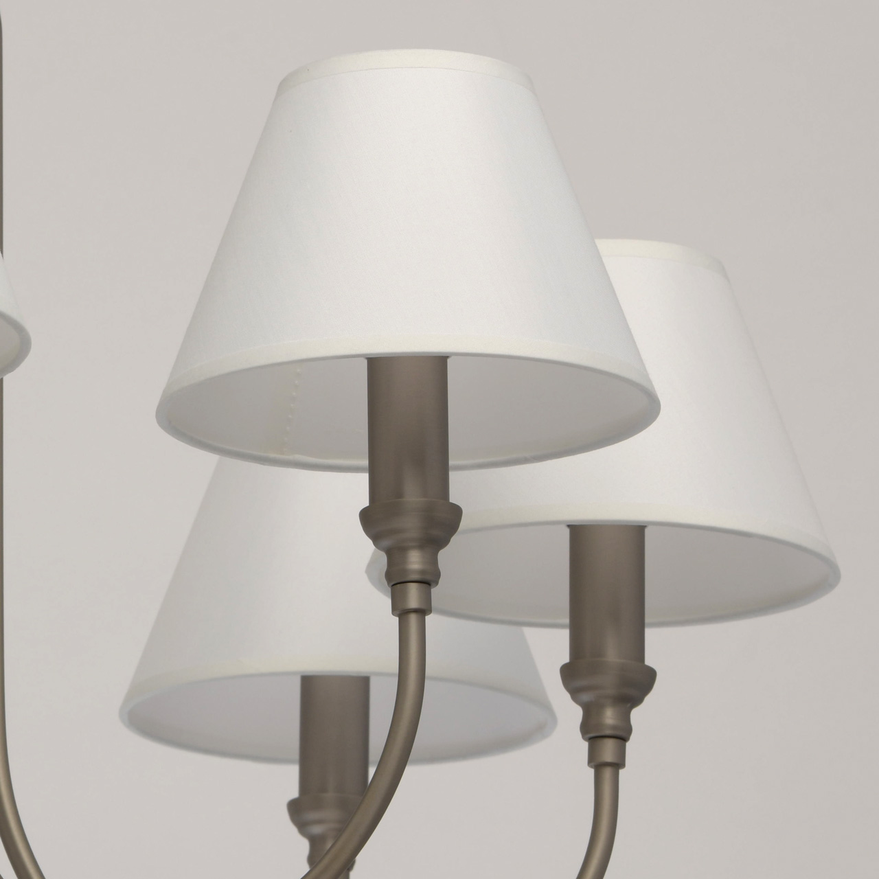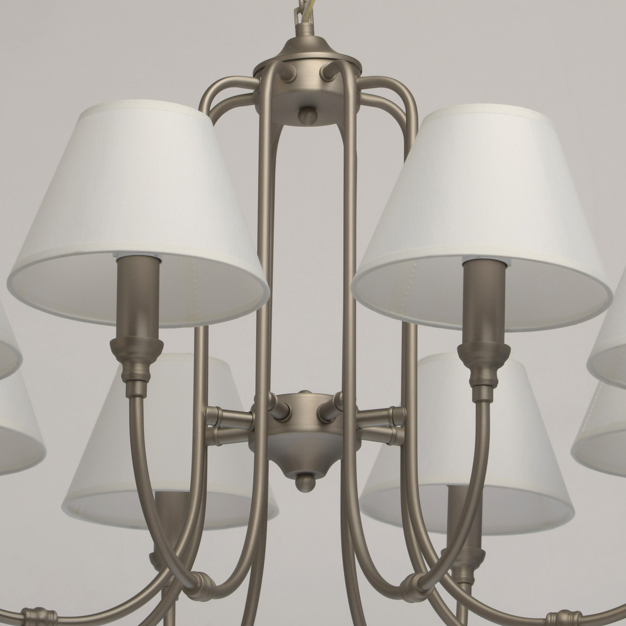 Основание выполнено из сплава металла и гальванизировано в цвет никеля. Потолочная чаша, корпус, декоративные розетки - обработка на токарном станке. Рожки - прокат на роликовом станке. Текстильные абажуры белого цвета с кантом сверху и снизу в цвет абажуров, внутри - термостойкий акрил. Абажуры прошиты.Тип помещения
