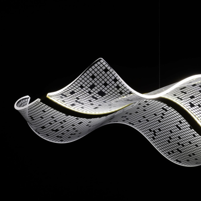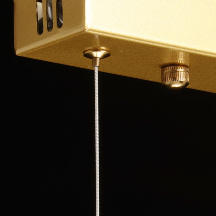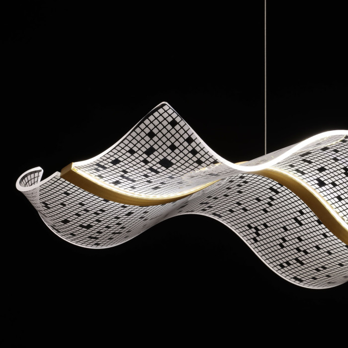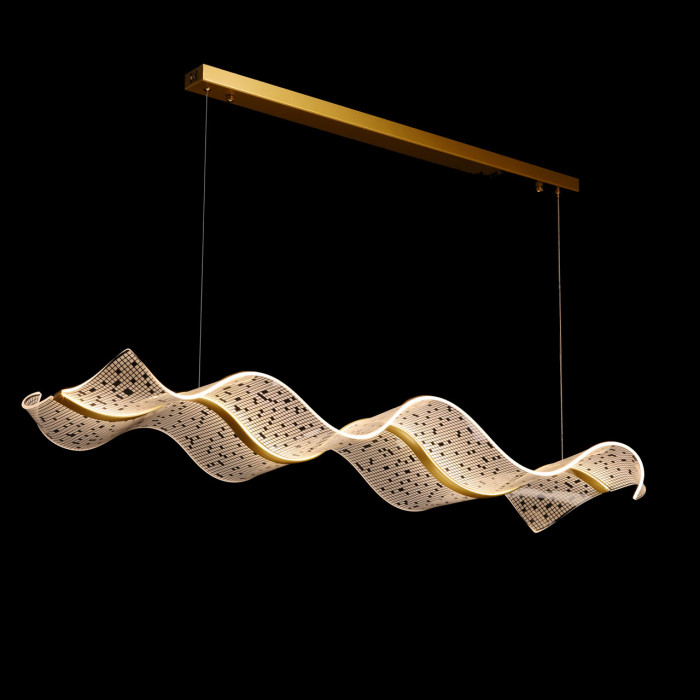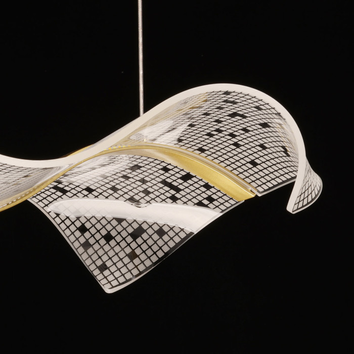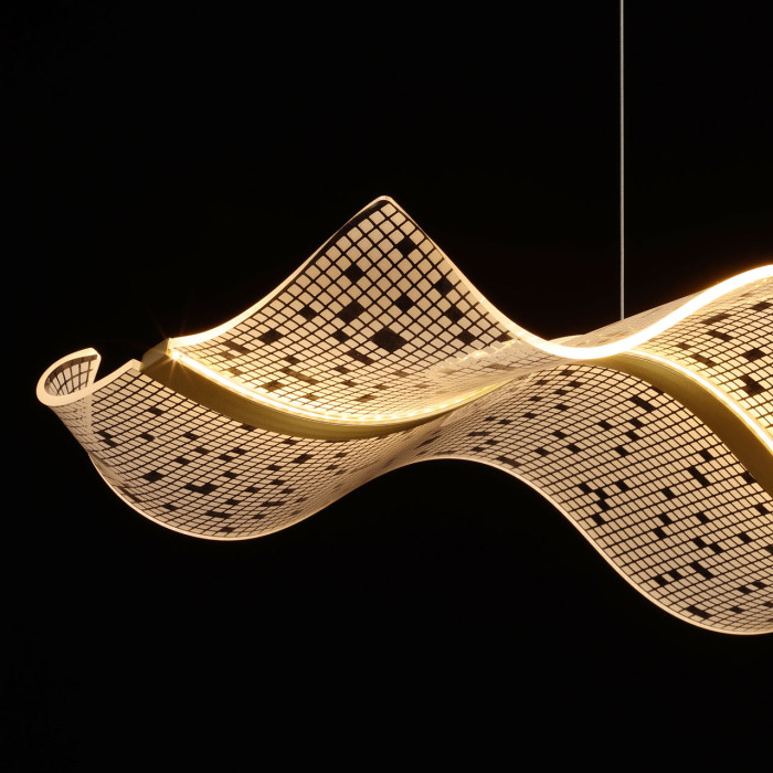 Благородный цвет латуни эффектно сочетается с минималистичным дизайном подвесной люстры. Материал корпуса плафона эффективно отводит тепло от светодиодов, продлевая их срок службы. Оригинальный плафон в виде волны из прозрачного акрила с ячеистым рисунком обеспечивает приятное и равномерное освещение. Многорежимность освещения от 3000К до 6000К позволяет подобрать комфортную температуру света. Качественные светодиоды экономичны и безопасны. Возможность регулировать комфортную высоту.Металлическое основание подвесной люстры гальванизировано в цвет латуни. Корпус плафона выполнен из сплава алюминия с цинком и гальванизирован в цвет основания. Светодиодный источник света закрыт прозрачным акрилом с ячеистым рисунком.