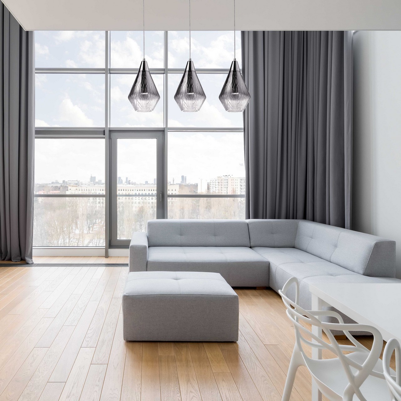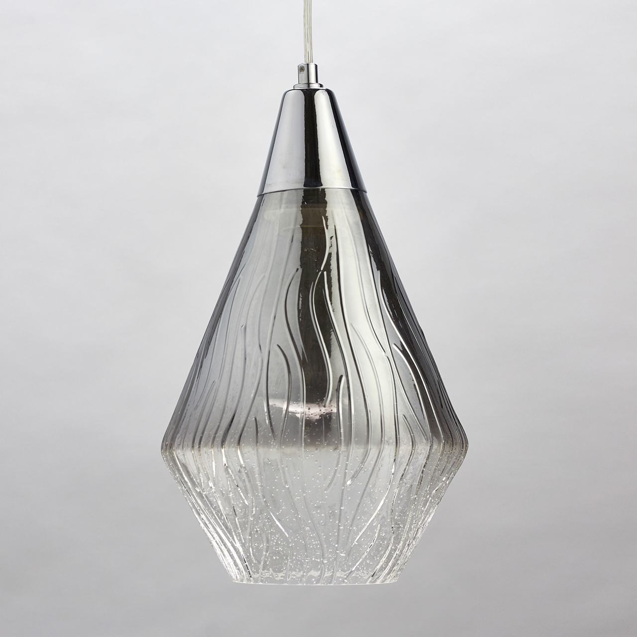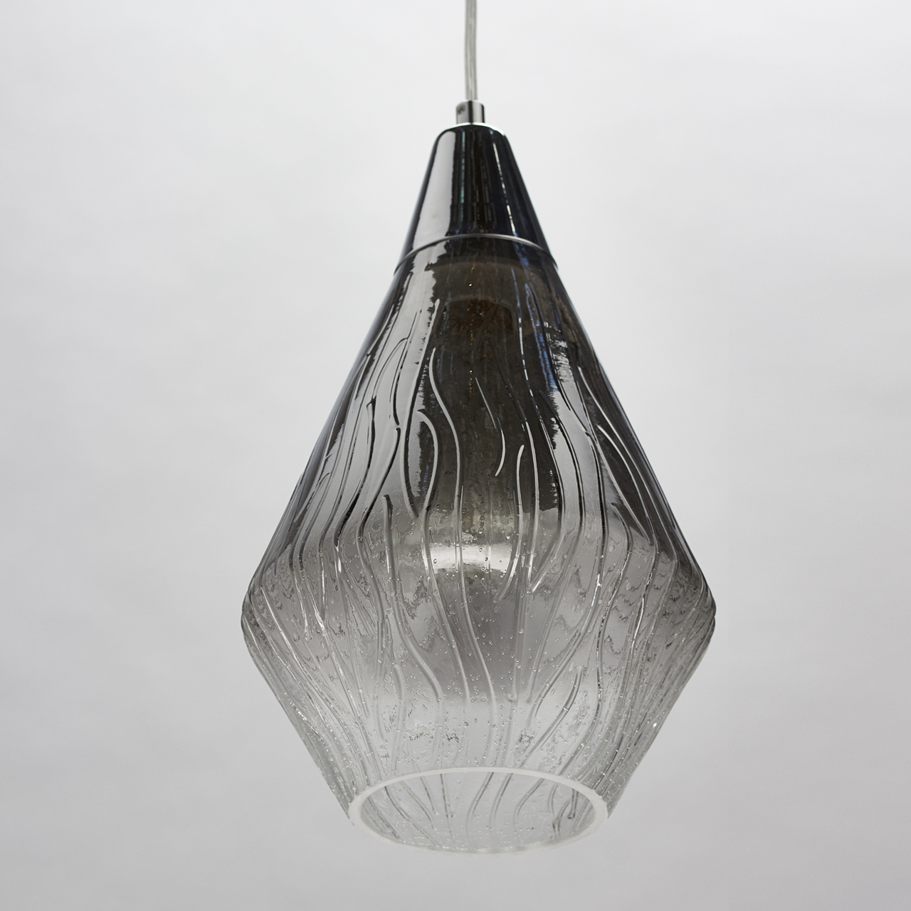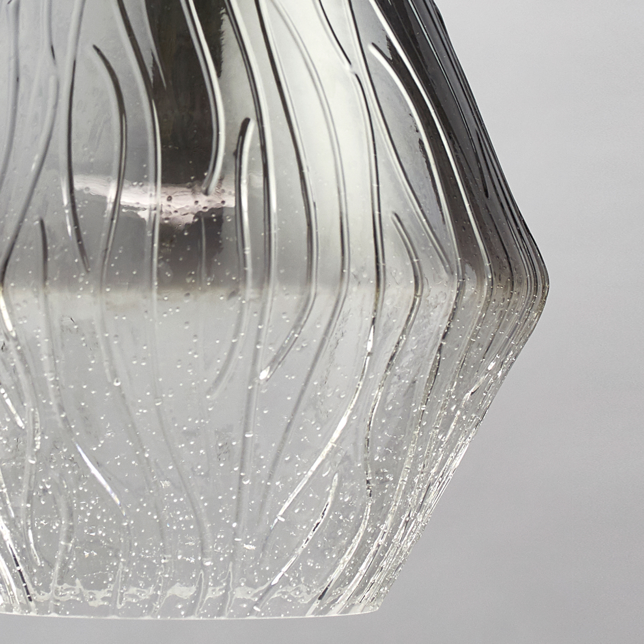 Фактурный стеклянный плафон с эффектом дождевых струй Атмосферный свет за счет гальванического покрытия плафона. Вариативность композиций из нескольких разноуровневых подвесов разных цветов. Оптимальная длина 1,5 м для зонального освещения.Стилевые решения интерьера