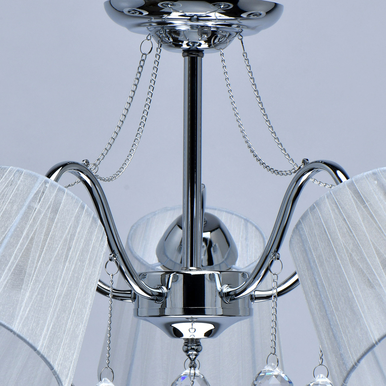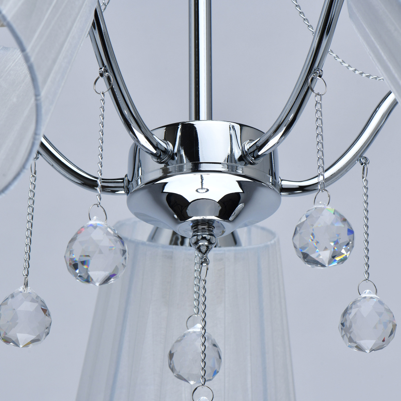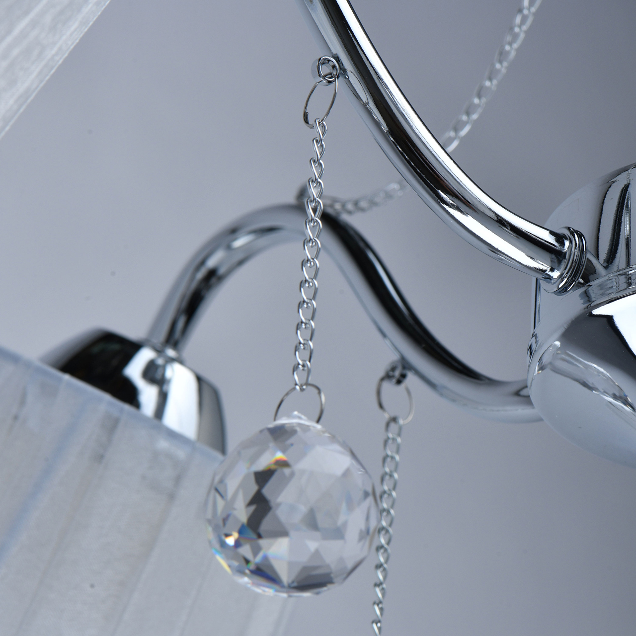 Основание светильника выполнено из сплава металла и гальванизировано в цвет хрома. Абажуры из прозрачной органзы белого цвета с термостойким акрилом внутри. Абажуры отделаны кантом сверху и снизу, прошиты. Светильник декорирован металлическими цепочками в цвет основания и прозрачным хрусталем в форме шара.Тип помещения