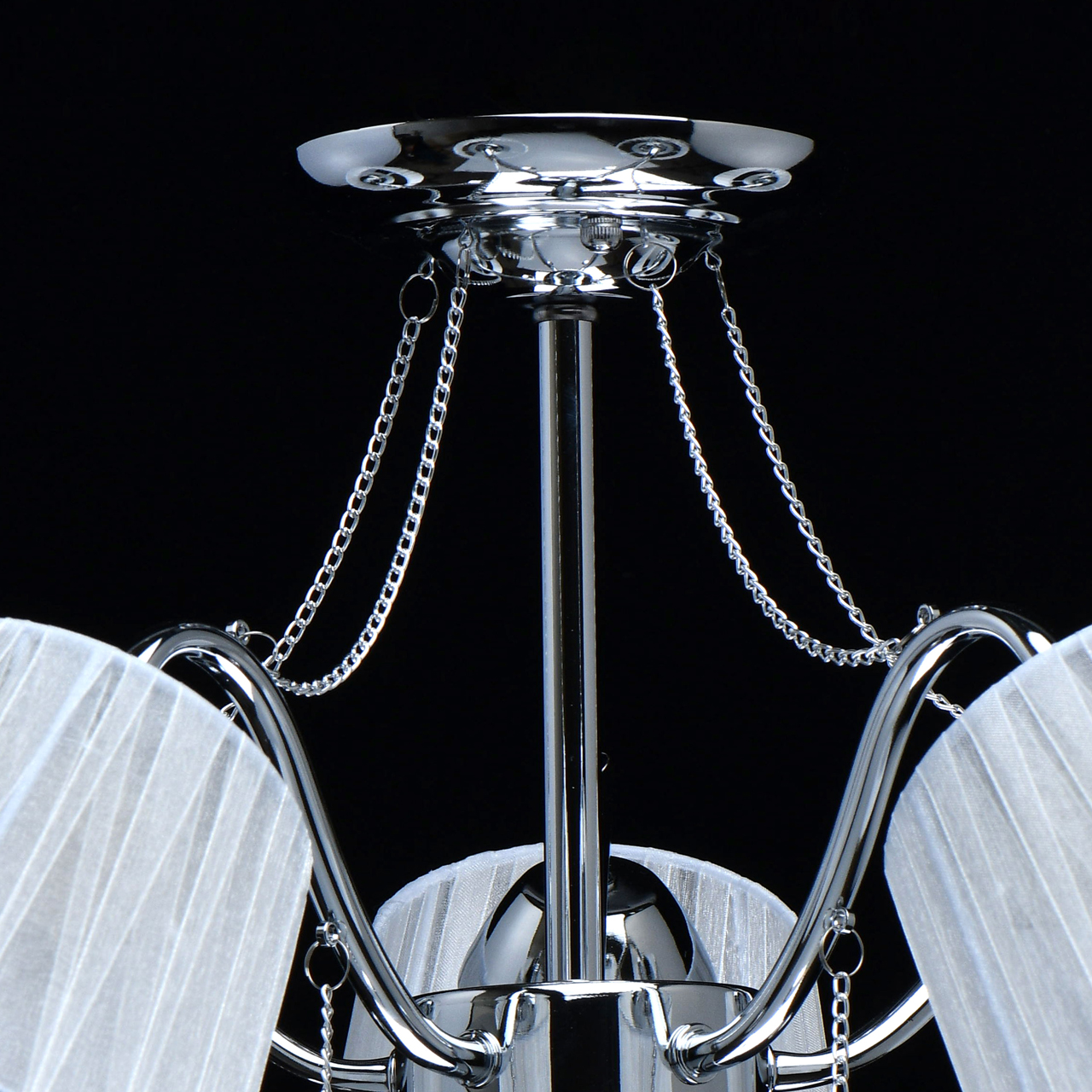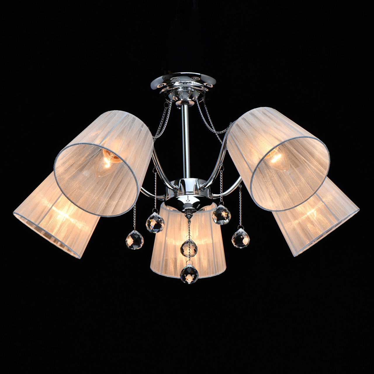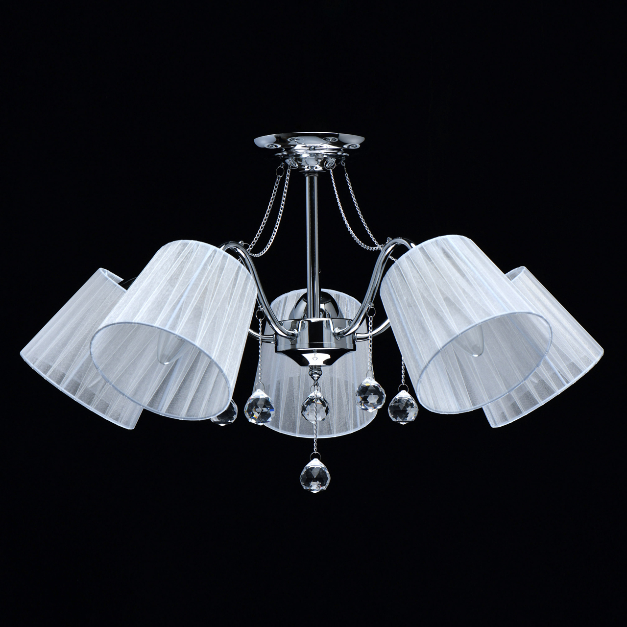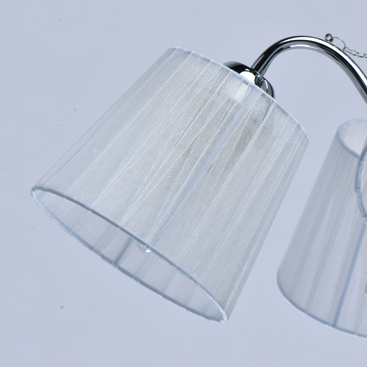 Основание светильника выполнено из сплава металла и гальванизировано в цвет хрома. Абажуры из прозрачной органзы белого цвета с термостойким акрилом внутри. Абажуры отделаны кантом сверху и снизу, прошиты. Светильник декорирован металлическими цепочками в цвет основания и прозрачным хрусталем в форме шара.Тип помещения