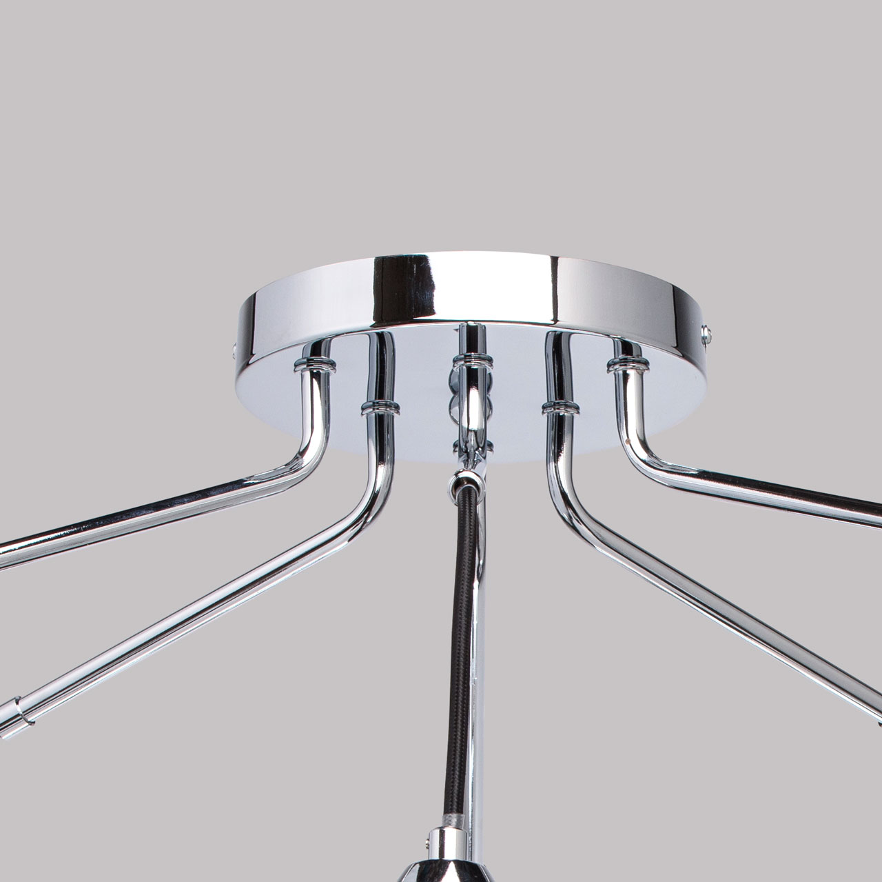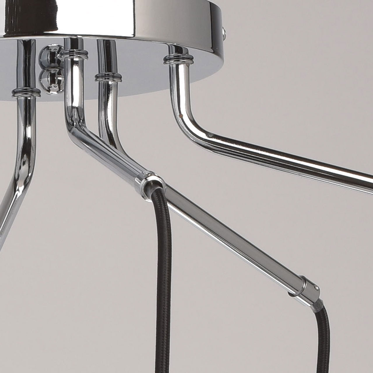 Оригинальные детали, современный дизайн и неповторимый модерновый стиль – всё это выгодно отличает люстру из коллекции «Лацио» от других моделей. Хромированное металлическое основание дополнено рожками в тон, плавно переходящими в декоративные шнуры в чёрной оплетке. Под стать сдержанным элементам – текстильные абажуры матового чёрного оттенка, украшенные внутри акриловой вставкой цвета хрома с зеркальным эффектом. Их высоту можно менять, что делает люстру не только стильной, но и удобной.Преимущества модели