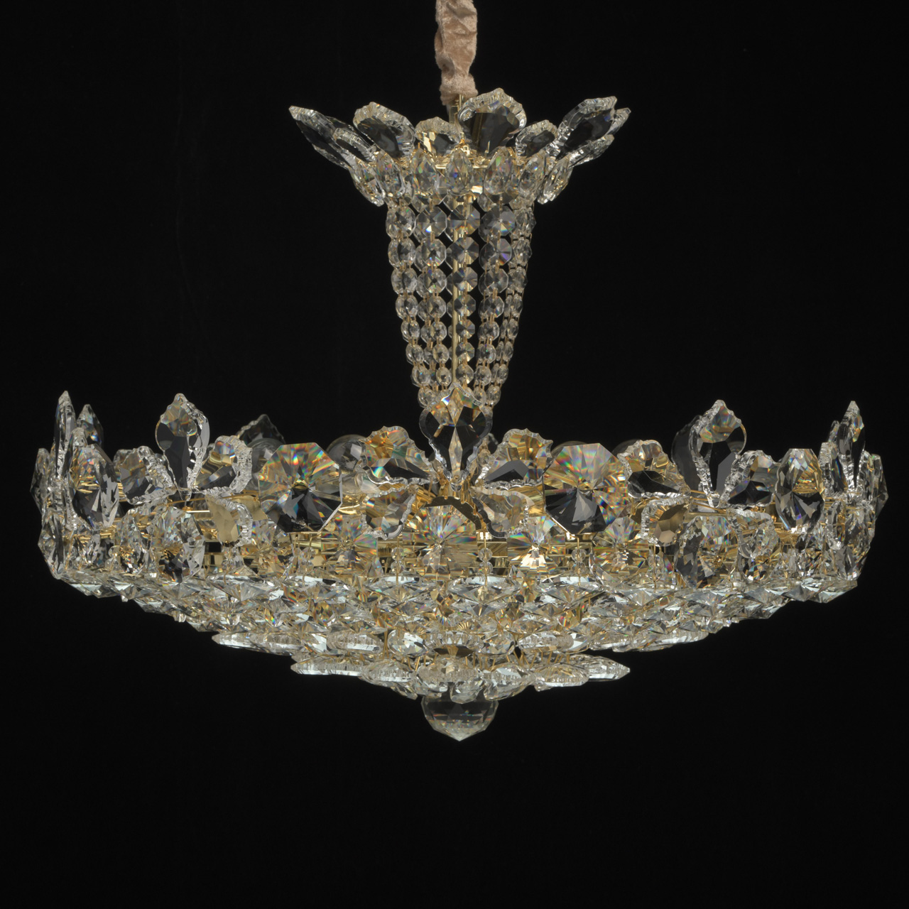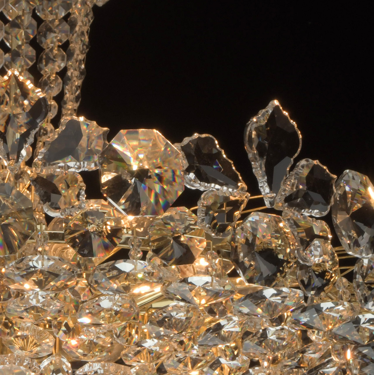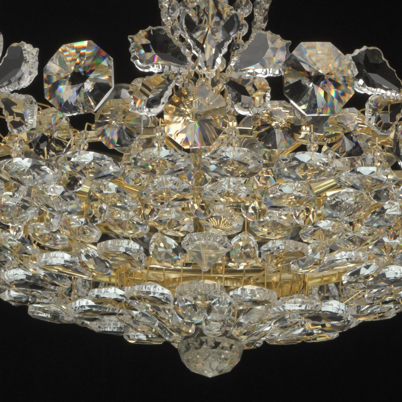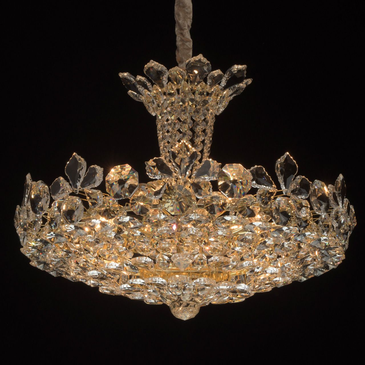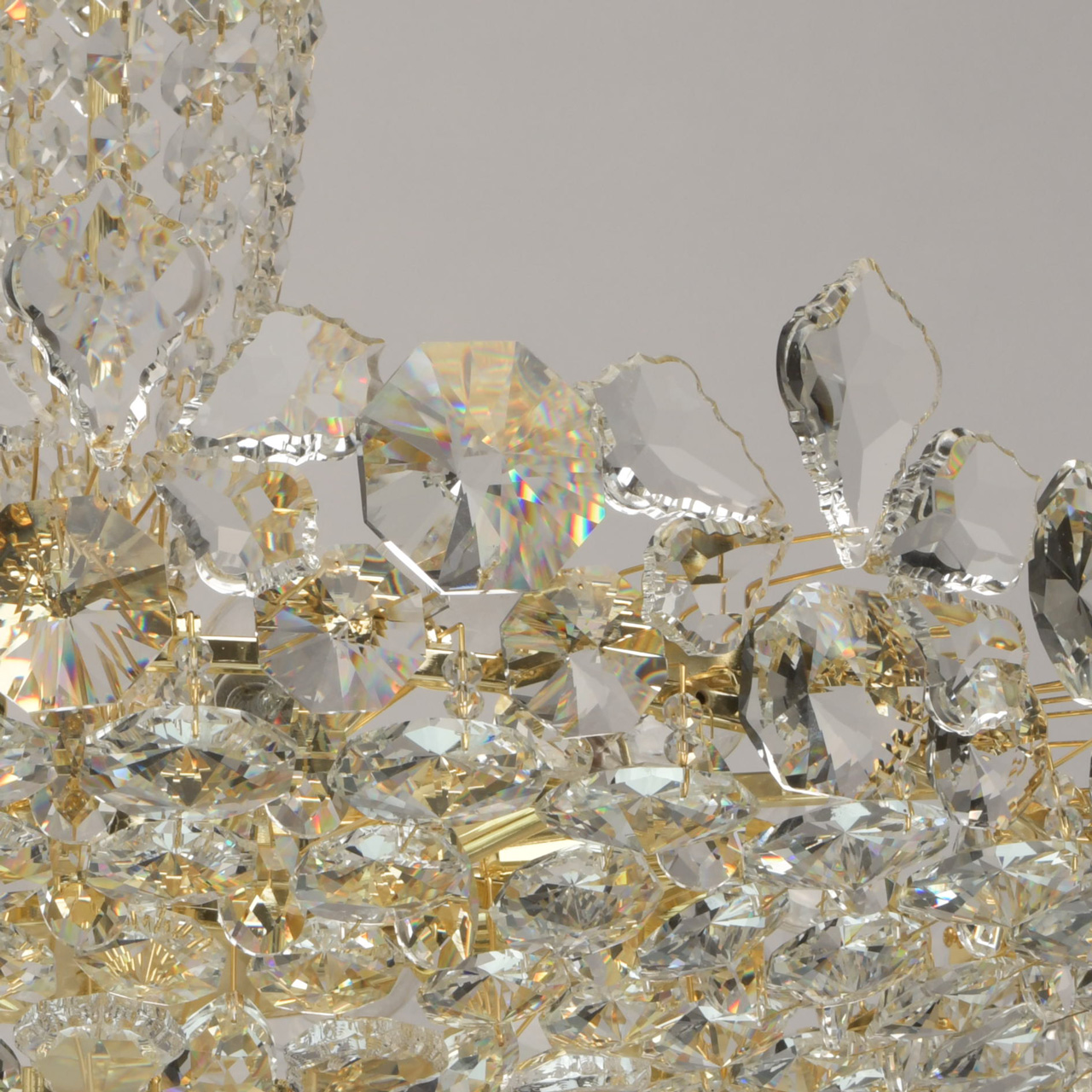 Основание выполнено из металла, гальванизировано в цвет самородного золота. Потолочная чаша: обработка на токарном станке. Светильник декорирован прозрачным хрусталем высшей категории формы дубовый лист, миндаль, октагон, шар.Тип помещения