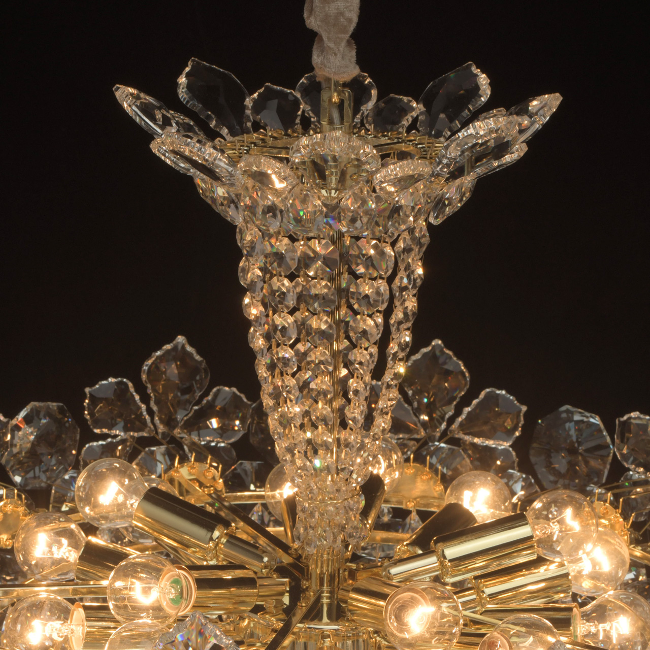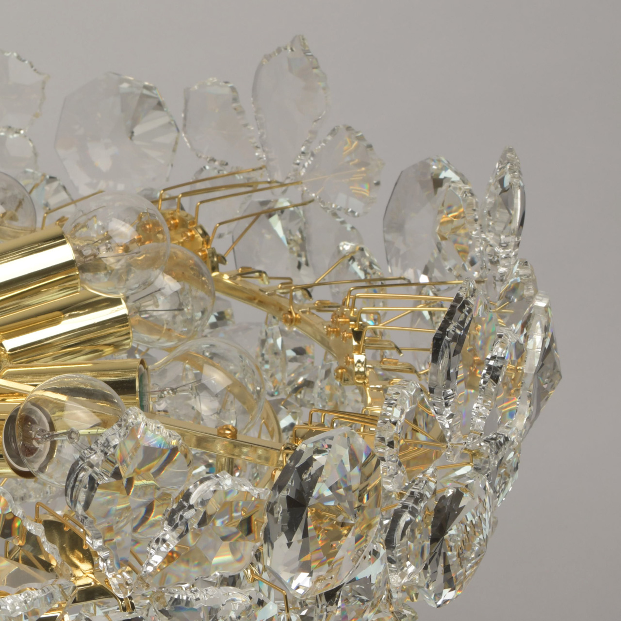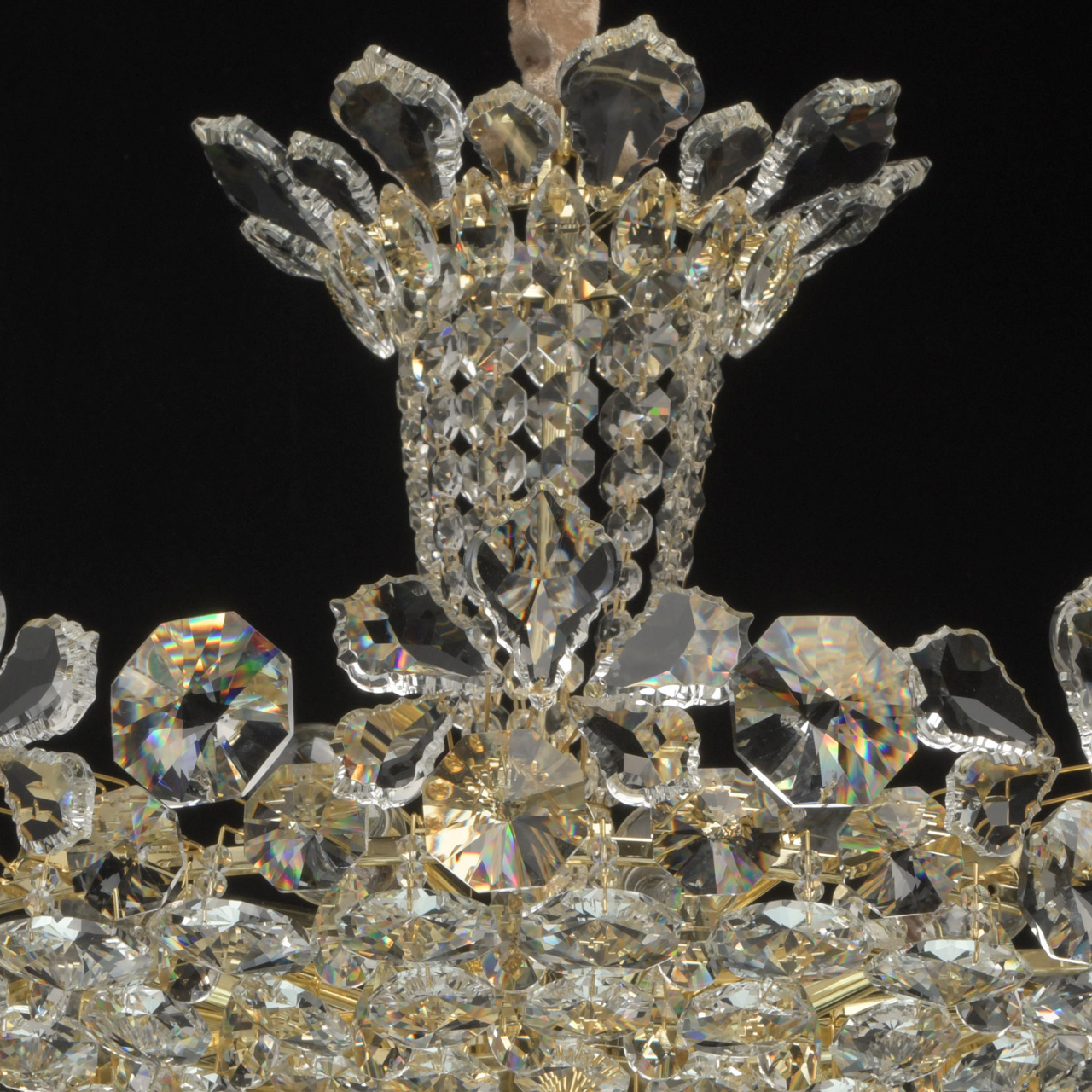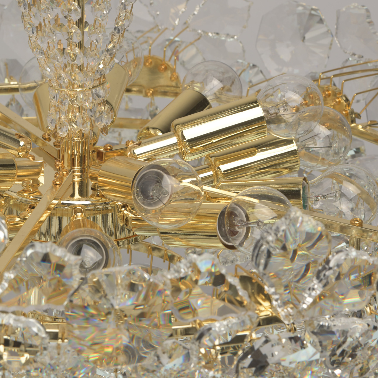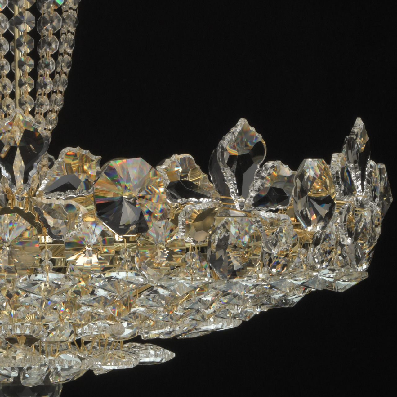 Основание выполнено из металла, гальванизировано в цвет самородного золота. Потолочная чаша: обработка на токарном станке. Светильник декорирован прозрачным хрусталем высшей категории формы дубовый лист, миндаль, октагон, шар.Тип помещения