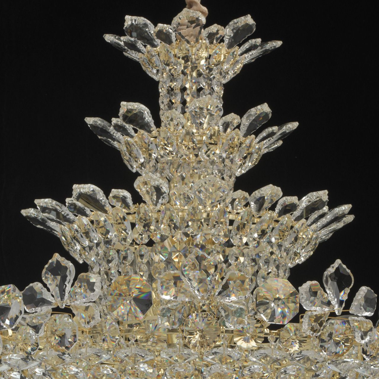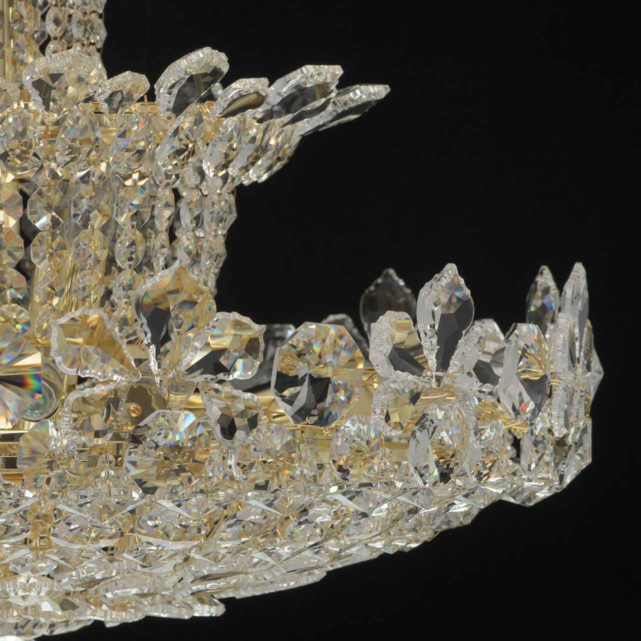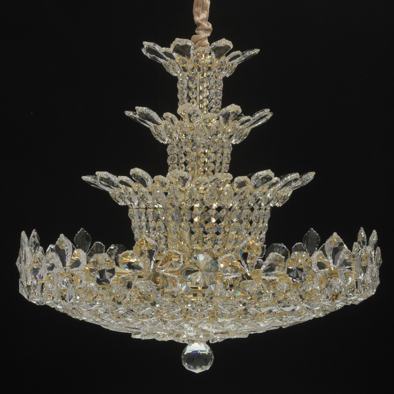 Роскошная люстра из коллекции «Лаура» напоминает великолепный драгоценный цветок. Металлическое основание светильника создает гармоничный дуэт с многоуровневой хрустальной композицией, выполненной в двух вариациях: прозрачной и оттенка шампань. Крупный хрусталь различной формы огранки создает неповторимую игру света, а оригинальное ярусное решение делает светильник особенно величественным и эффектным. Модель идеально подойдет для богатой обстановки с высокими потолками, оформленной в стиле классика, ампир.Преимущества модели