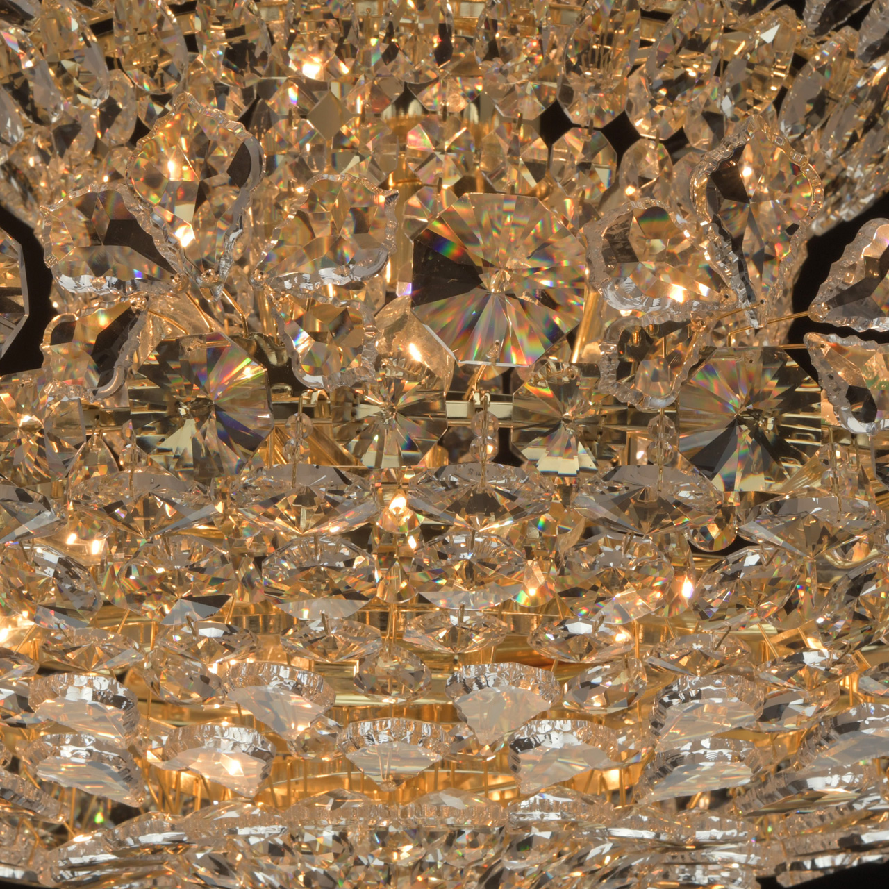 Основание выполнено из металла, гальванизировано в цвет самородного золота. Потолочная чаша: обработка на токарном станке. Светильник декорирован прозрачным хрусталем высшей категории формы дубовый лист, миндаль, октагон, шар.Тип помещения