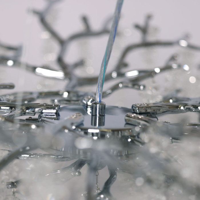 Современный дизайн с природными мотивами. Трендовая флористика, природа в доме. Декор в виде гроздьев из прозрачного хрусталя придает светильнику индивидуальность и создает эффектную игру света. Заменяемые источники света удобны в эксплуатации. Возможность регулировать комфортную высоту.Основание подвесной люстры выполнено по технологии художественного литья из сплава алюминия с цинком и гальванизировано в цвет хрома. Потолочная чаша закрыта фактурным художественным литьем. Люстра декорирована гроздьями из прозрачного хрусталя.