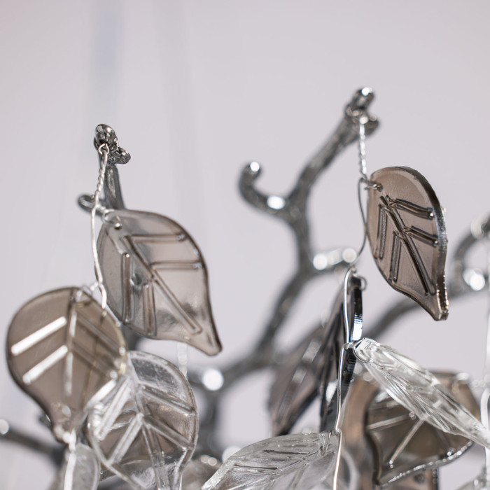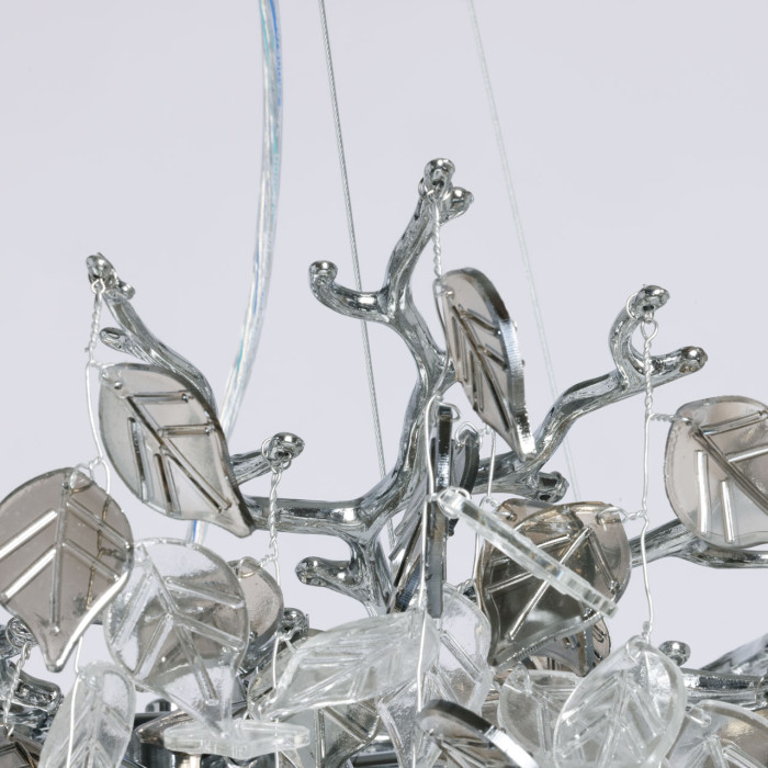 Современный дизайн с природными мотивами. Трендовая флористика, природа в доме. Декор в форме листьев из прозрачного и дымчатого стекла придает светильнику индивидуальность. Заменяемые источники света удобны в эксплуатации. Возможность регулировать комфортную высоту.Основание подвесной люстры выполнено по технологии художественного литья из сплава алюминия с цинком и гальванизировано в цвет хрома. Потолочная чаша закрыта фактурным художественным литьем. Люстра декорирована подвесками из прозрачного и гальванизированного в дымчатый цвет стекла в форме листьев.