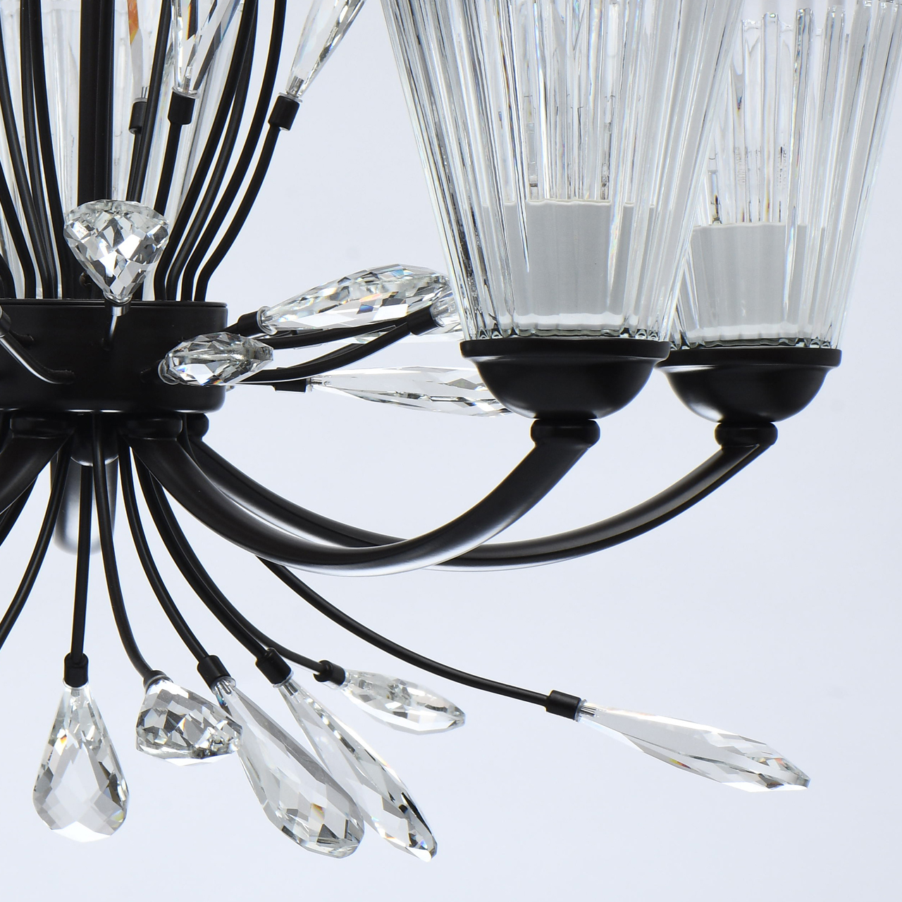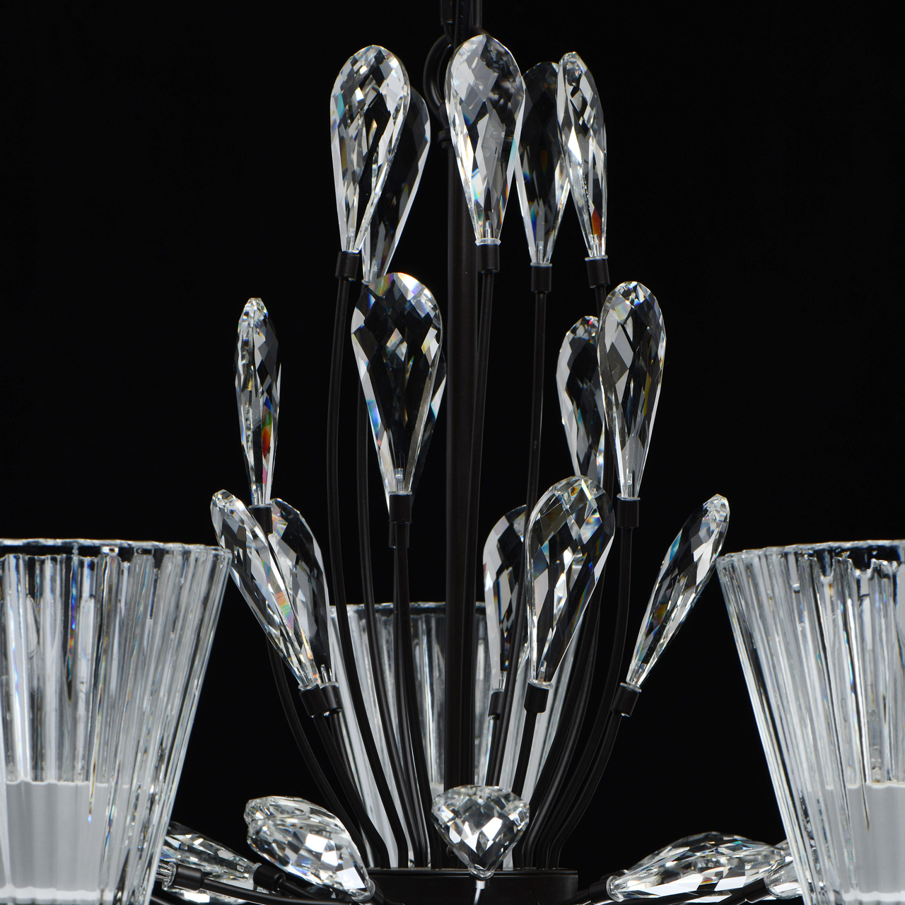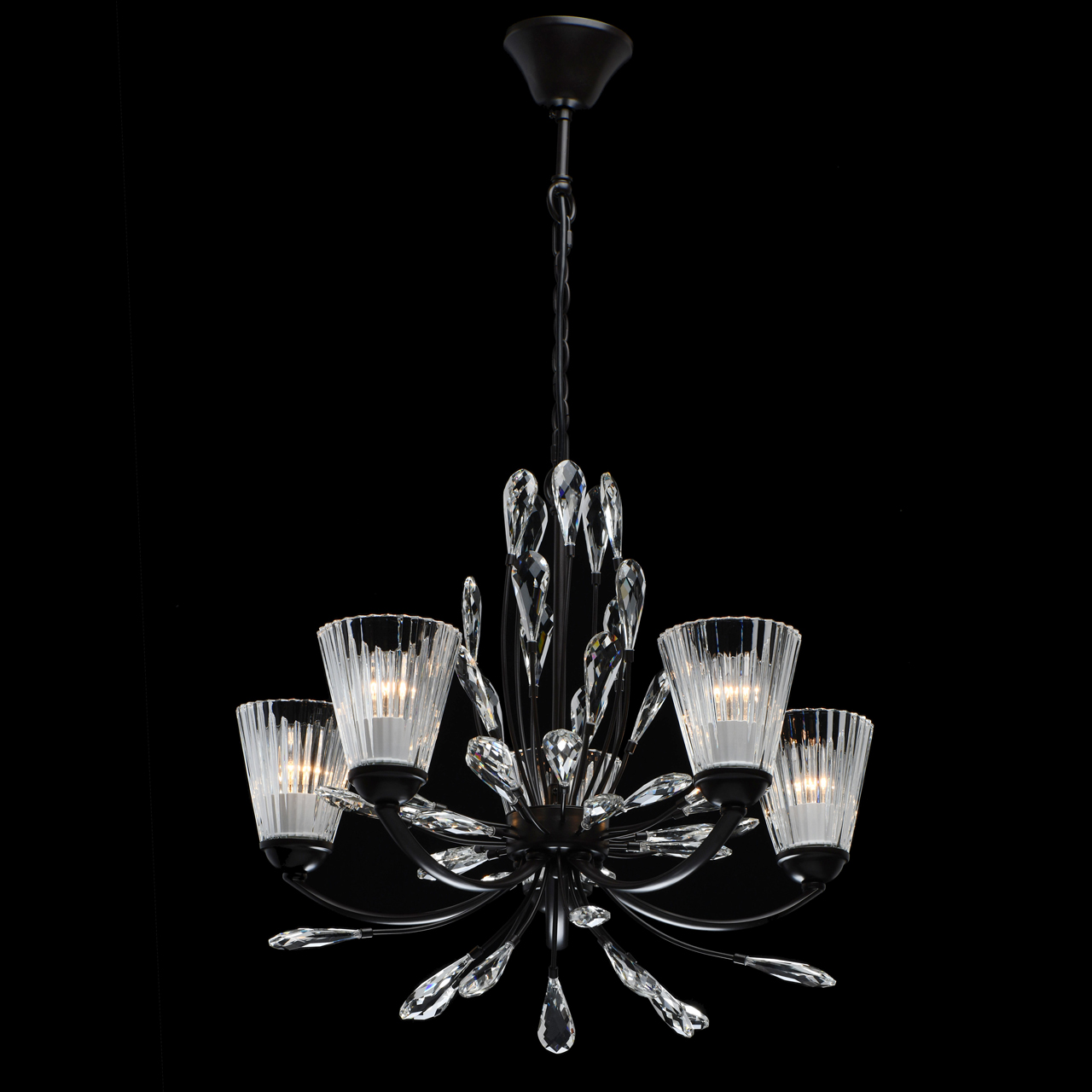 Современный флористический дизайн в тренде. Декор из крупного хрусталя особой формы придает модели легкости. Фактурные плафоны из стекла обеспечивают комфортный свет. Регулируемая высота за счет звеньев цепи. Заменяемые традиционные источники света удобны в эксплуатации. Полная семья из бра, потолочных люстр на 5 и 8 ламп.Стилевые решения интерьера
