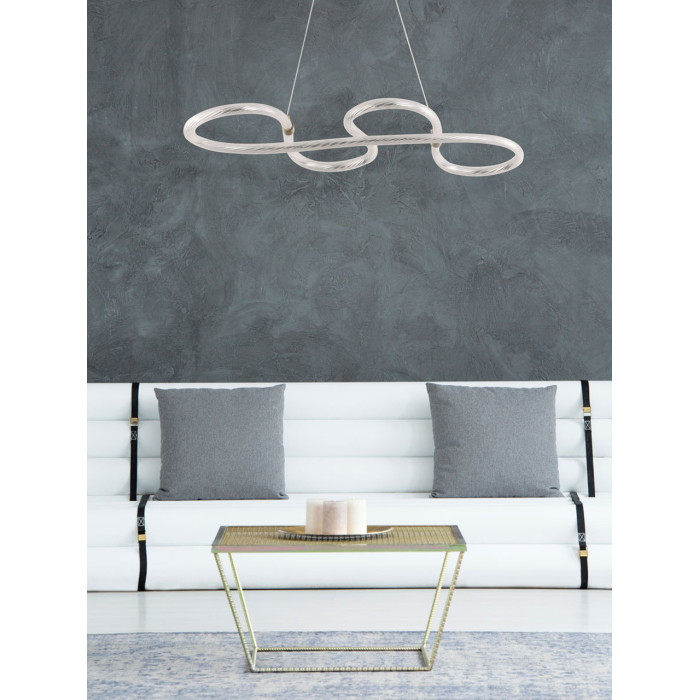 Актуальный цвет бронзы и качественная гальваника сохраняют привлекательный вид люстры на долгие годы. Прозрачный акрил с линейным рисунком создает интересный эффект игры света и тени. Благодаря единой плавно изогнутой линии плафону люстра становится интересным элементом интерьера. Светодиодные источники света экономичны и безопасны.Металлическое основание подвесной люстры гальванизировано в цвет бронзы. Светодиодный источник света закрыт оригинальным плафоном изогнутой формы, выполненным из прозрачного литьевого акрила.