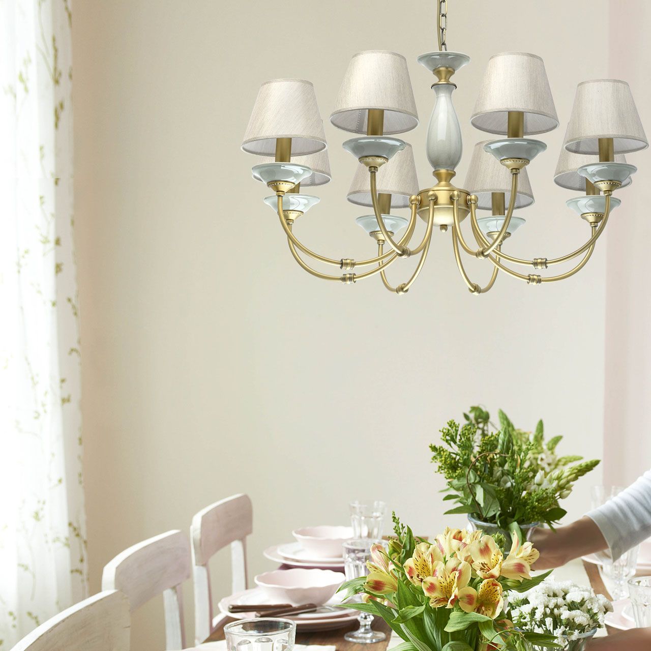 Элегантная люстра прекрасно дополнит классический интерьер. Металлическое основание благородного цвета античной бронзы подчеркнуто изящными текстильными серыми абажурами. Особый шарм композиции придает необычный декор: центральная часть и розетки выполнены из керамики серого цвета. Модель покоряет нежным сочетанием оттенков, непревзойденный грациозностью и, конечно же, керамическим украшением.Преимущества модели