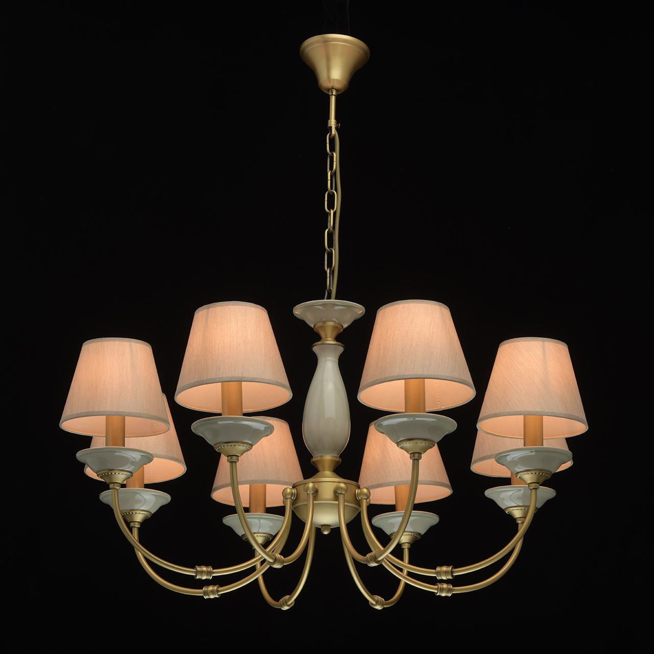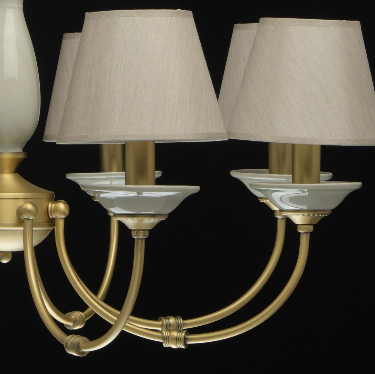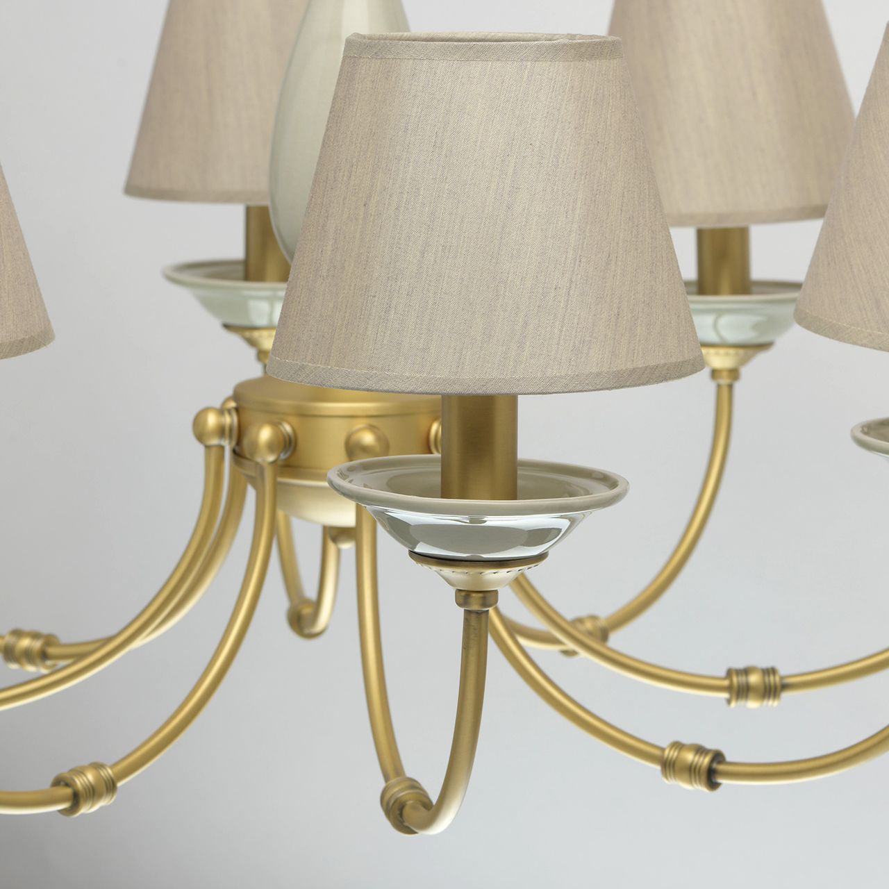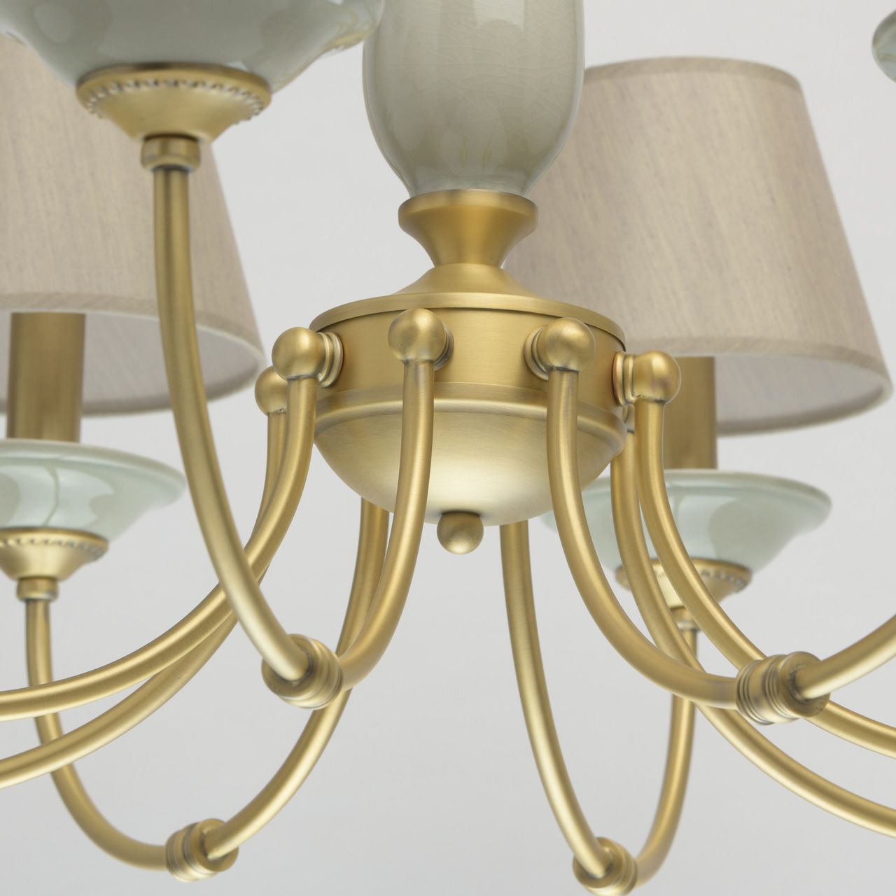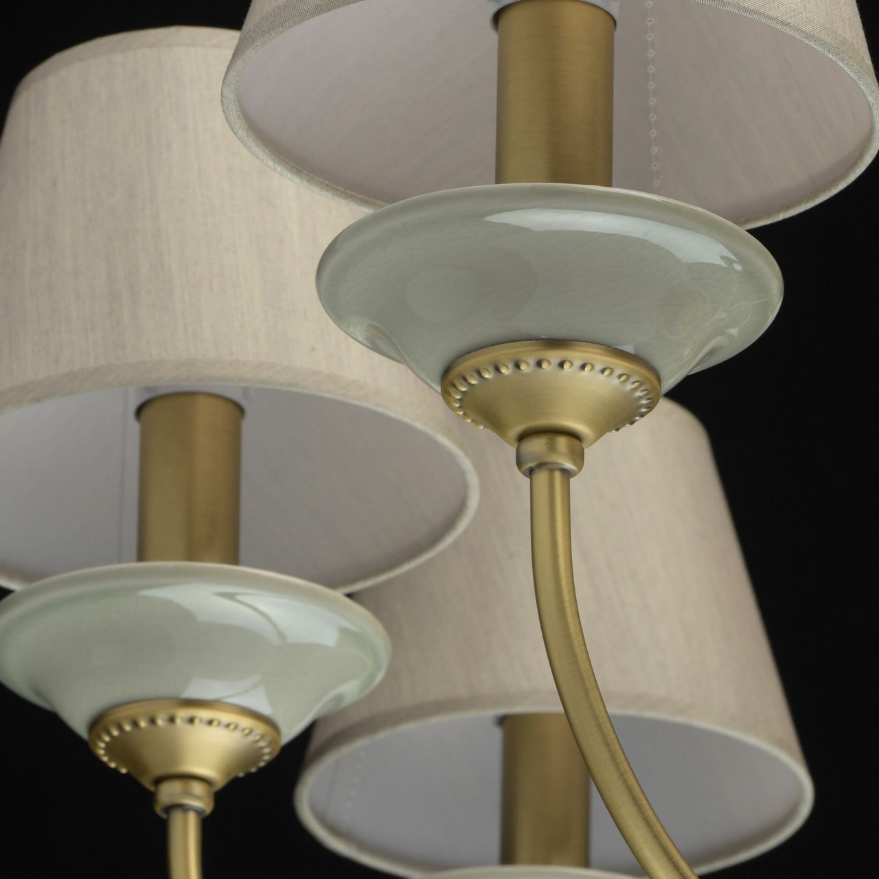 Основание светильника выполнено из металла и гальванизировано в цвет золота. Рожки выполнены по технологии проката на роликовом станке, потолочная чаша выполнена по технологии прессования. Центральная ось и декоративные розетки выполнены из глазурированного фарфора серого цвета. Фарфор состарен по технологии кракелирования. Абажуры выполнены из фактурной ткани серого цвета с термостойким акрилом внутри. По краям абажуров крепится кант в цвет абажуров, абажуры прошиты.Тип помещения