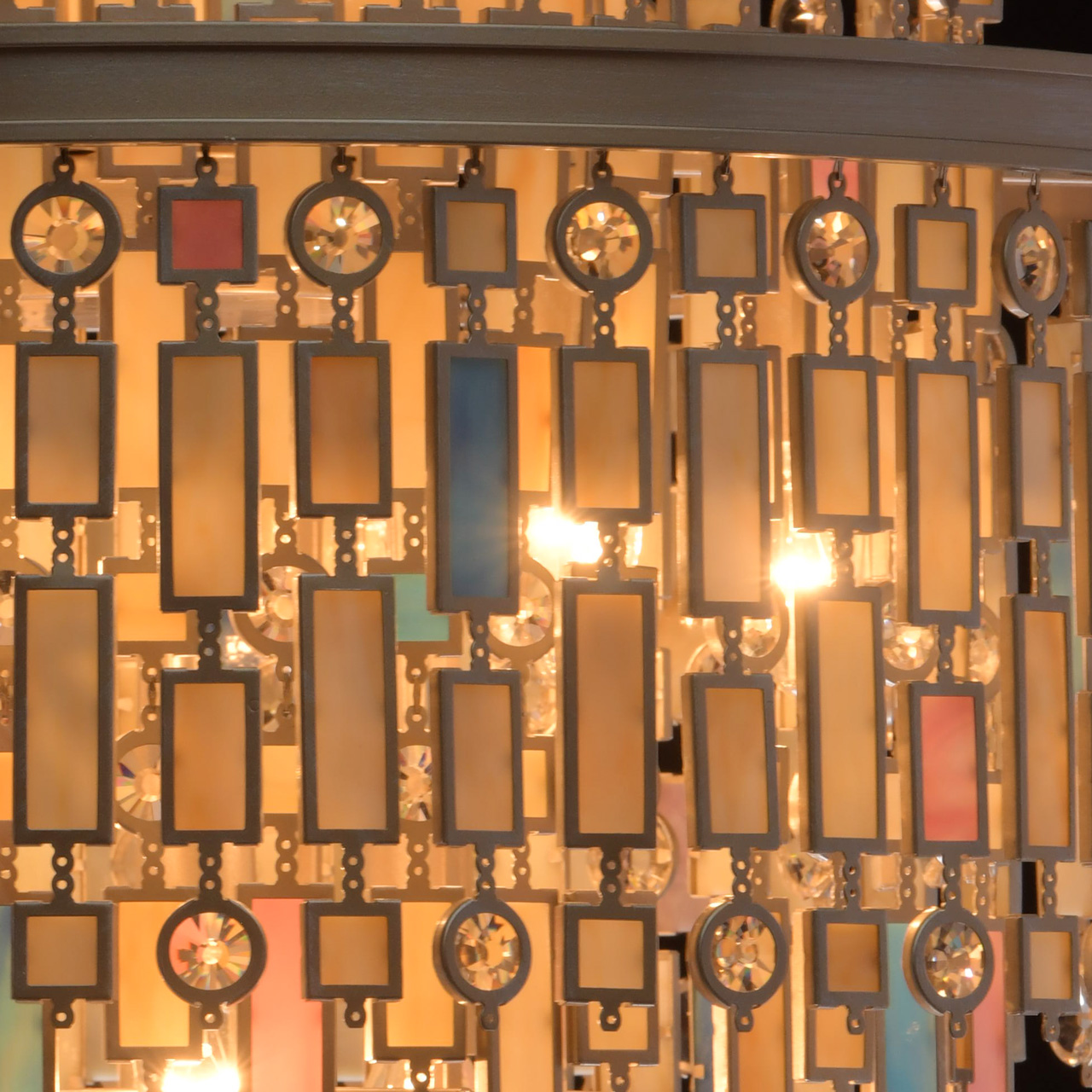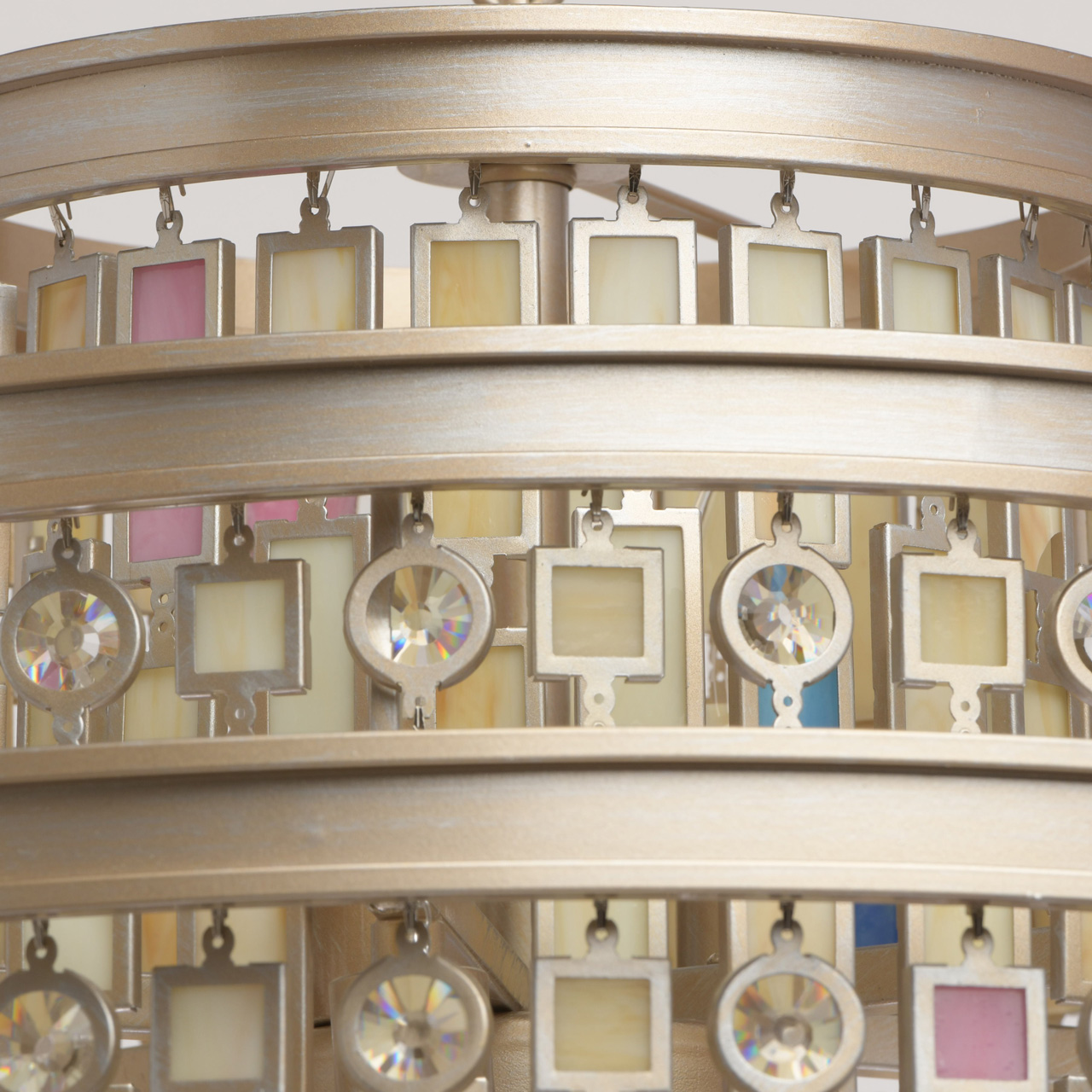 Основание выполнено из сплава металла и обработано по технологии двойного окрашивания в цвет перламутрового золота, где основной слой цвета серебра, а декоративный слой цвета золота. Корпус - прессование. Каркас - обработка на токарном станке. Декоративные элементы - прессование. Декор - витражное стекло, имитирующее опал бежевого, розового и голубого цвета и хрусталь формы круга.Тип помещения