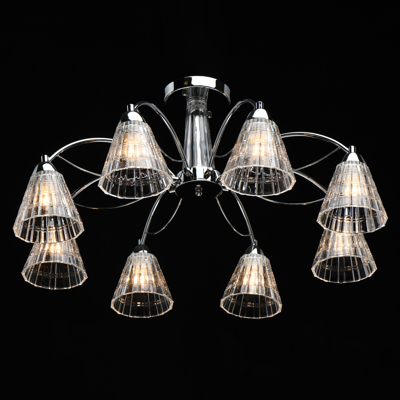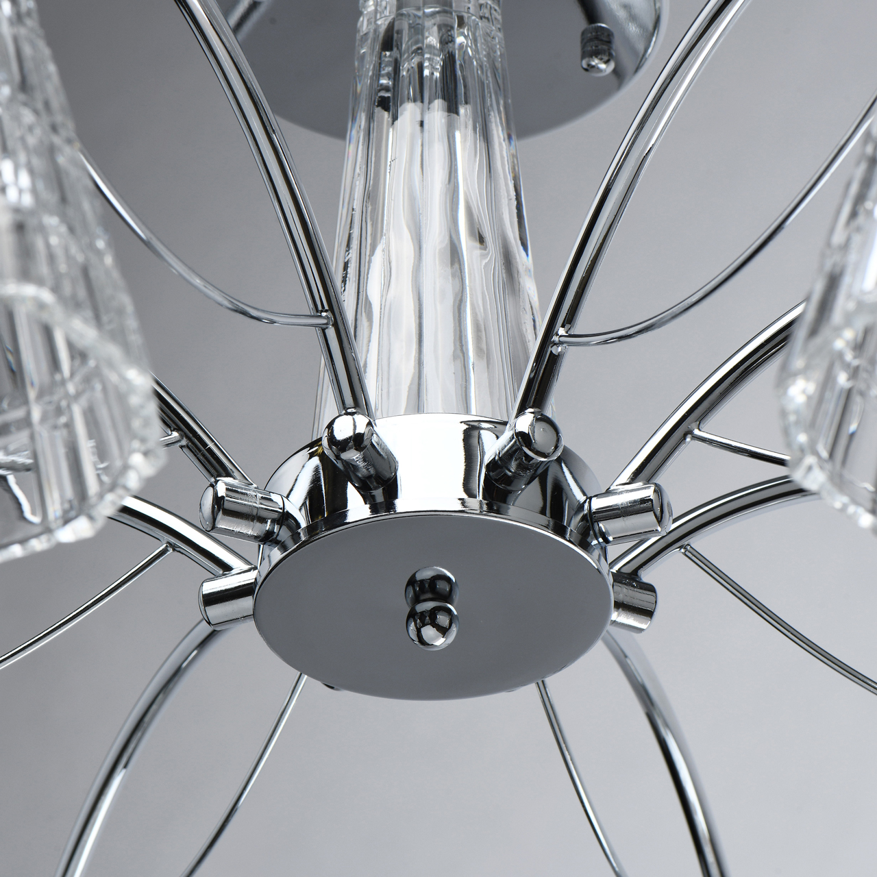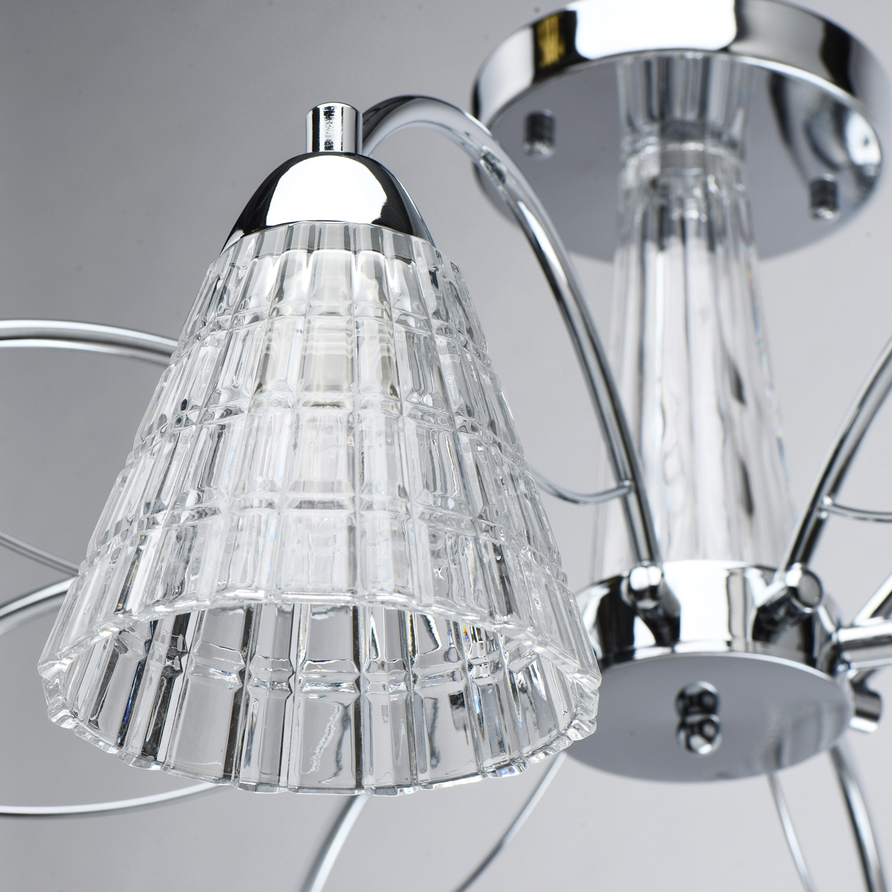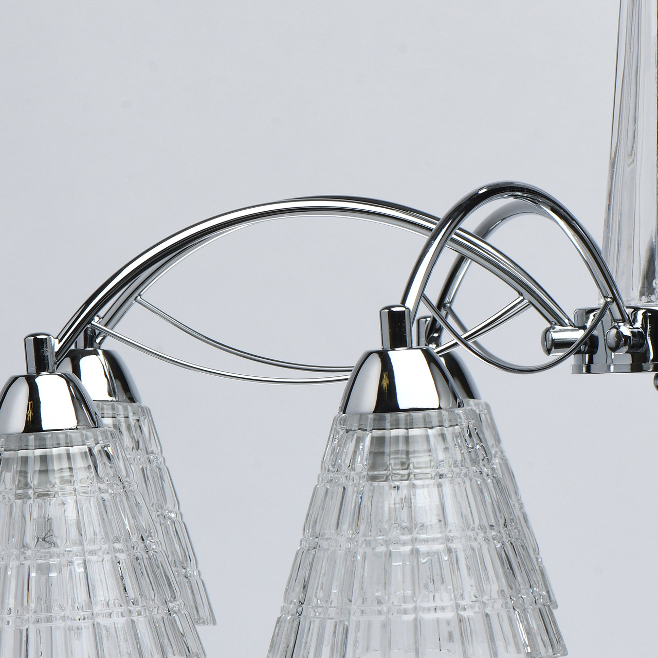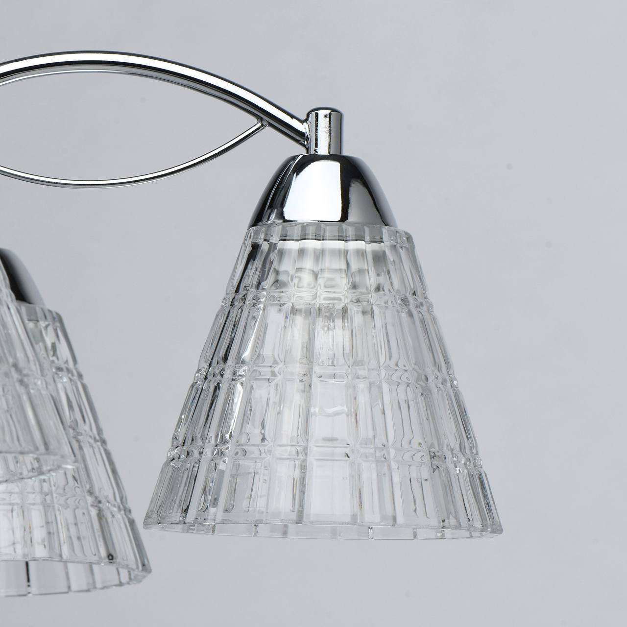 Металлическое основание светильника гальванизировано в цвет хрома. Светильник декорирован рельефными плафонами из прозрачного толстостенного стекла, отлитого в сложную форму.Тип помещения