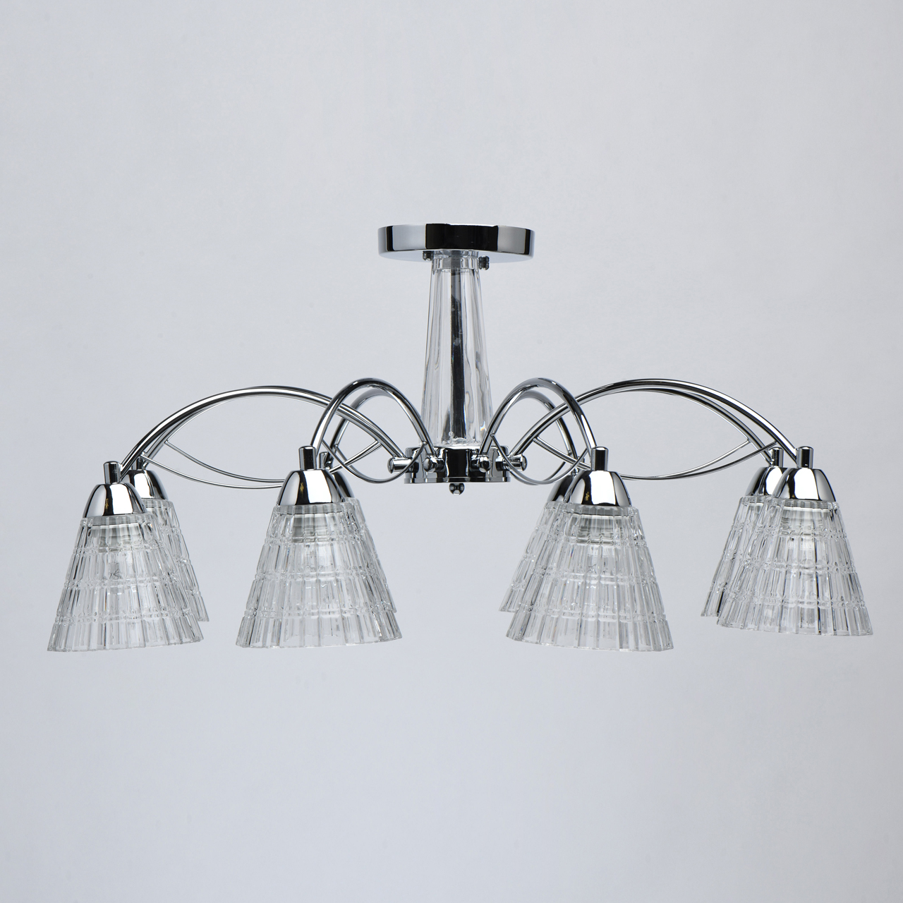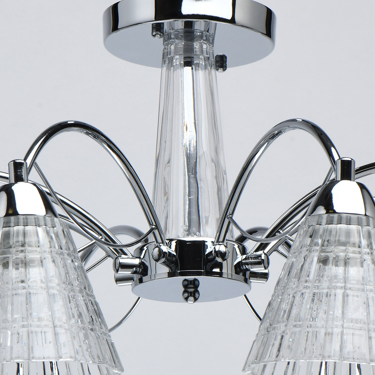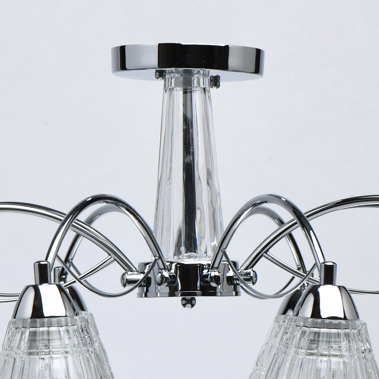Оригинальное основание из прозрачного стекла придает легкости светильнику. Компактная высота светильника идеальна для стандартной высоты потолка. Широкий диаметр обеспечивает высокие параметры освещения. Рифленые плафоны создают красивую игру света.Стилевые решения интерьера