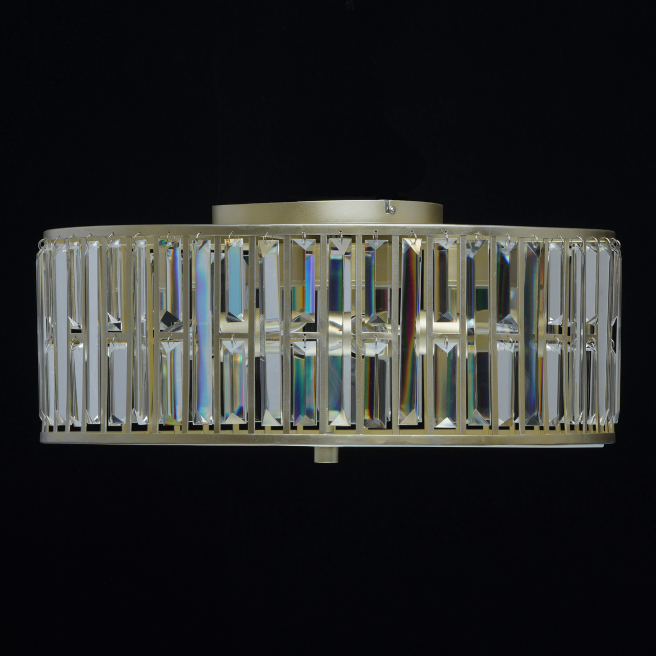Основание выполнено из металла и обработано по технологии двойного окрашивания, основной слой - серебро, декоративный слой - перламутровое золото. Нижняя часть плафона закрыта матированным стеклом. Декор: прозрачный хрусталь прямоугольной формы.Тип помещения