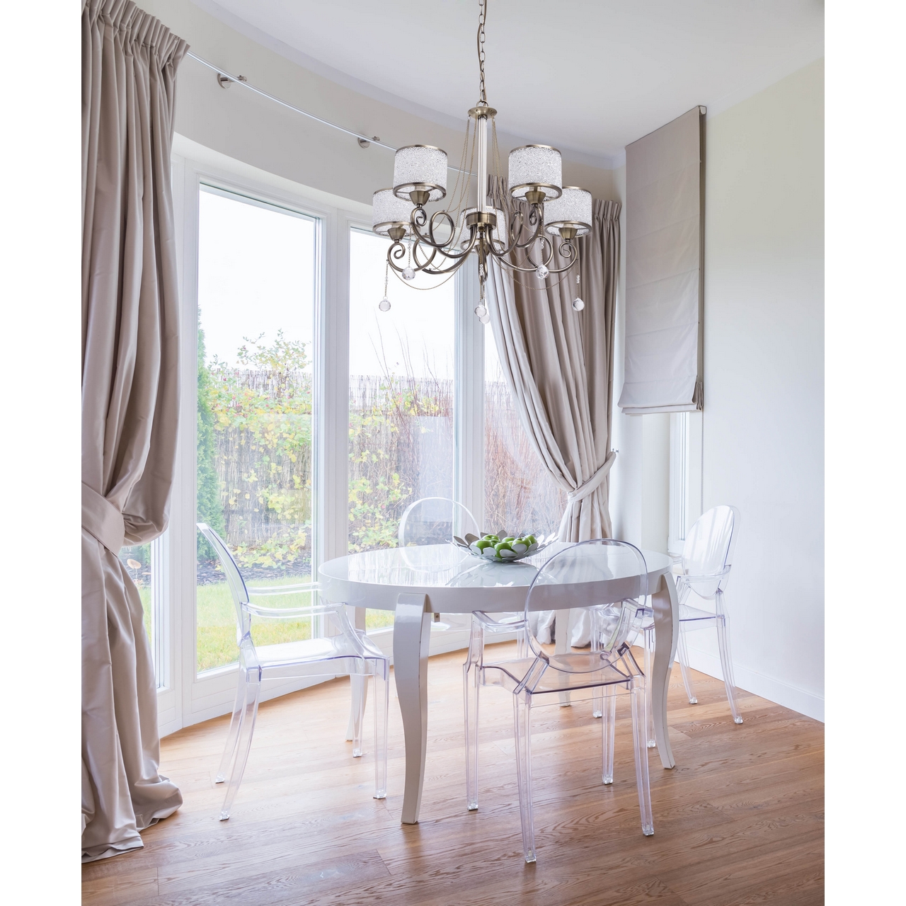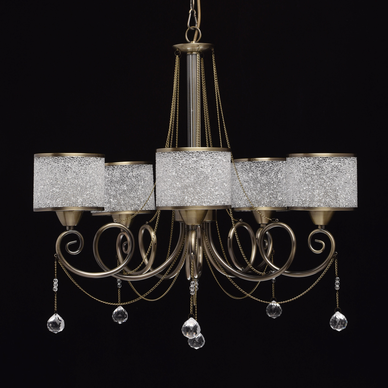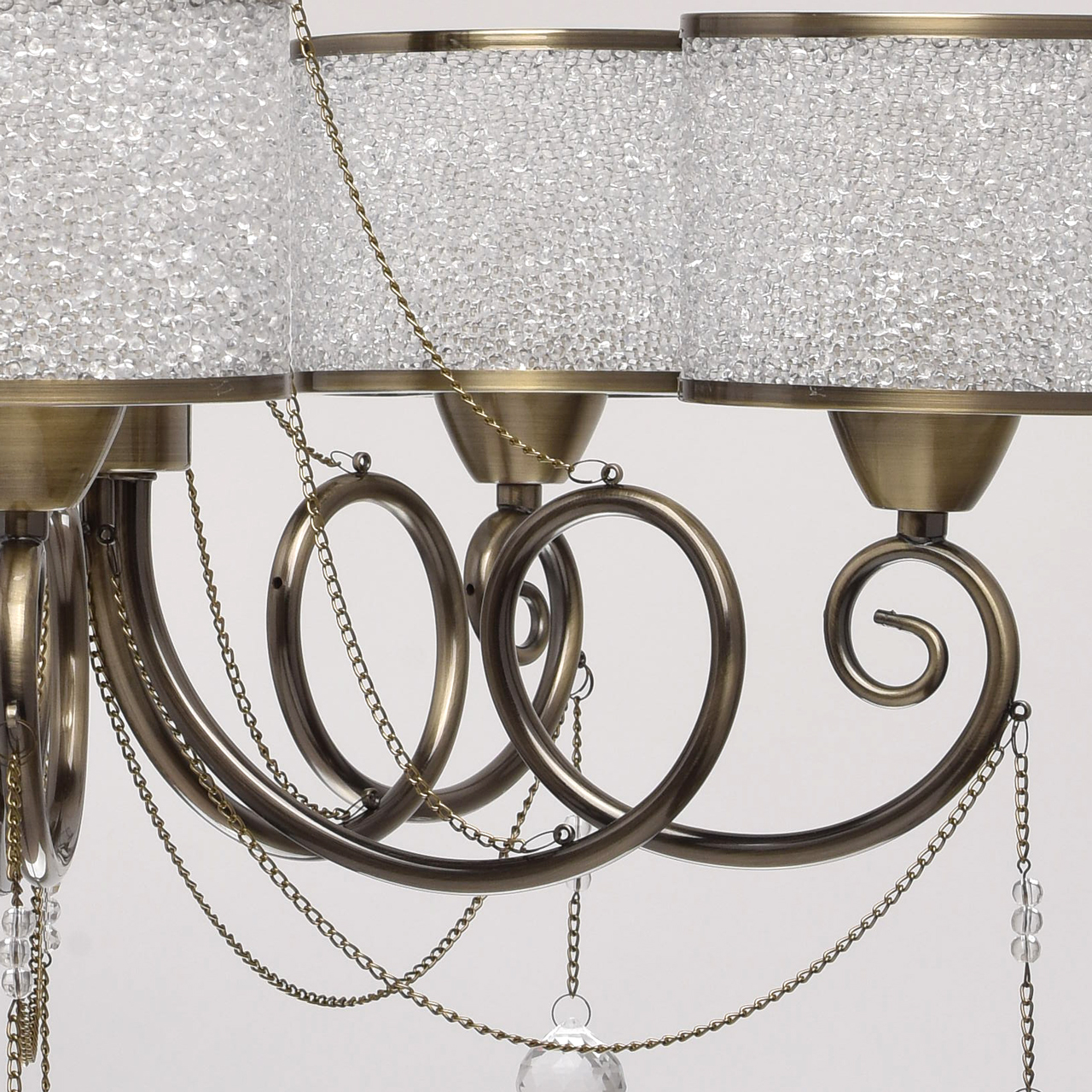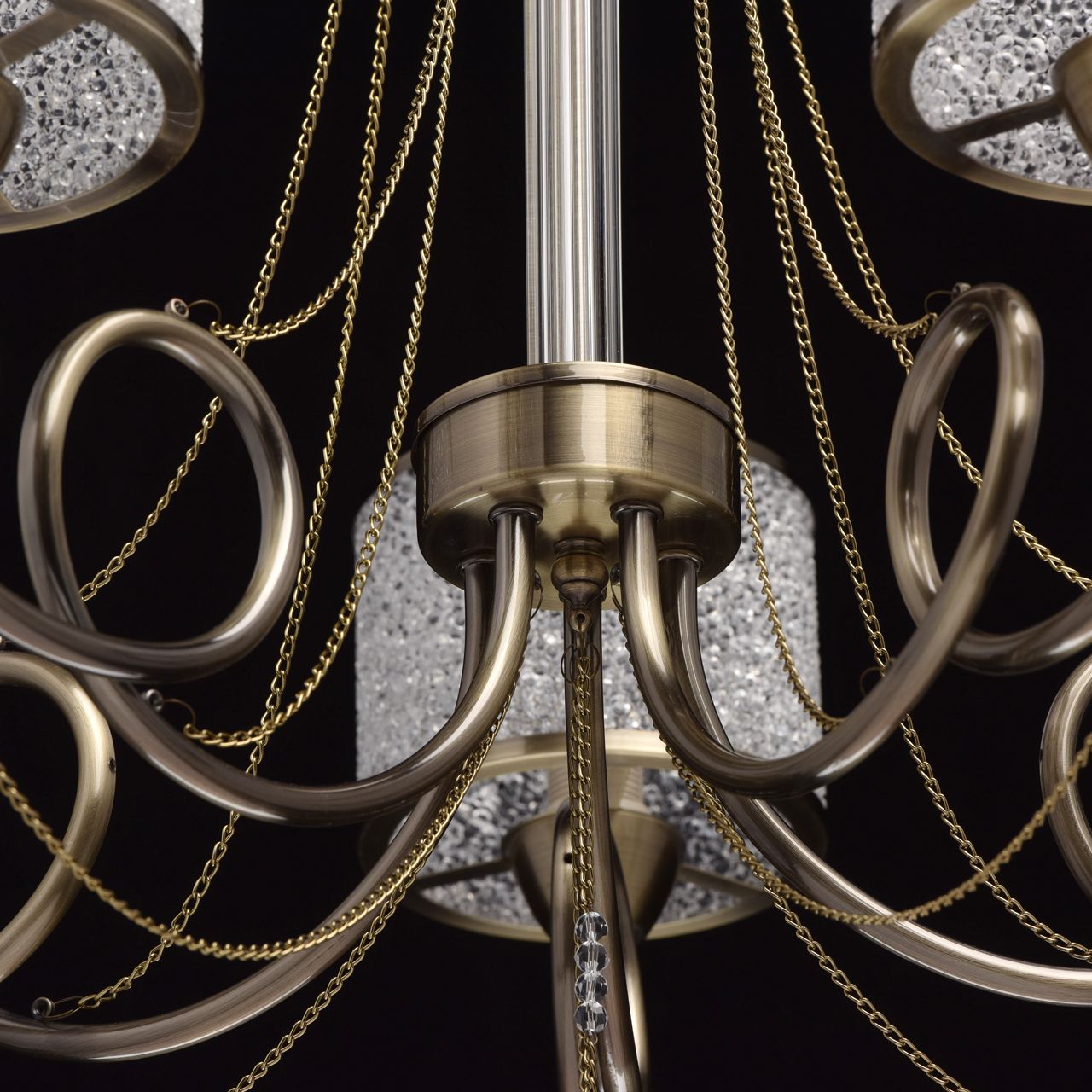 Элегантная красота, утонченность и роскошь – все эти качества отличают люстру из коллекции «Моника». Основание из металла благородного оттенка античной бронзы дополнено грациозно изогнутыми витыми рожками. Плавный изгиб выгодно подчеркнут необычными плафонами: они выполнены из слитых пузырьков прозрачного акрила, напоминающих маленькие драгоценные камни, а металлический кант в цвет основания удачно обрамляет композицию. Центральная часть светильника декорирована прозрачным стеклом, однако главная его изюминка – изящно ниспадающие металлические цепочки и очаровательные хрустальные подвески. Подобный светильник будет гармонично смотреться как в классическом, так и в современном интерьере, благодаря эффектному сочетанию декора, мягких линий и точных форм.Преимущества модели