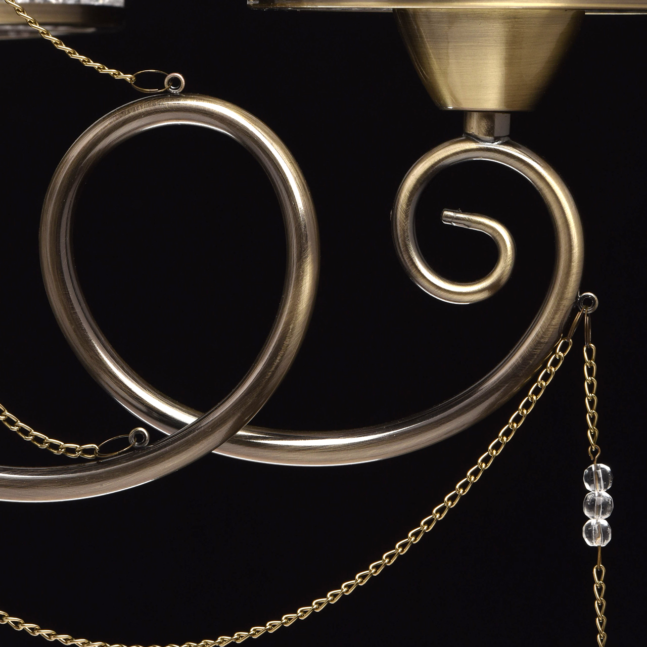 Основание светильника выполнено из металла и гальванизировано в цвет античной бронзы, лакировано. Потолочная чаша, корпус, декоративная розетка, держатели плафонов изготовлены по технологии токарной обработки. Рожки сложно изогнуты по технологии проката на роликовом станке. Плафоны отлиты из прозрачного акрила в виде спаянных пузырьков, с металлическим кантом в цвет основания. Декор: центральный стержень декорирован элементом из прозрачного рельефного стекла. Декоративные цепочки из металла гальванизированы в цвет арматуры и декорированы прозрачным хрусталем в форме шара.Тип помещения