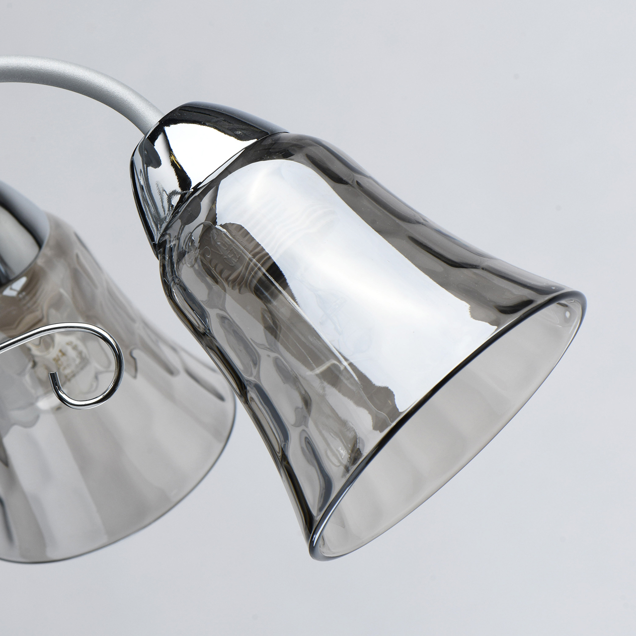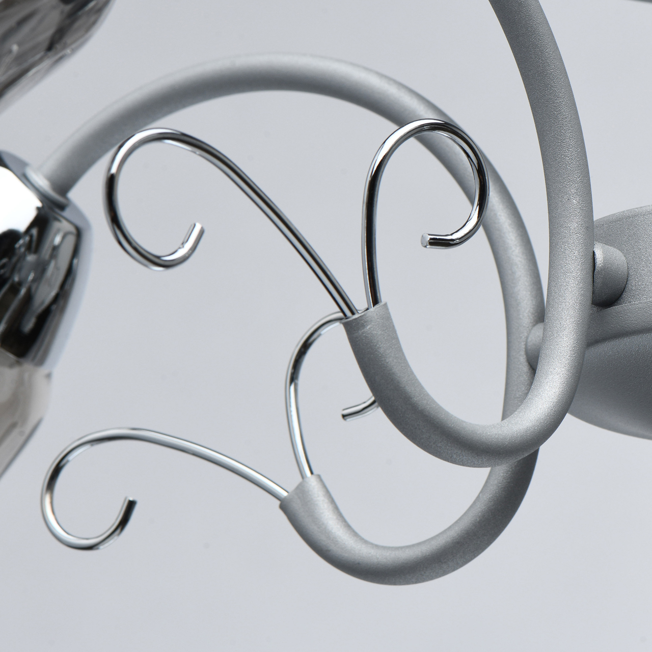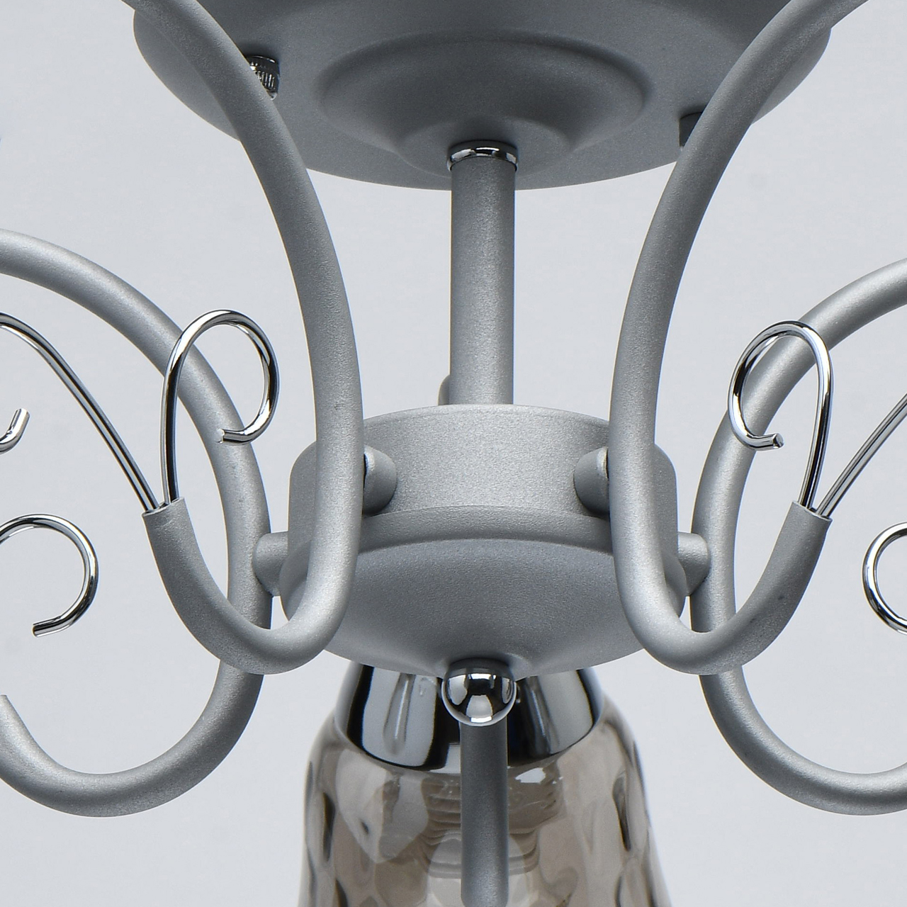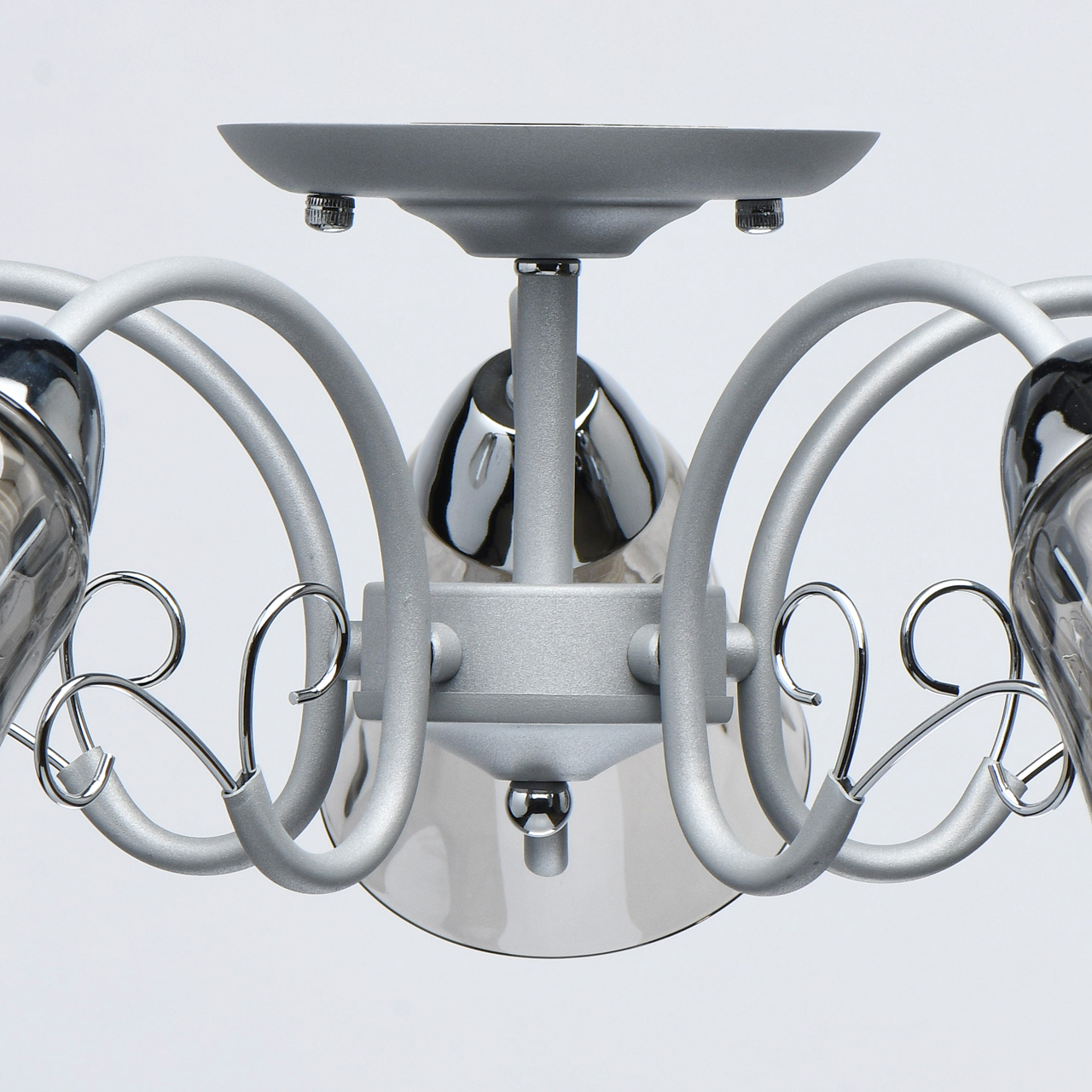 Новый оттенок серебра в сочетании с глянцевым хромом актуален в современных интерьерах. Стекло плафонов в дымчатом цвете обеспечивает комфортный световой поток. Рельефные плафоны создают игру света. Компактная высота модели идеальна для стандартной высоты потолка.Стилевые решения интерьера