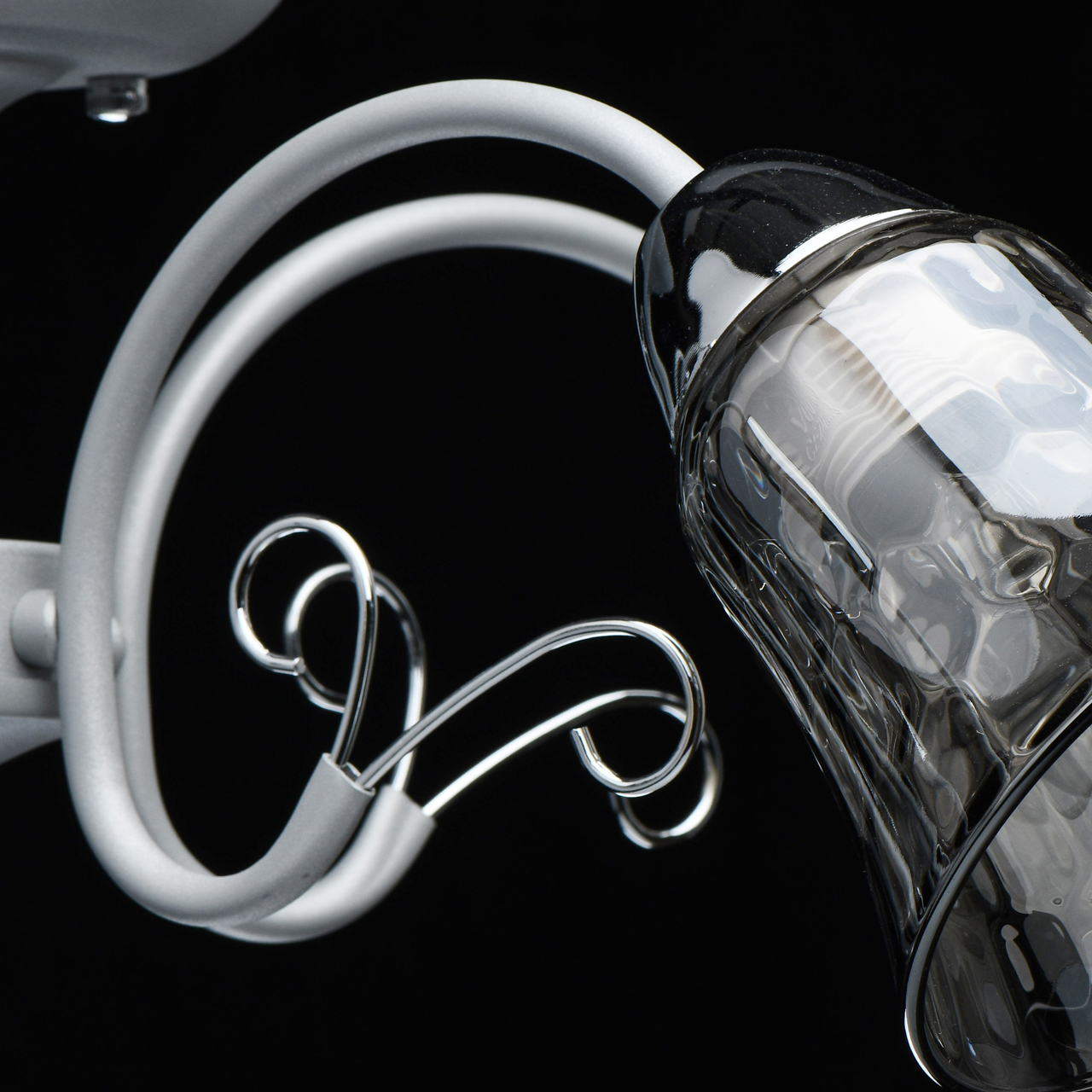 Металлическое основание светильника обработано по технологии порошкового окрашивания в серебряный цвет. Отдельные элементы основания гальванизированы в цвет хрома. Рельефные стеклянные плафоны отлиты в сложную форму и гальванизированы в дымчатый цвет.Тип помещения