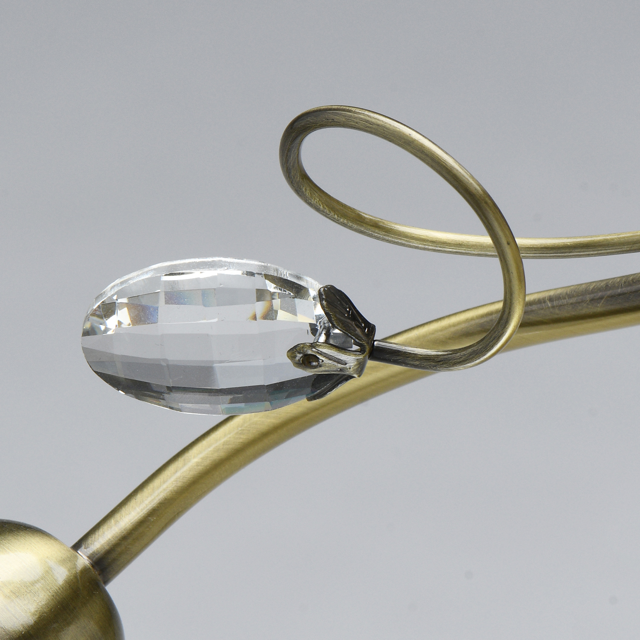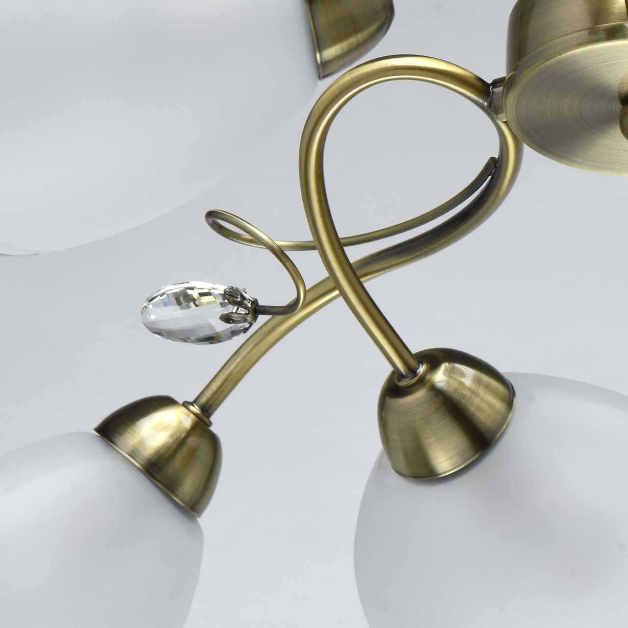 Плафоны из матового стекла с прозрачным кантом обеспечивают мягкий комфортный свет. Декор из стекла оригинальной огранки добавляет легкого шарма. Благородный цвет античной бронзы для интерьеров любой цветовой гаммы. Компактная высота модели идеальна для стандартной высоты потолка.Стилевые решения интерьера