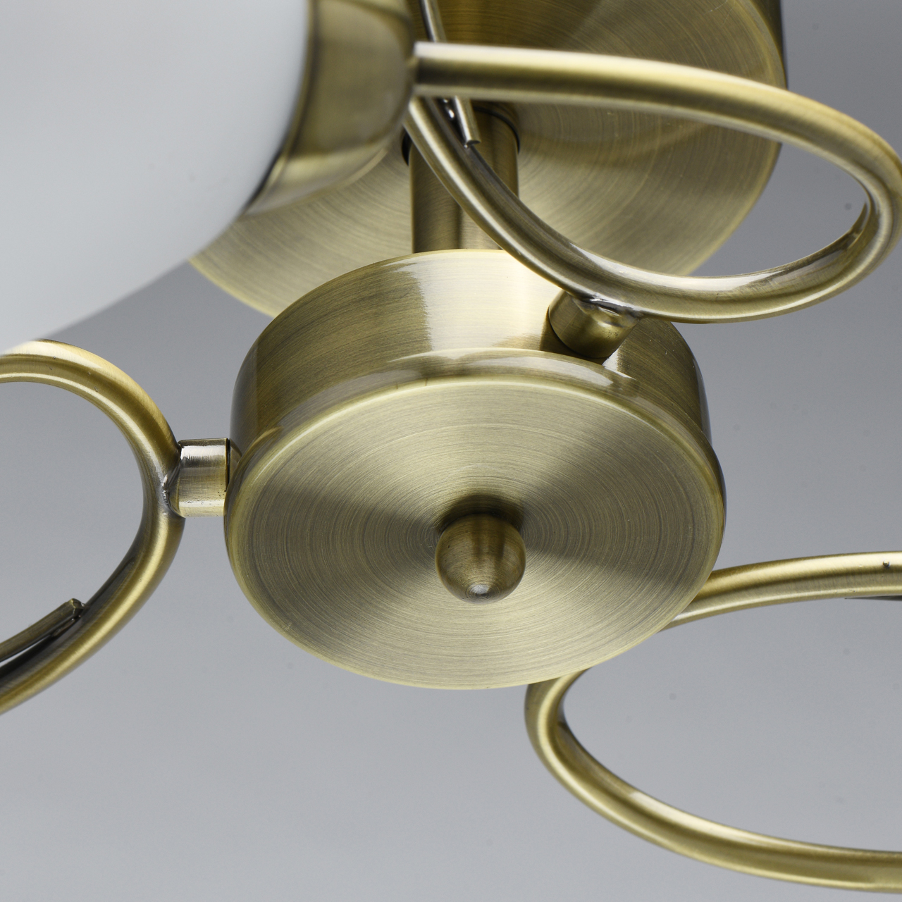 Основание светильника выполнено из металла и гальванизировано в цвет античной латуни. Светильник декорирован стеклянными плафонами, выдувными в форму и частично матированными. Края плафонов оплавлены.Тип помещения