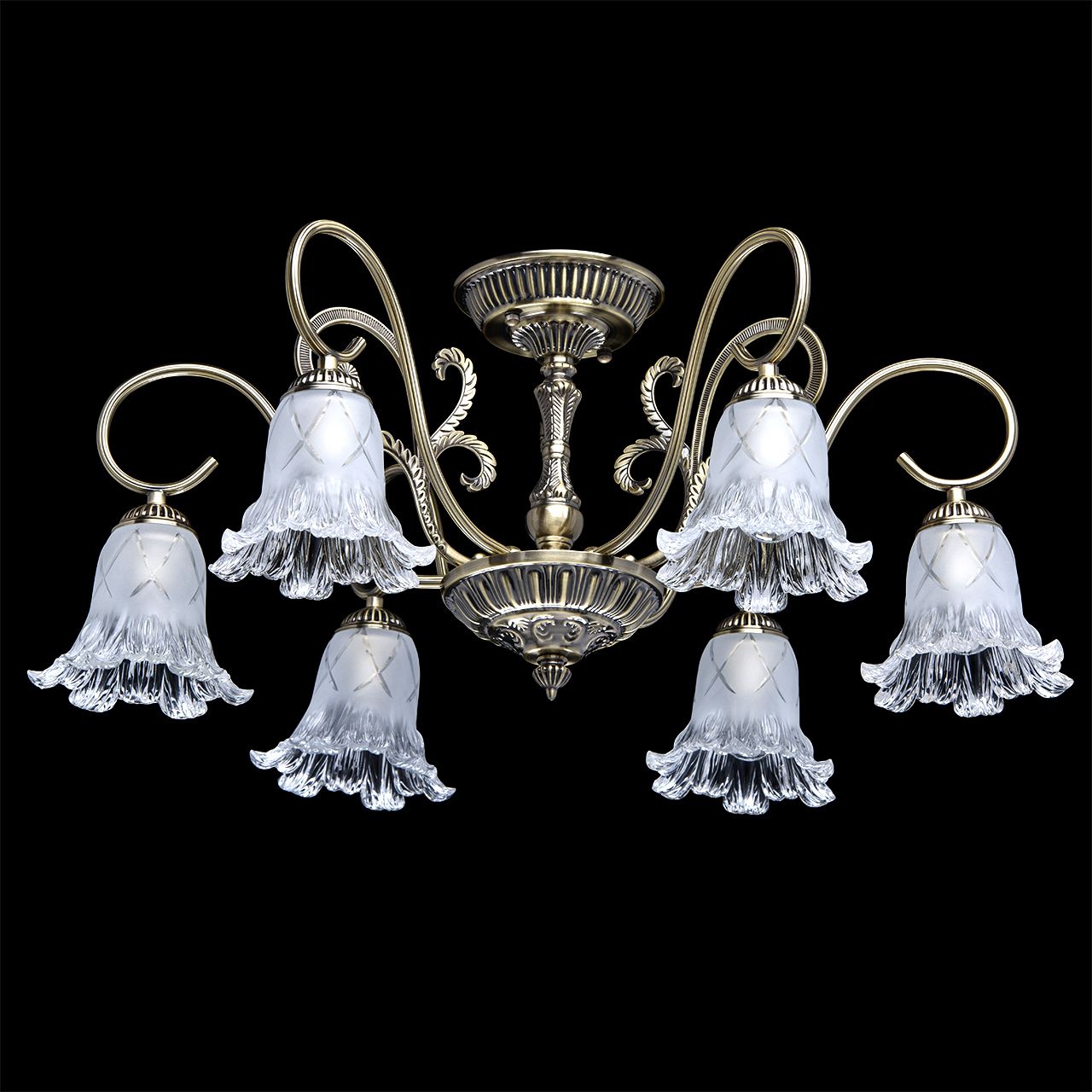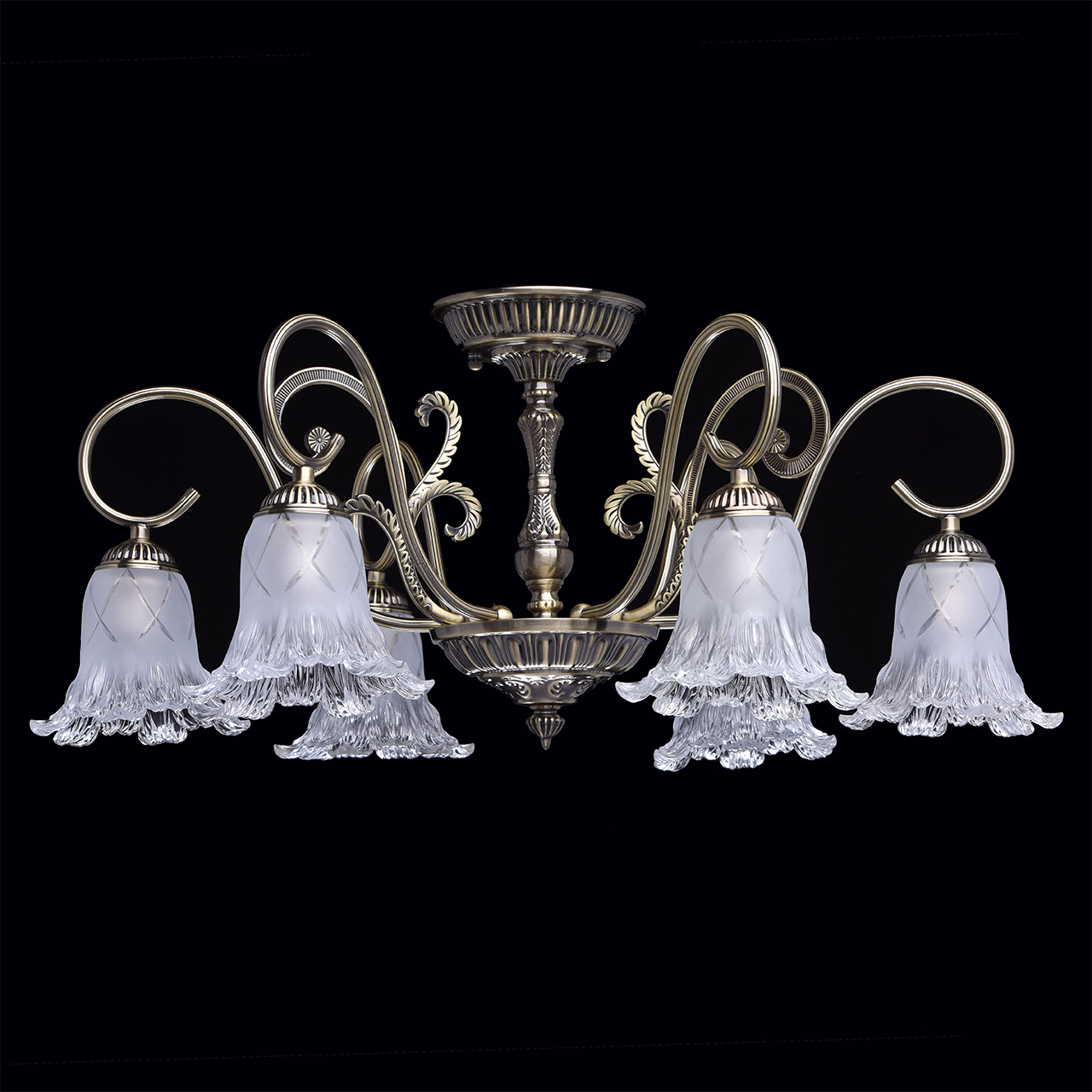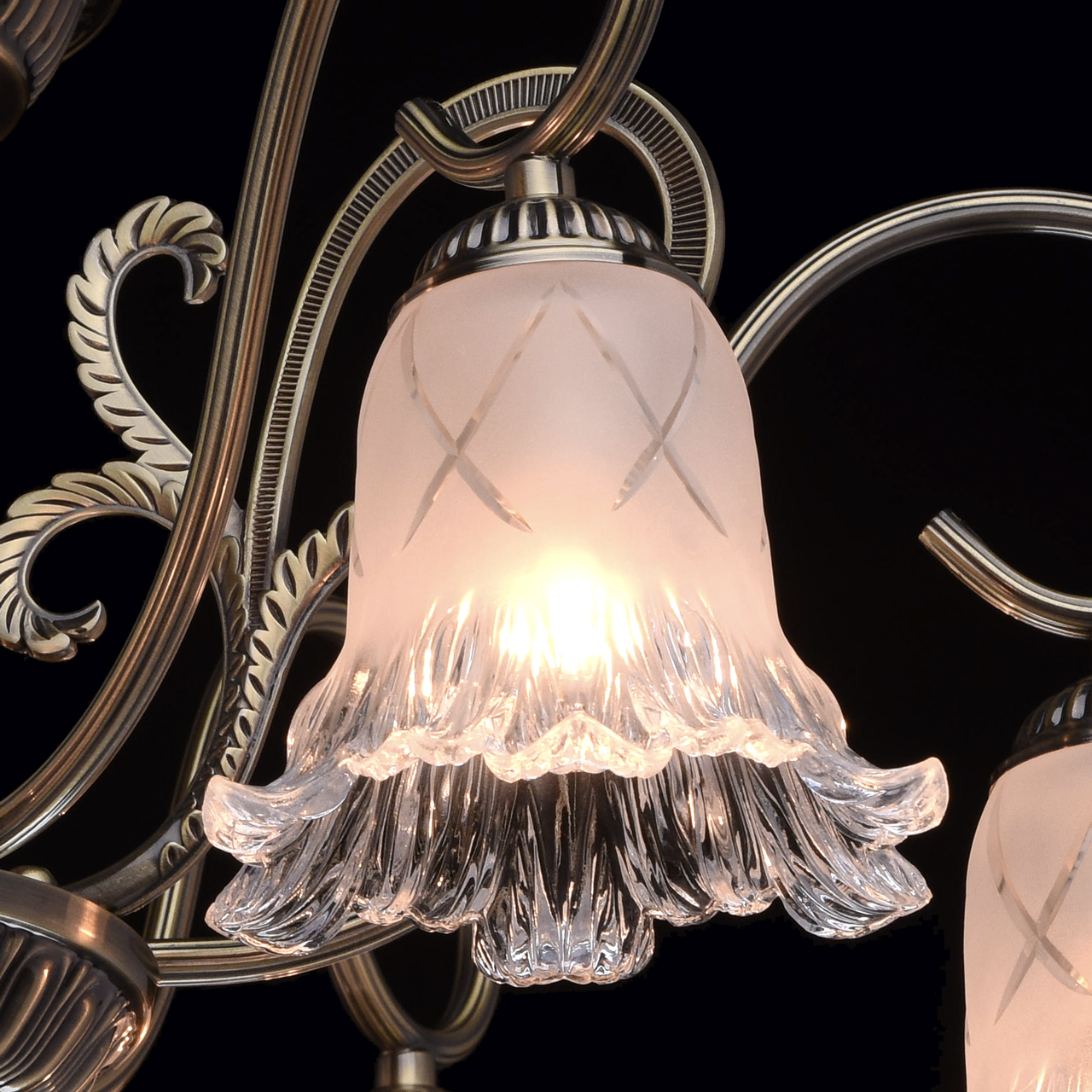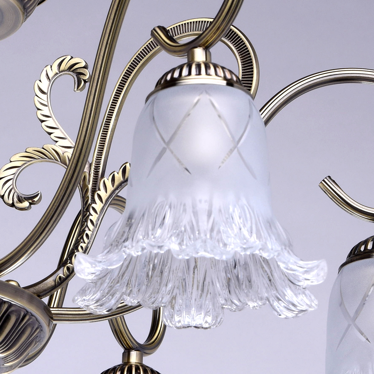 Оригинальный флористический дизайн в современном классическом стиле позволяет светильнику вписаться в интерьеры в классическом стиле, в стилях модерн и эклектика. Большой диаметр и, направленные вниз, полупрозрачные плафоны обеспечивают яркий и широкий световой поток. Плафоны из матового стекла оригинальной формы. Классическое актуальное во все времена основание в бронзе. Близкое расположение к потолку дает возможность размещать светильник в помещениях с невысокими потолками.Стилевые решения интерьера
