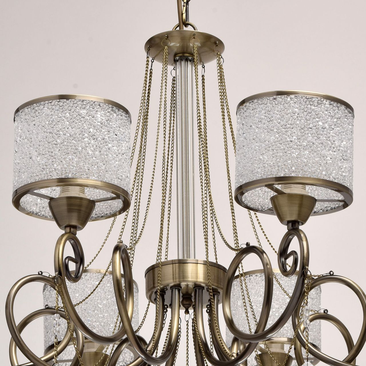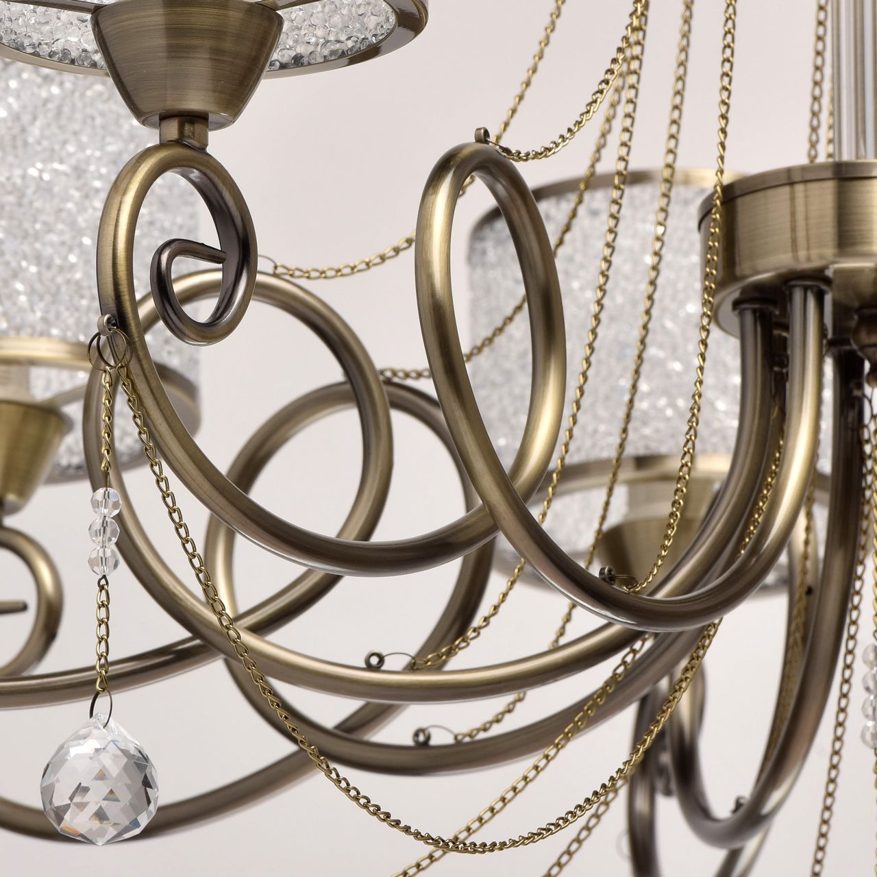 Элегантная красота, утонченность и роскошь – все эти качества отличают люстру из коллекции «Моника». Основание из металла благородного оттенка античной бронзы дополнено грациозно изогнутыми витыми рожками. Плавный изгиб выгодно подчеркнут необычными плафонами: они выполнены из слитых пузырьков прозрачного акрила, напоминающих маленькие драгоценные камни, а металлический кант в цвет основания удачно обрамляет композицию. Центральная часть светильника декорирована прозрачным стеклом, однако главная его изюминка – изящно ниспадающие металлические цепочки и очаровательные хрустальные подвески. Подобный светильник будет гармонично смотреться как в классическом, так и в современном интерьере, благодаря эффектному сочетанию декора, мягких линий и точных форм.Преимущества модели