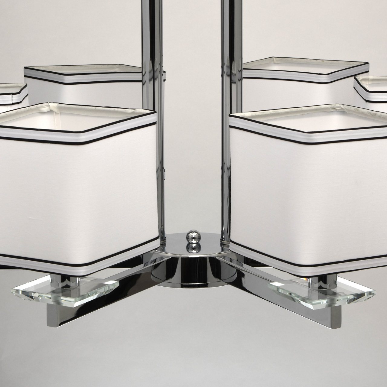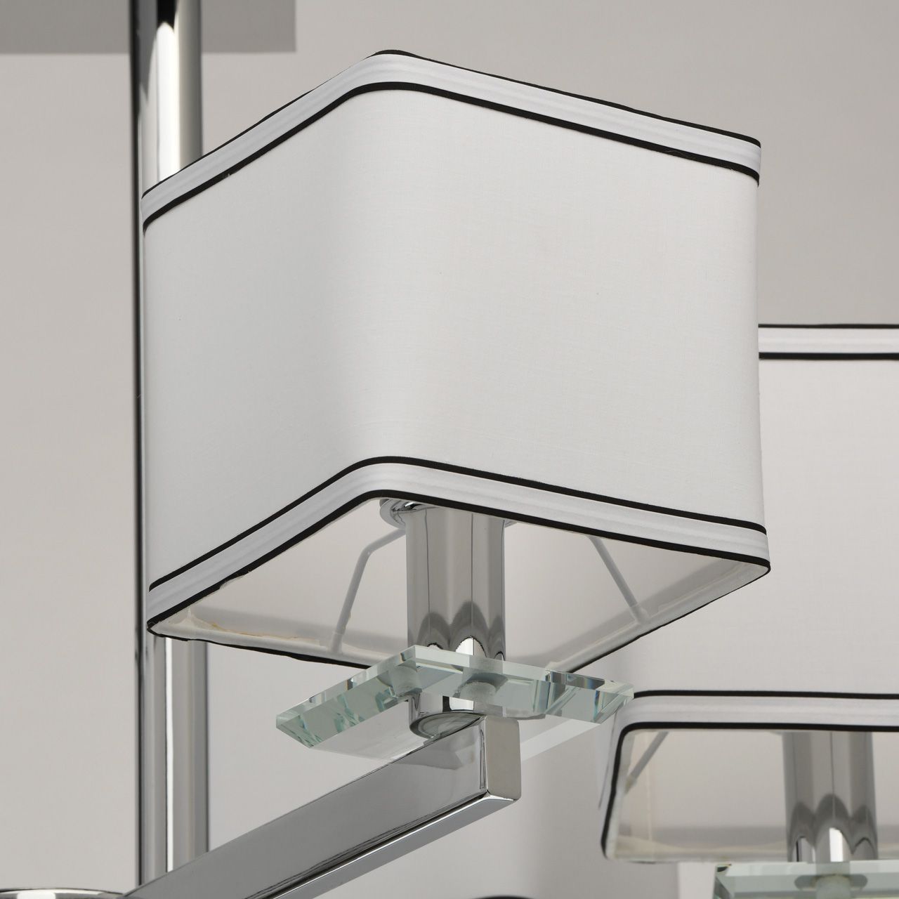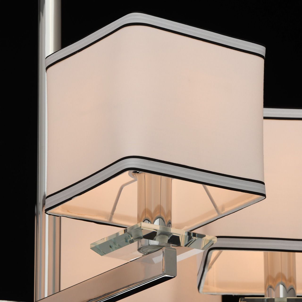 Основание светильника выполнено из металла и гальванизировано в цвет хрома. Потолочная чаша закрыта пластиной из нержавеющей стали, отполированной до зеркального блеска. Декоративные розетки выполнены из массива хрусталя. Текстильные абажуры белого цвета с кантом черного цвета и термостойким акрилом внутри.Тип помещения