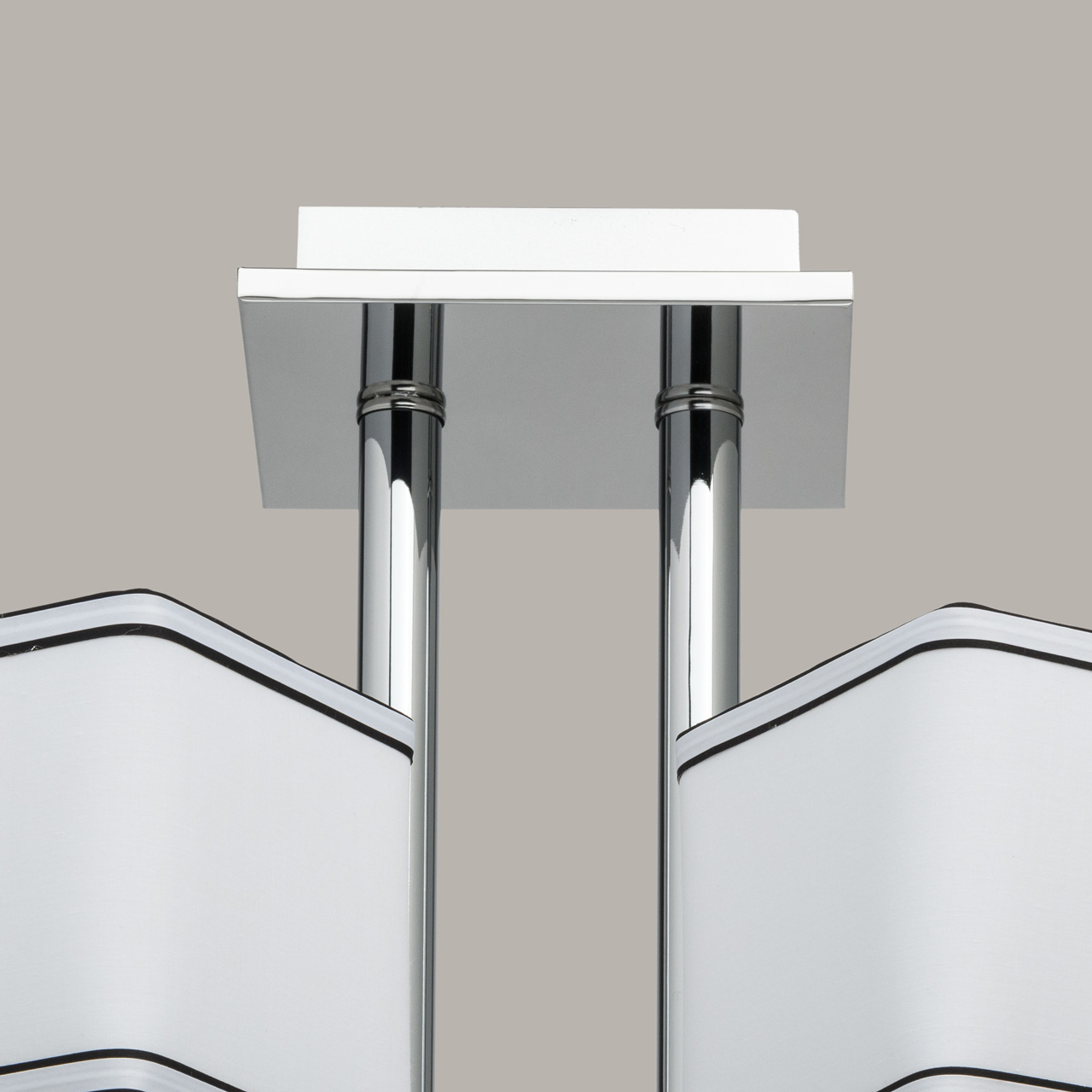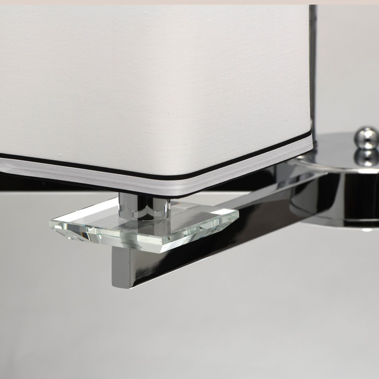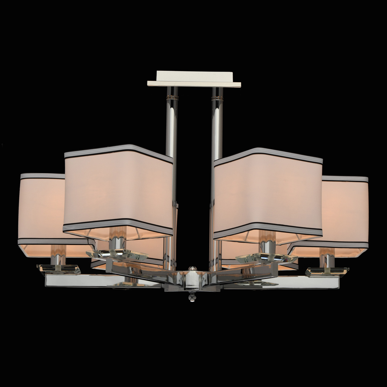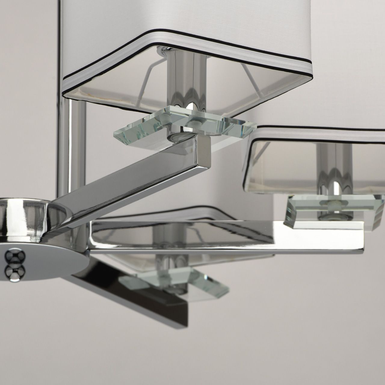 Основание светильника выполнено из металла и гальванизировано в цвет хрома. Потолочная чаша закрыта пластиной из нержавеющей стали, отполированной до зеркального блеска. Декоративные розетки выполнены из массива хрусталя. Текстильные абажуры белого цвета с кантом черного цвета и термостойким акрилом внутри.Тип помещения