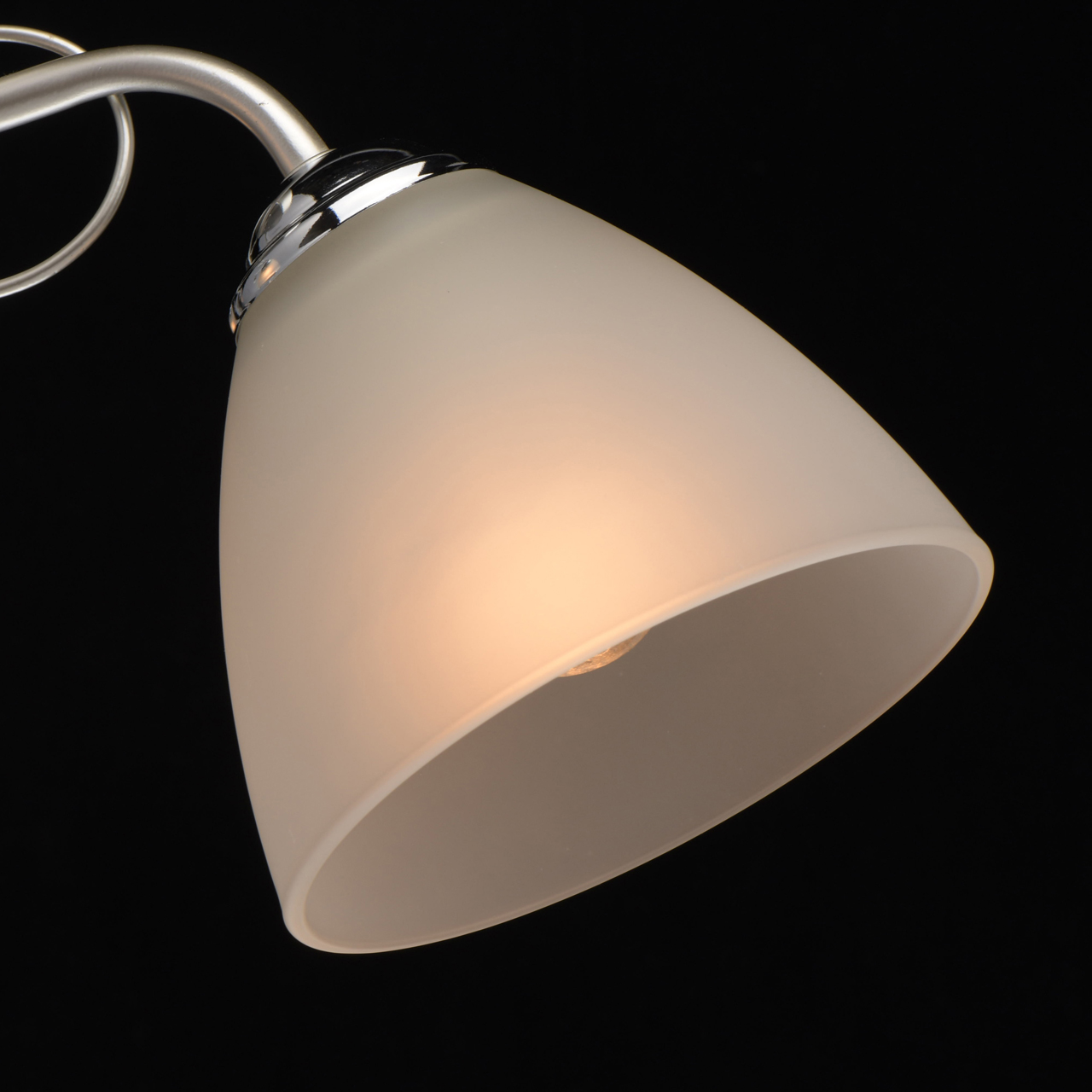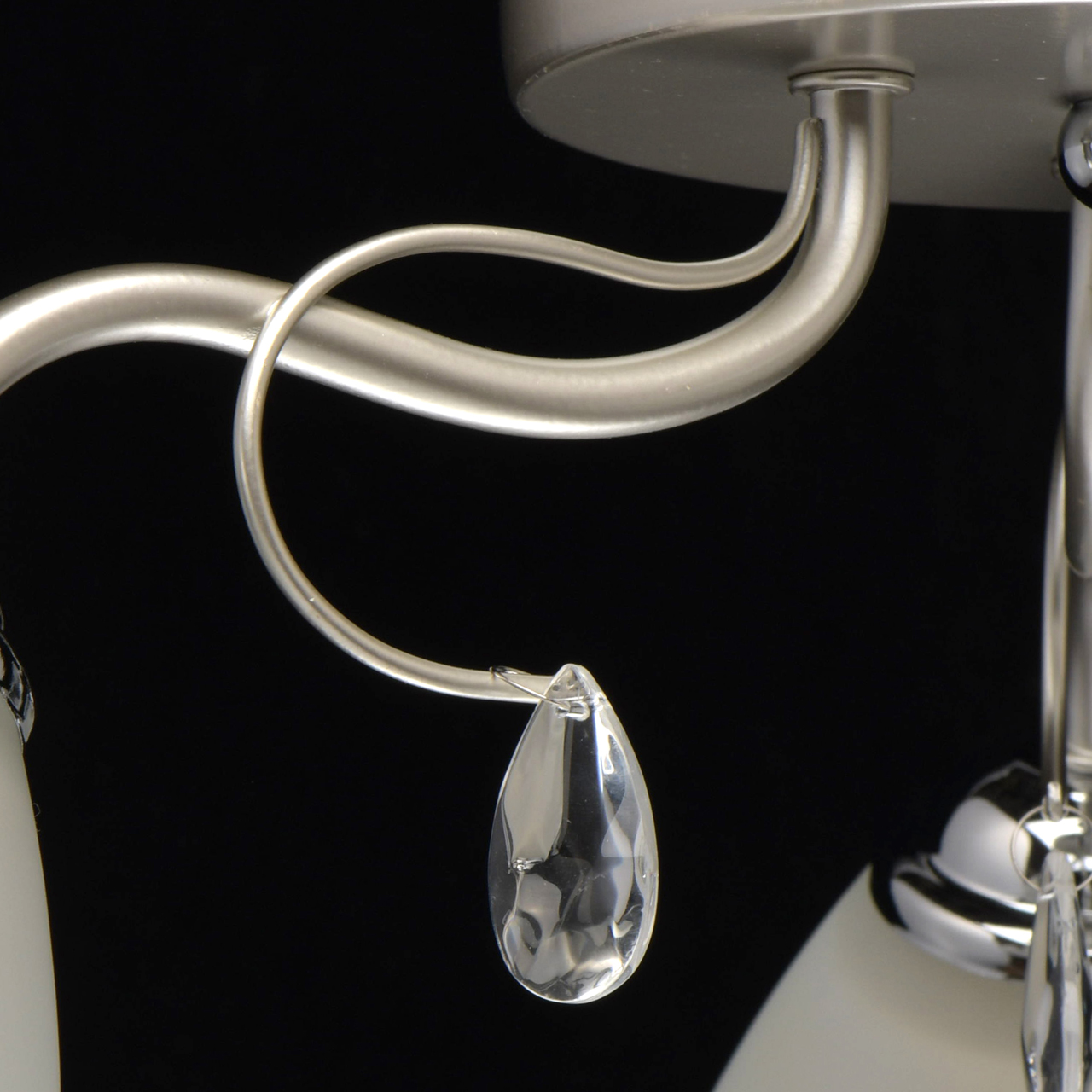 Основание светильника выполнено из металла и окрашено в цвет перламутрового серебра. Держатели плафонов гальванизированы в цвет хрома. Плафоны из матированного стекла. Светильник декорирован подвесками из стекла.Тип помещения