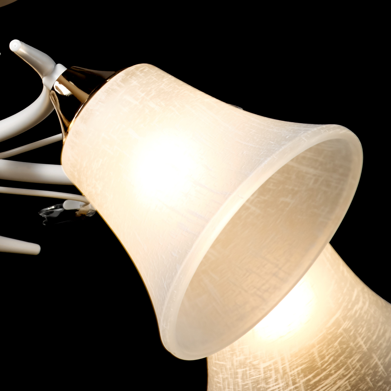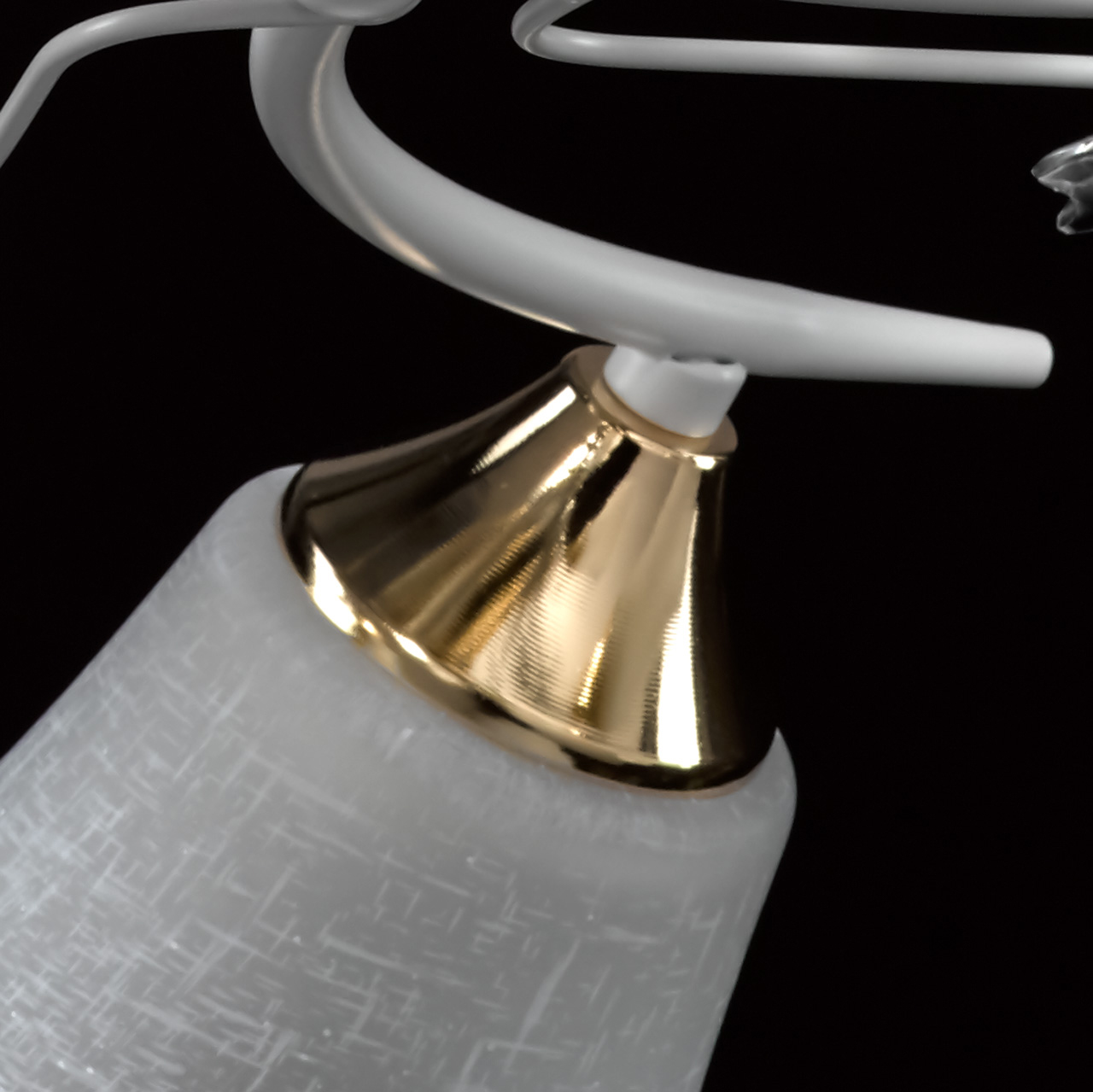 Основание светильника выполнено из металла и окрашено в белый цвет. Отдельные элементы основания гальванизированы в цвет золота. Плафоны отлиты из алебастрового стекла. Светильник декорирован хрустальным стеклом в форме листьев.Тип помещения