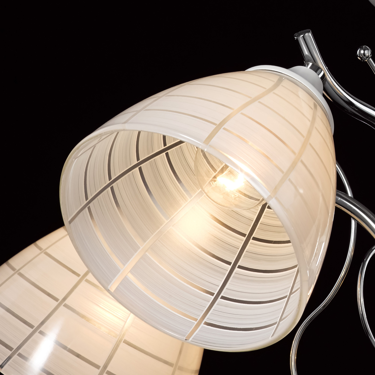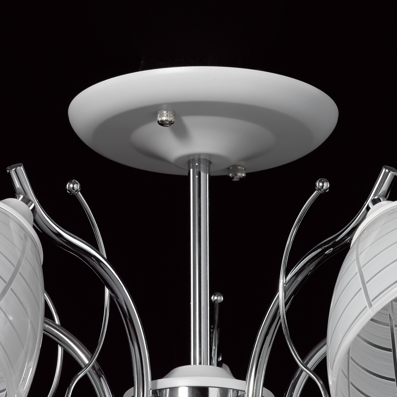 Актуальное сочетание металлов белого цвета и хрома. Матовые плафоны с геометрическим рисунком. Подвески из хрустального стекла эффектно дополняют декор рожков. Компактная высота модели идеальна для стандартной высоты потолка.Преимущества модели