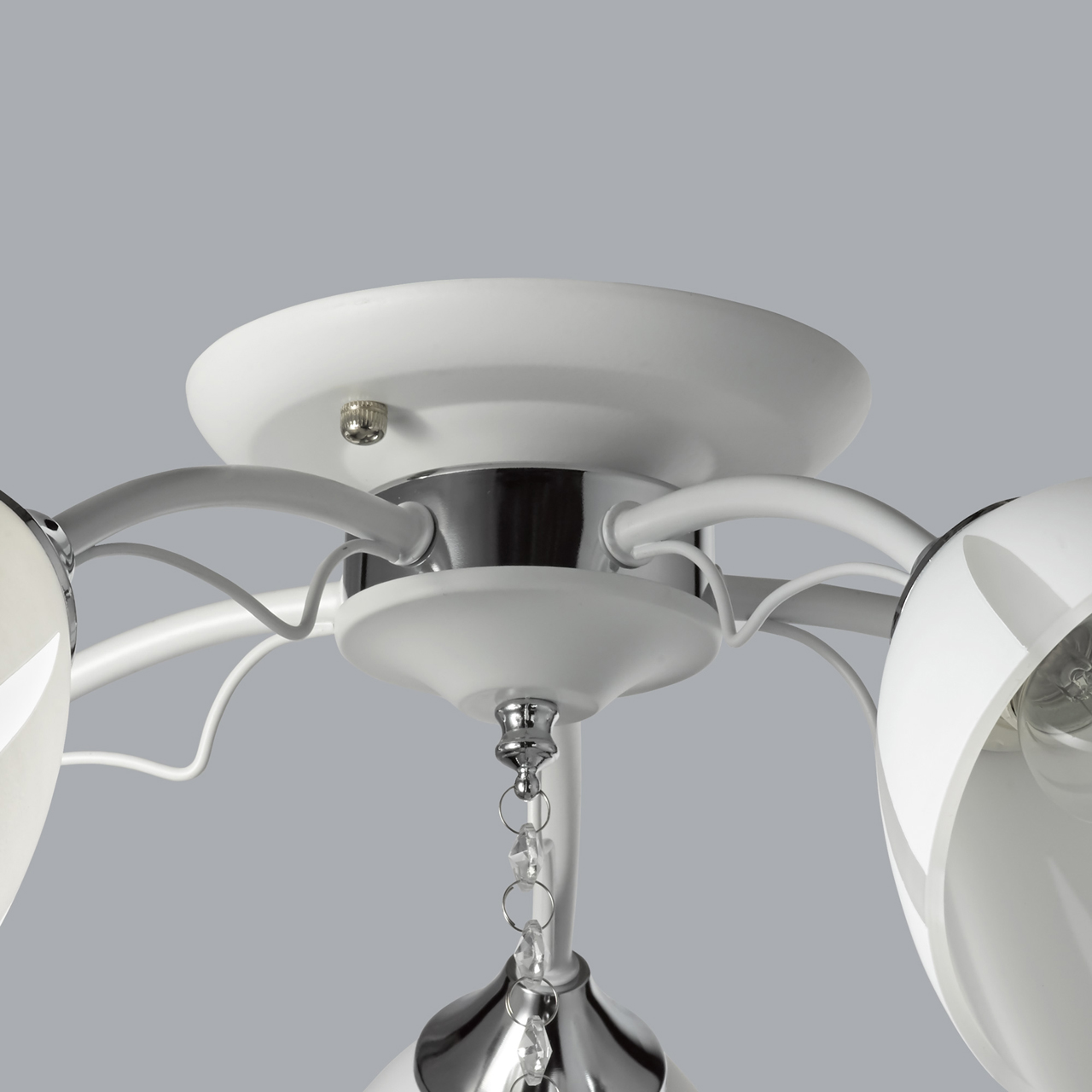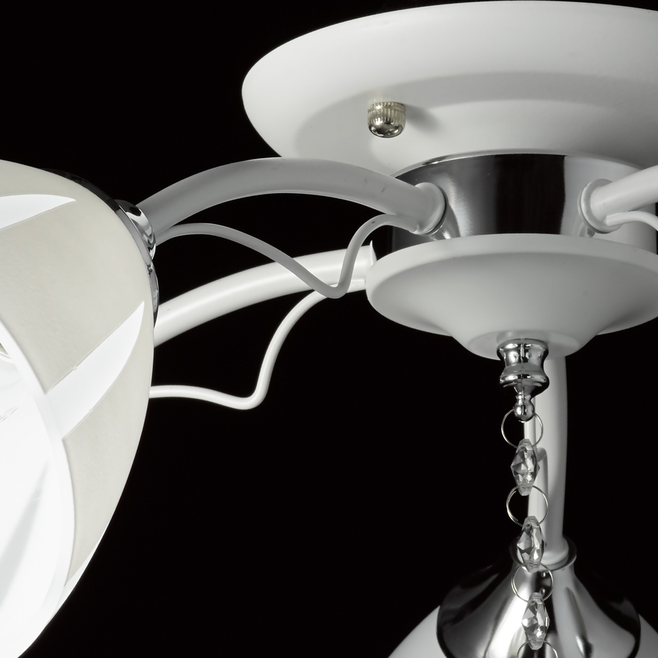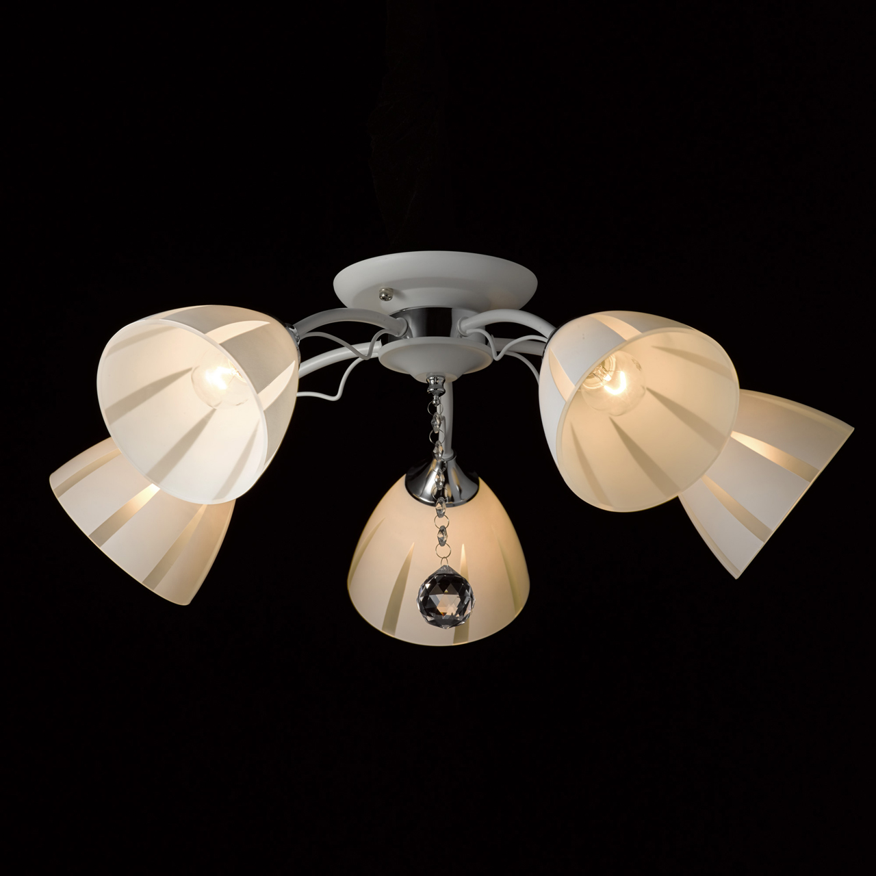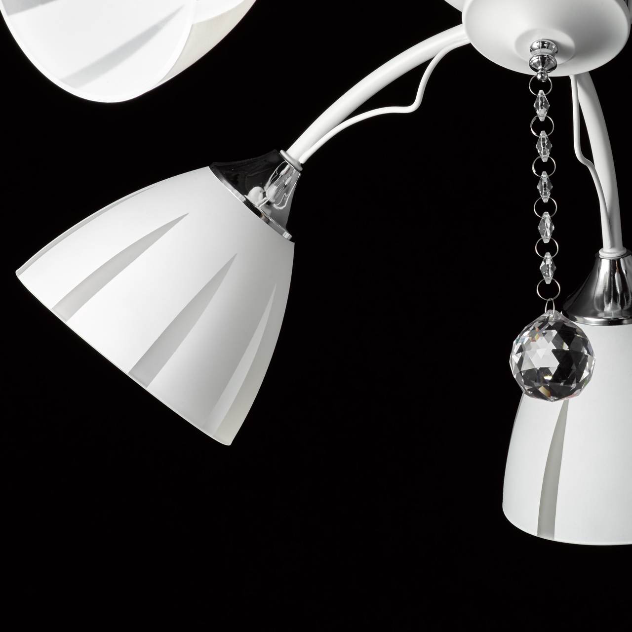 Основание светильника выполнено из металла и окрашено в белый цвет. Отдельные элементы основания гальванизированы в цвет хрома. Стеклянные матированные плафоны окрашены в белый цвет по трафарету. Светильник декорирован прозрачным хрусталем в форме шара.Тип помещения