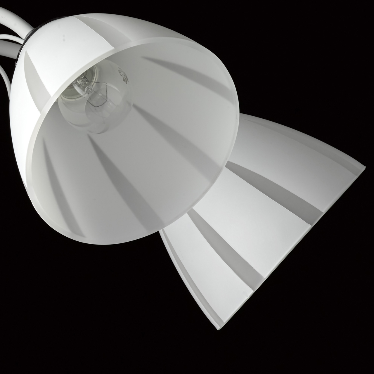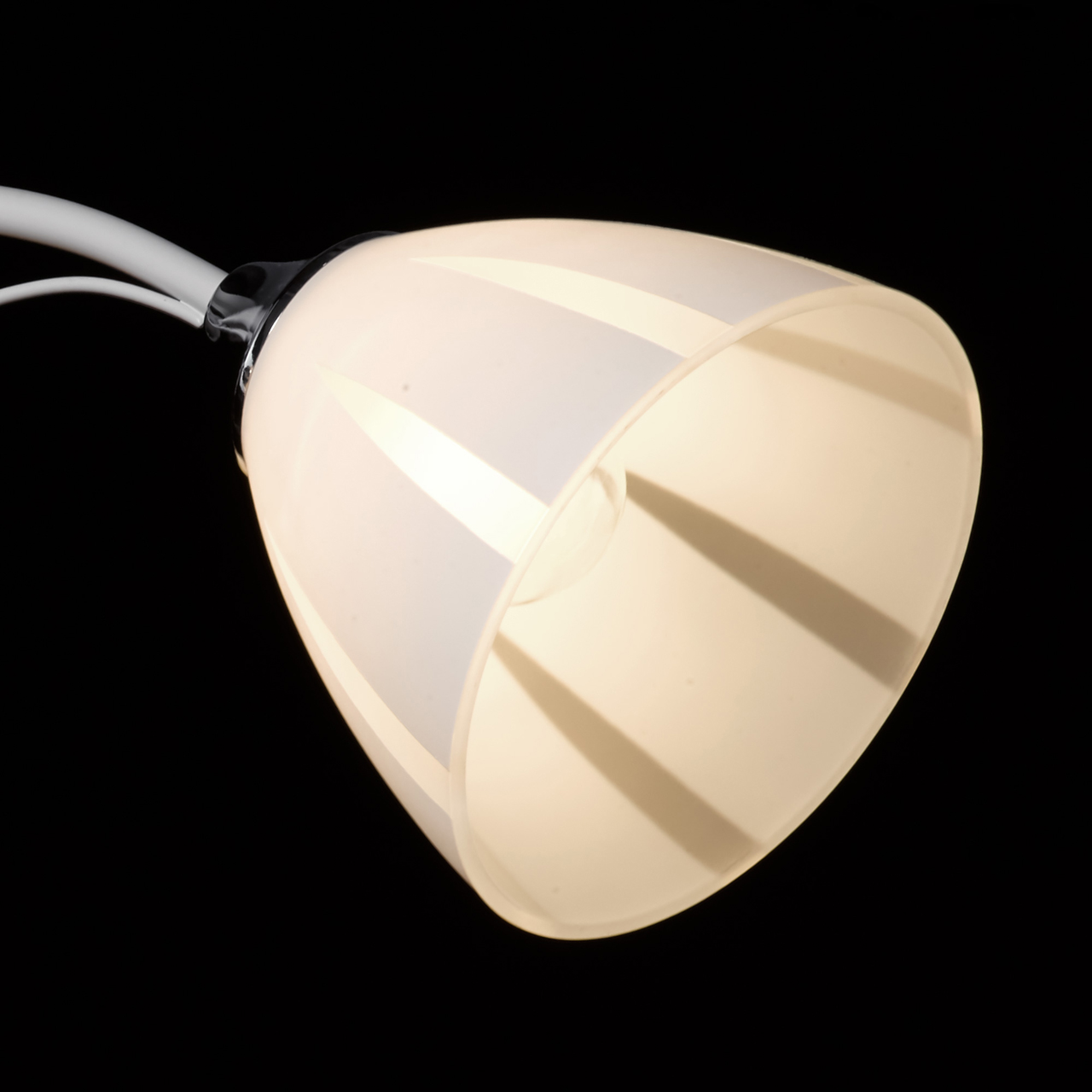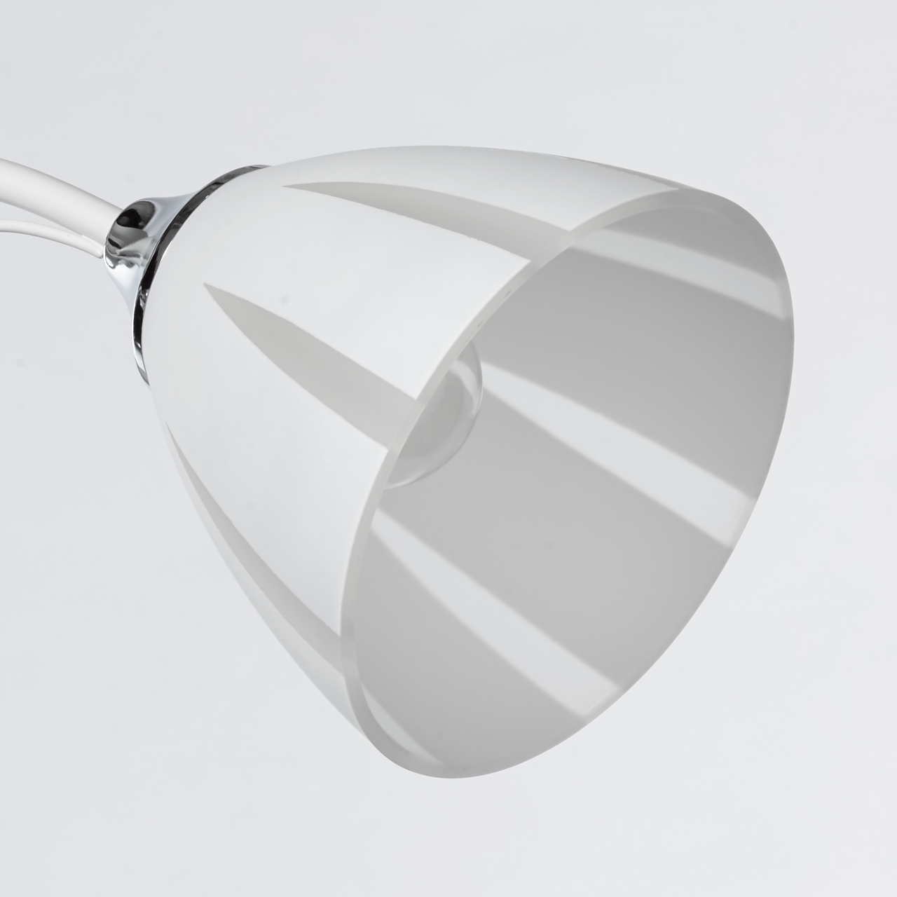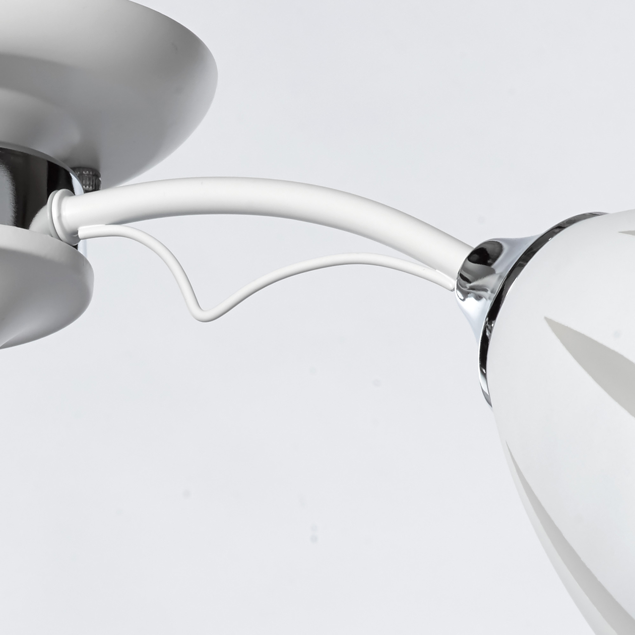 Основание светильника выполнено из металла и окрашено в белый цвет. Отдельные элементы основания гальванизированы в цвет хрома. Стеклянные матированные плафоны окрашены в белый цвет по трафарету. Светильник декорирован прозрачным хрусталем в форме шара.Тип помещения