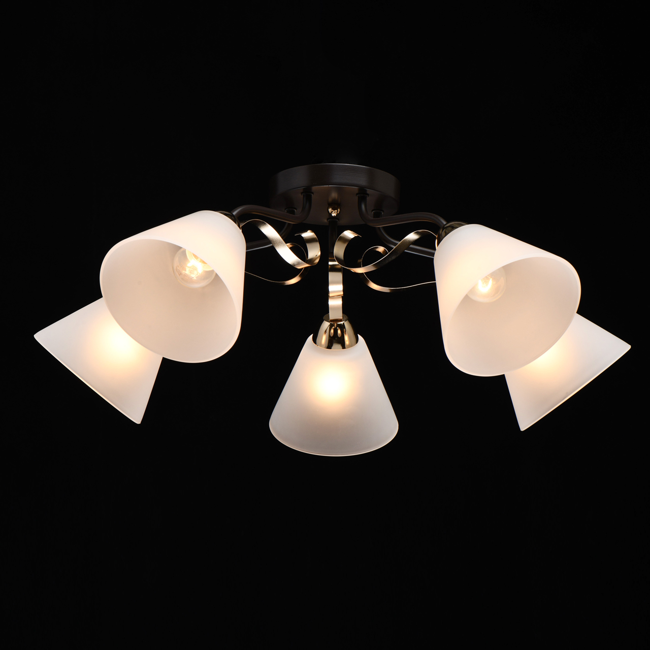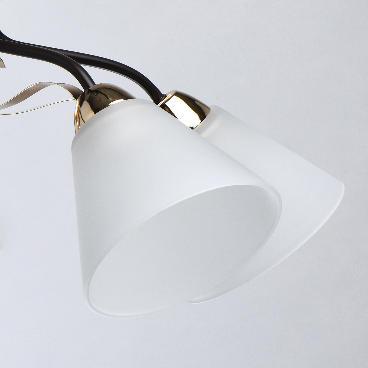 Насыщенные цвета основания светильника кофе и золотого придадут яркости интерьеру. Плафоны матового стекла обеспечивают мягкий световой поток. Компактная высота идеальна для стандартной высоты потолка. Широкий диаметр обеспечивает высокие параметры освещения. Металлический декор создает дополнительный акцент.Стилевые решения интерьера