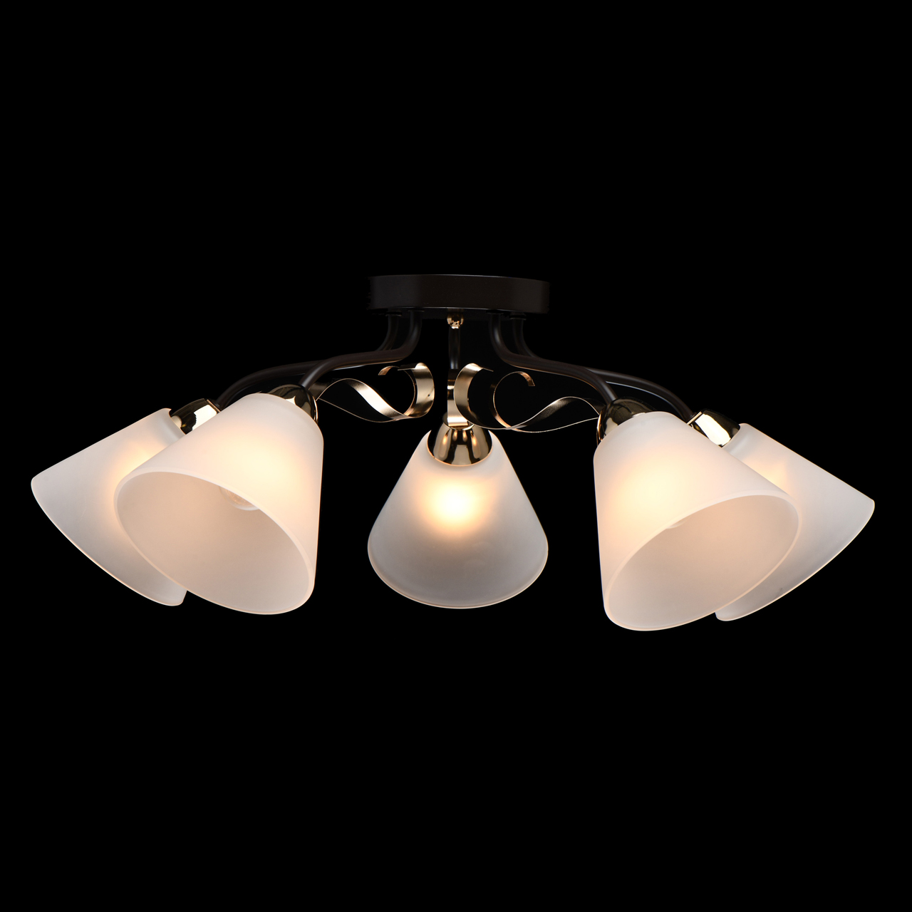 Металлическое основание светильника окрашено в черный цвет. Отдельные элементы основания гальванизированы в цвет золота. Светильник декорирован стеклянными матированными плафонами.Тип помещения