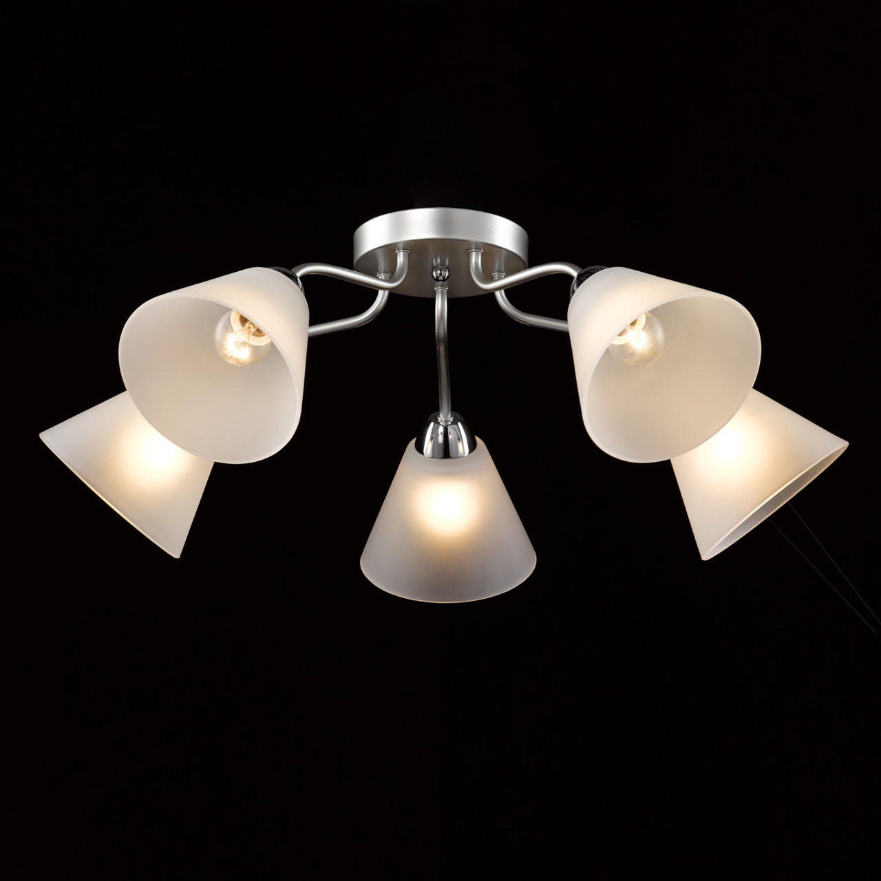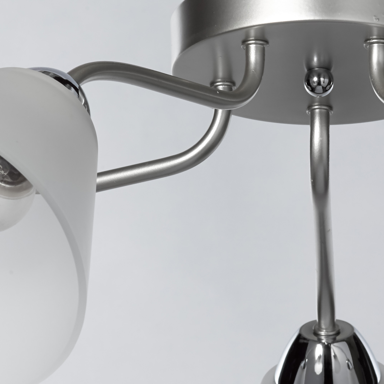 Основание светильника выполнено из металла и окрашено в цвет перламутрового серебра. Отдельные элементы основания гальванизированы в цвет хрома. Светильник декорирован стеклянными матированными плафонами.Тип помещения