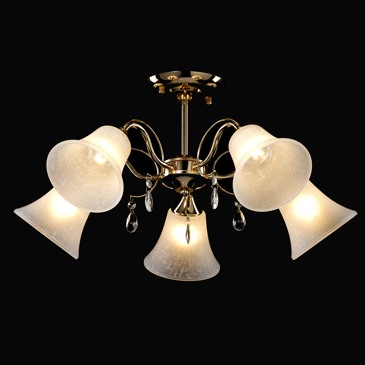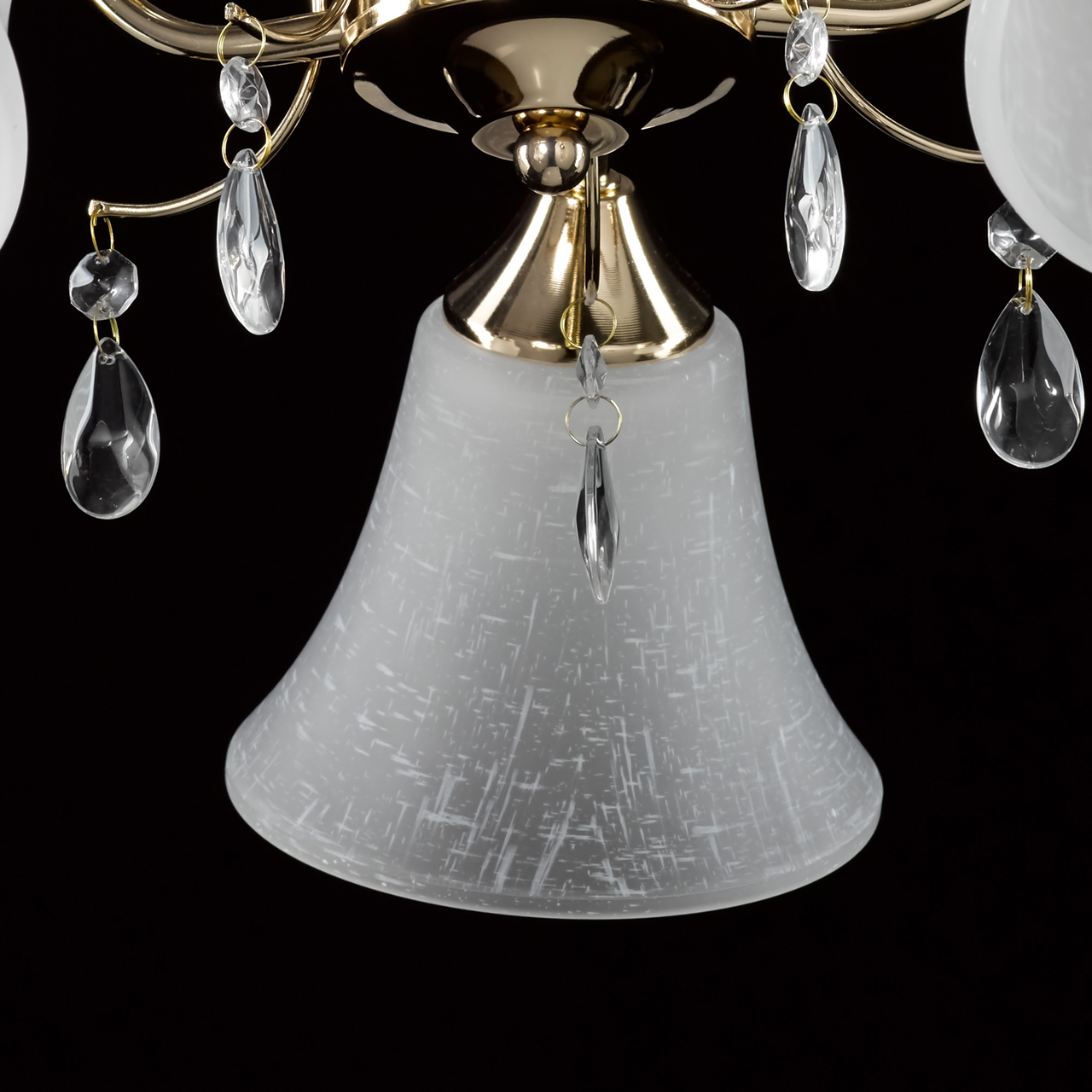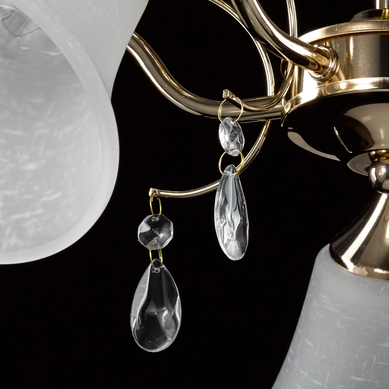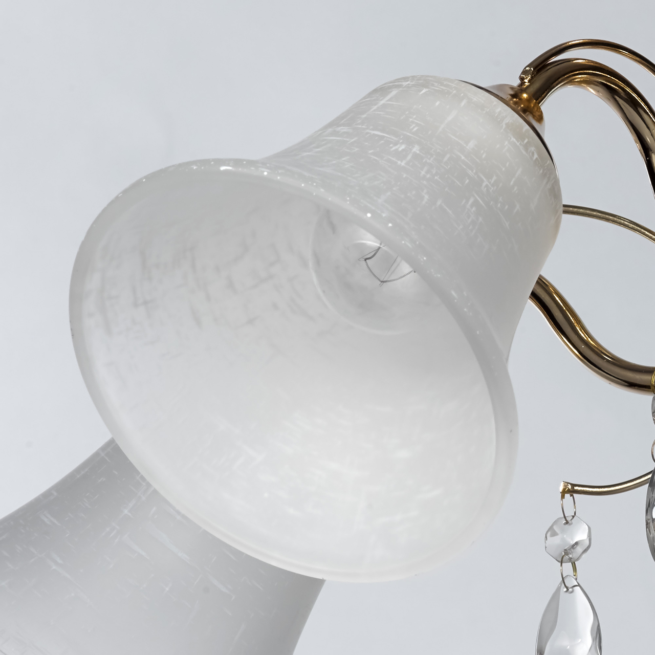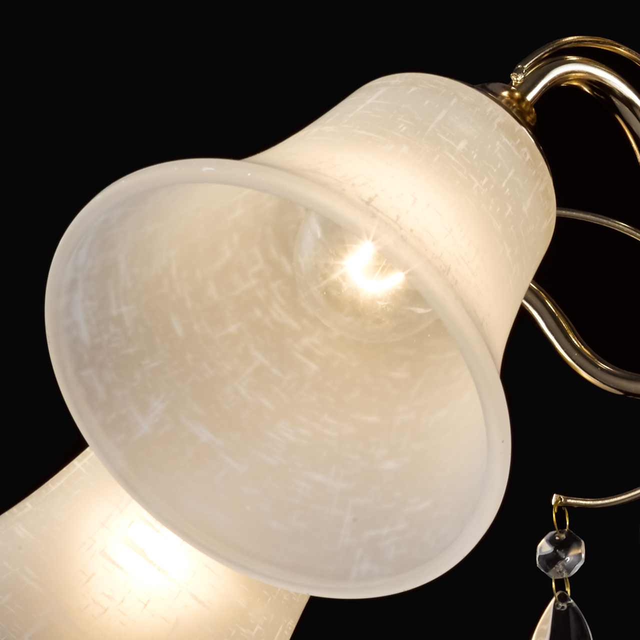 Основание светильника выполнено из металла и гальванизировано в цвет французского золота. Плафоны из алебастрового стекла отлиты в форму. Светильник декорирован подвесками из хрустального стекла.Тип помещения
