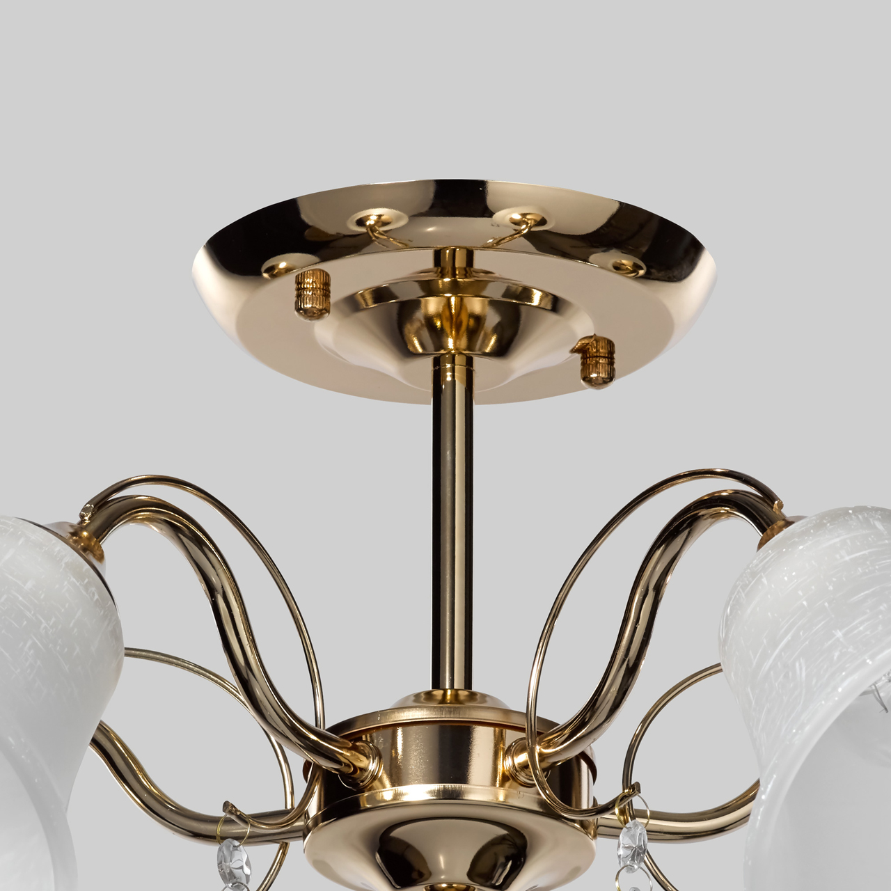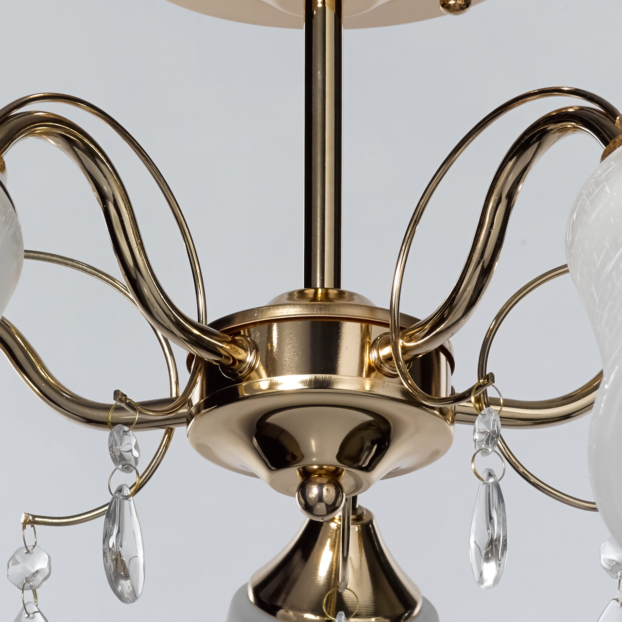 Популярный золотой цвет основания светильника. Компактная высота модели идеальна для стандартной высоты потолка. Декор рожков дополнен подвесками из хрустального стекла. Матовые плафоны из стекла мягко рассеивают свет.Преимущества модели