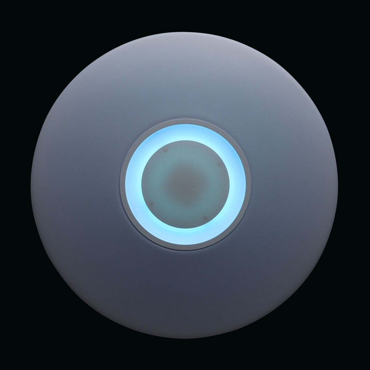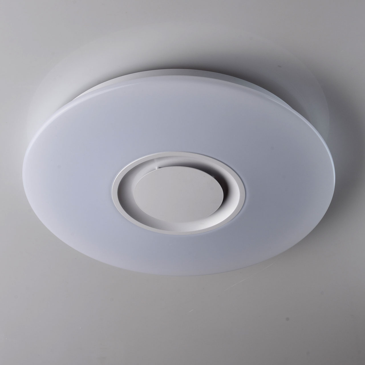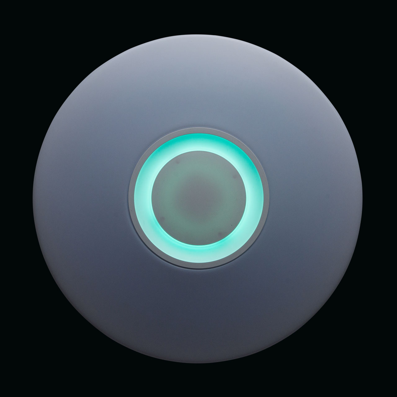 Основание светильника выполнено из стали и окрашено в белый цвет. Плафон: Источник света типа SMD Board закрыт рассеивателем из белого матового акрила. Динамик закрыт акрилом белого цвета. Управление с помощью специального мобильного приложения на смартфоне.Тип помещения