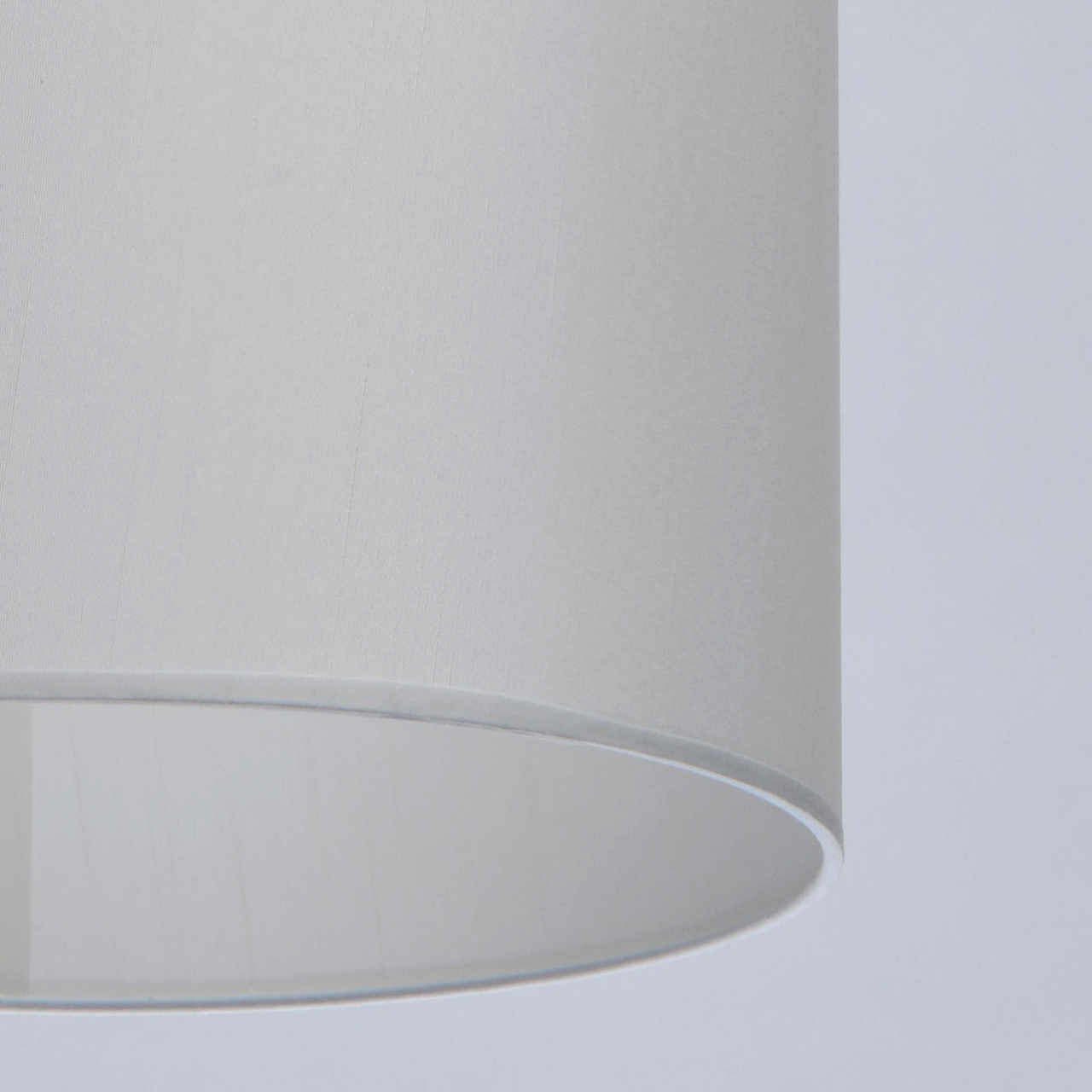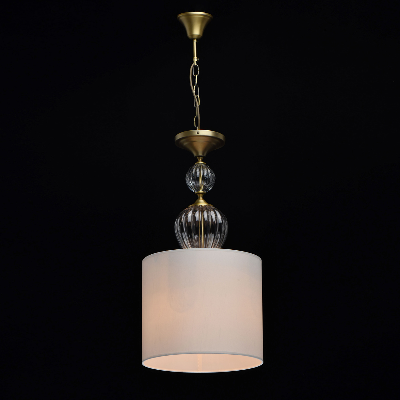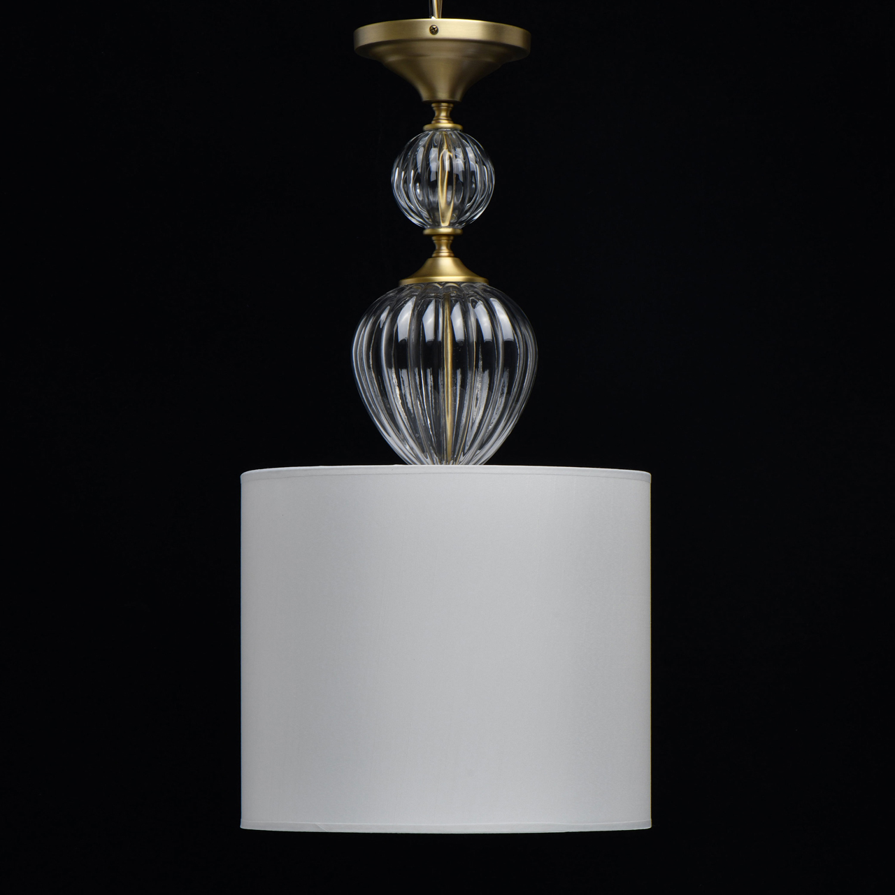Основание светильника выполнено из металла и гальванизировано в цвет латуни. Светильник декорирован выдувным стеклом ручной работы. Текстильный абажур белого цвета с термостойким акрилом внутри. Края абажура отделаны кантом, абажур прошит.Тип помещения