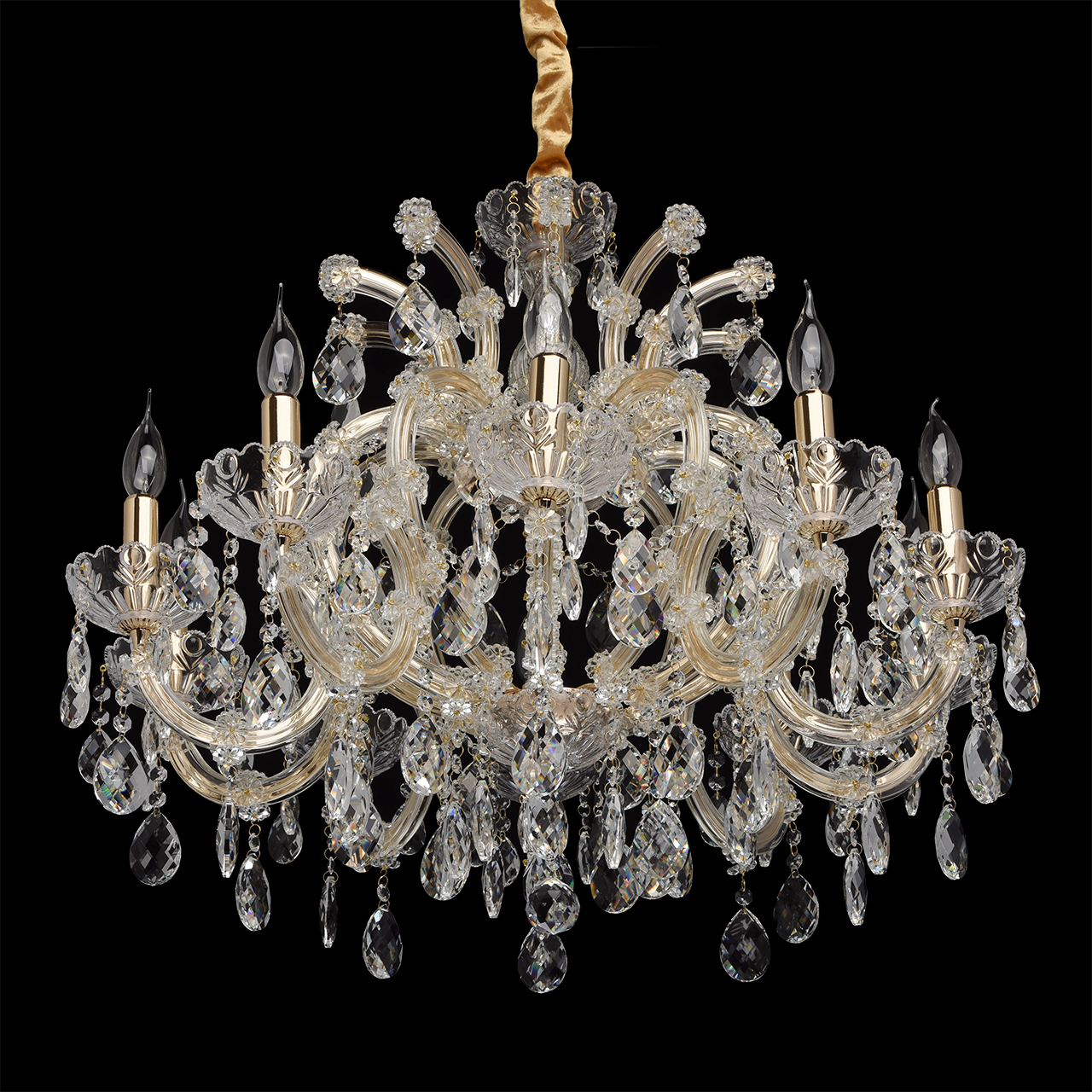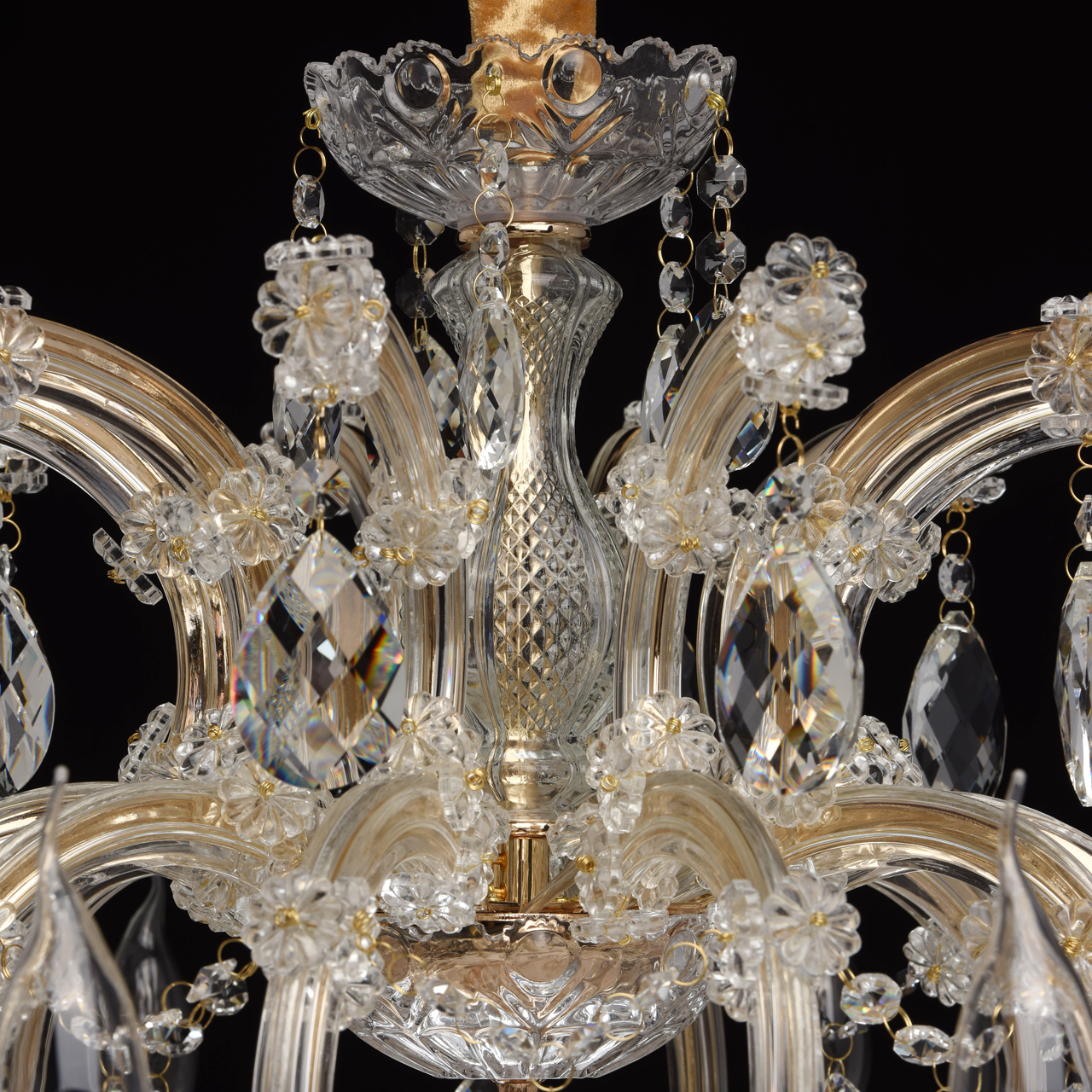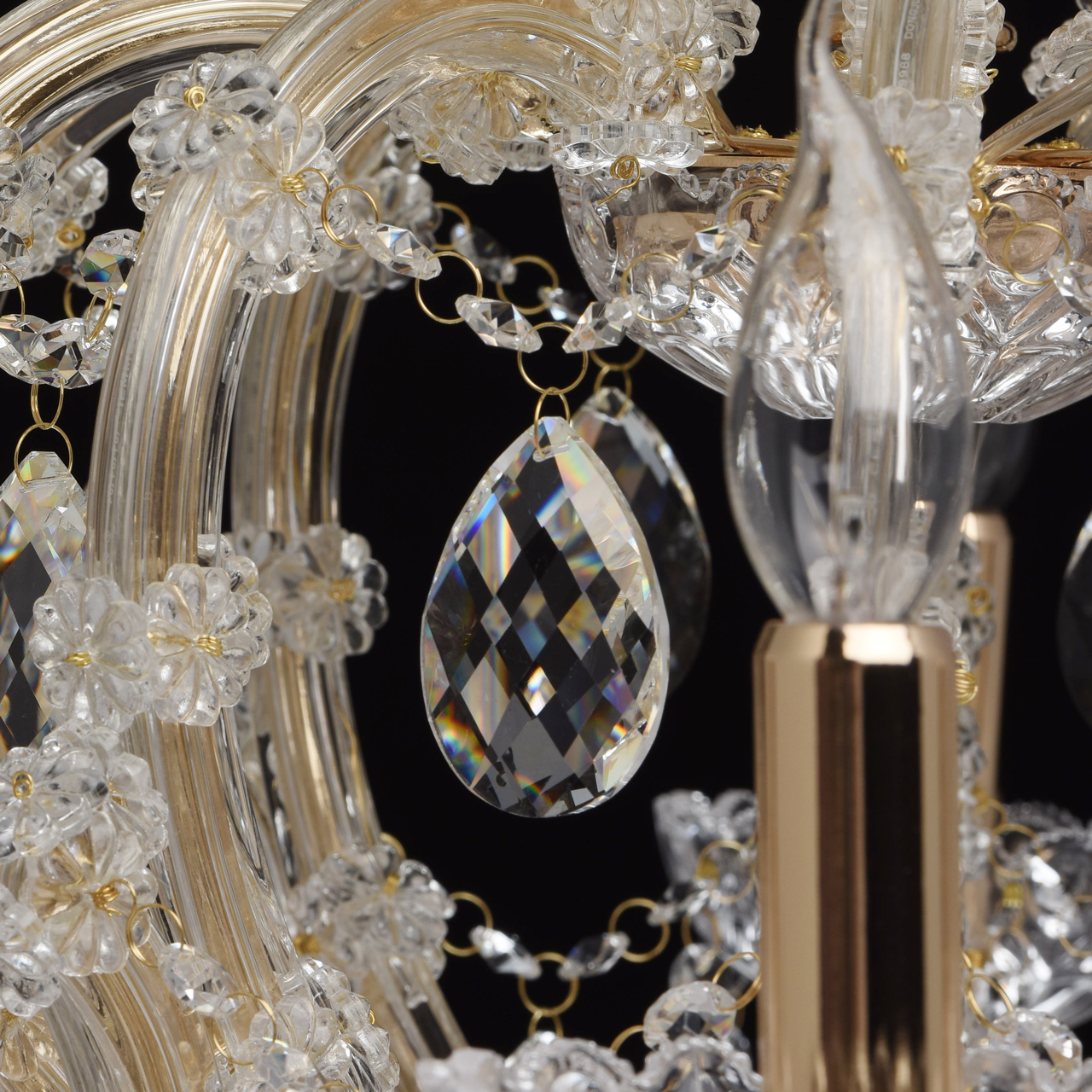 Металлическое основание цвета золота, основание из прозрачного гутного стекла, декоративные подвески из хрусталяТехнология производства