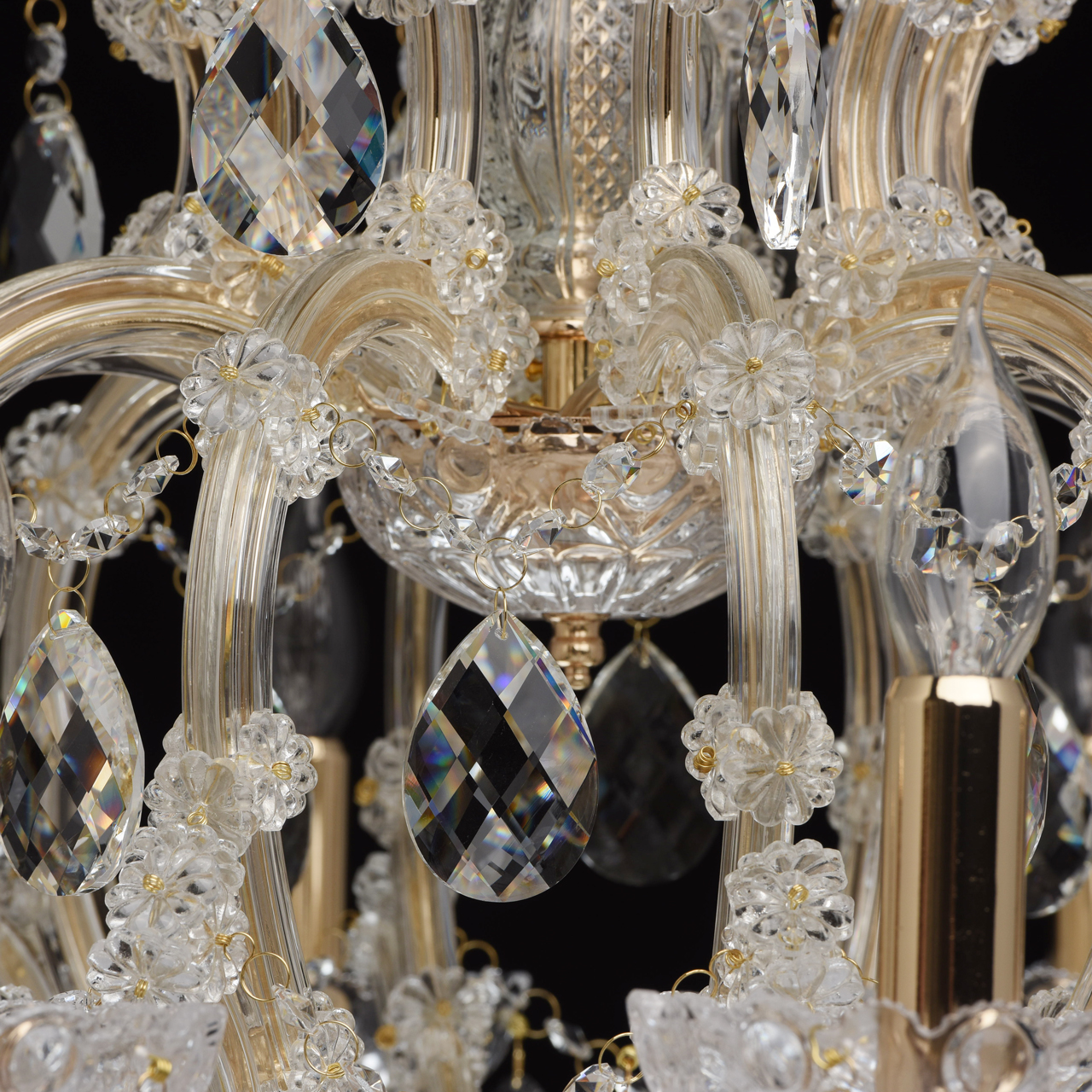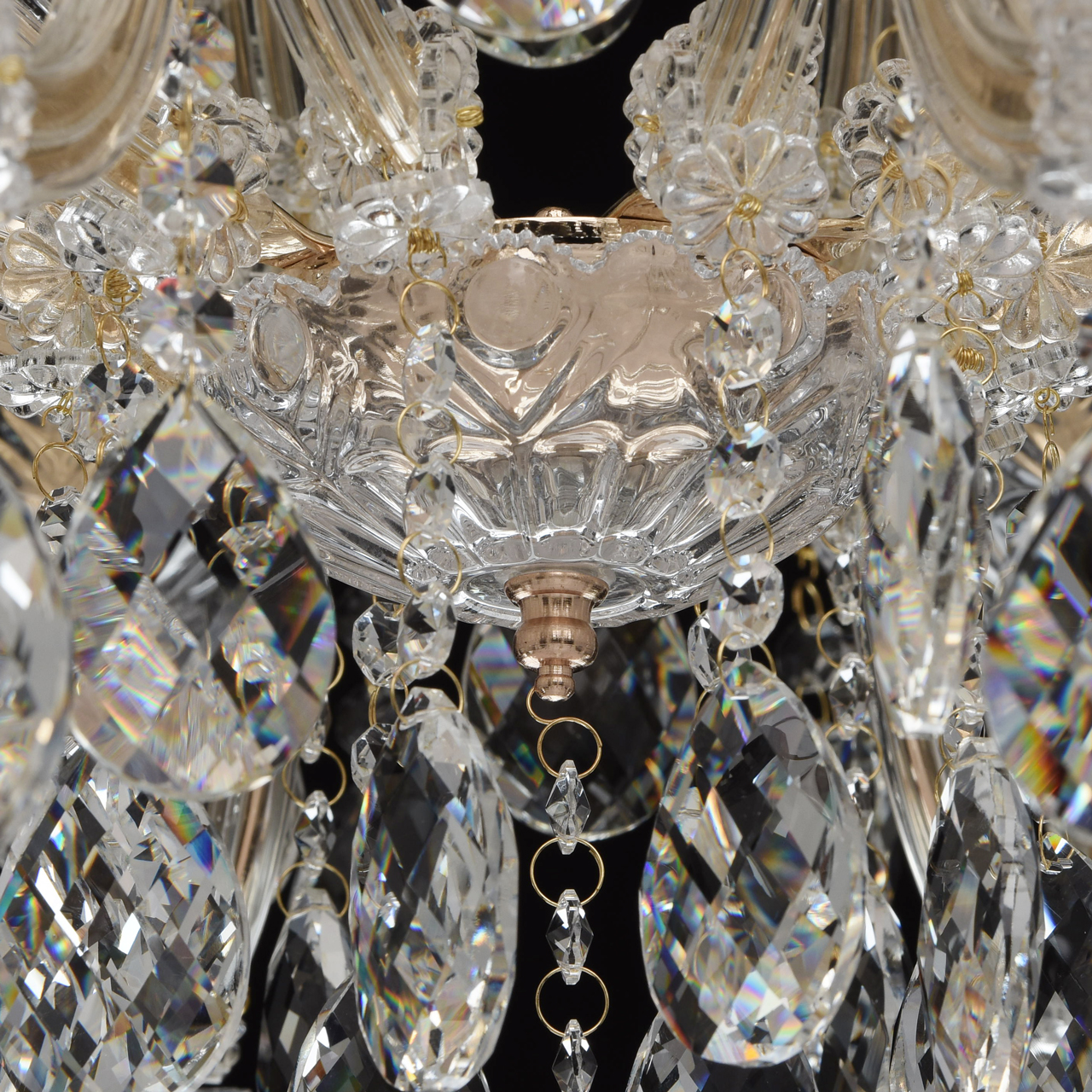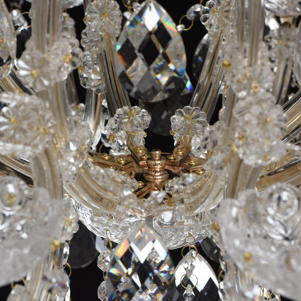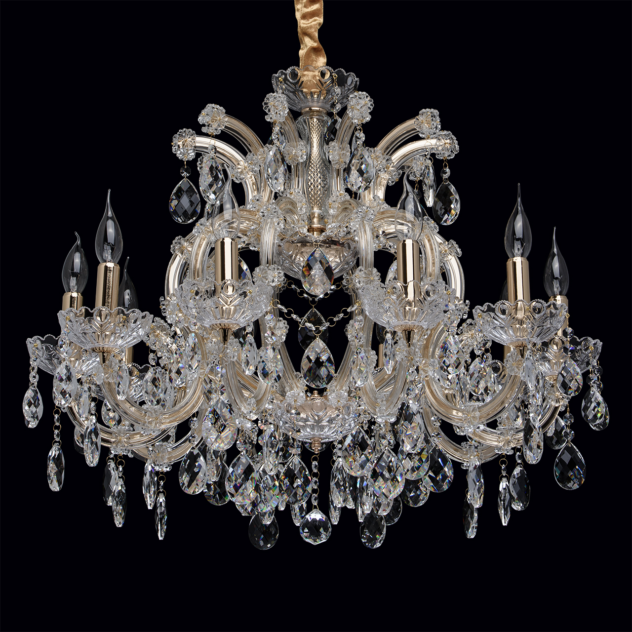 Металлическое основание цвета золота, основание из прозрачного гутного стекла, декоративные подвески из хрусталяТехнология производства